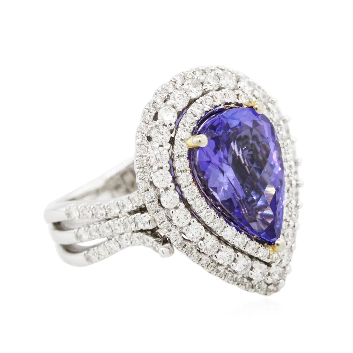 One electronically tested 14KT white gold ladies cast tanzanite & diamond pendant/ring with a bright finish. The featured tanzanite is set within tiered diamond bezels, supported by an elaborate white gold lattice under gallery and diamond set shoulders, completed by a three millimeter wide band. The gemstone section( 22 x 17mm) can be removed from the ring and be worn as a pendant. Identified with markings of "14K". Condition is new, good workmanship. Containing: One prong set pear mixed cut natural tanzanite, measuring 13.00 x 9.00 x 6.15mm, 7% bulge factor, approximate weight of 5.16ct., clarity is eye clean, type I, medium dark, very slightly grayish, violetish blue color, (GIA vB 6/3), cut is good. Transmitting light with no distortion, transparent. Colored Stone Grading Report attached. Graded in the setting. One Hundred Fifty-Four prong set round brilliant cut diamonds, measuring 1.80 - 1.00 x 0.84mm (depth est.) approximate total weight of 154 Stones = 1.54ct. Graded in the setting. Clarity: SI-2 to I-1. Color: G - I. Total Weight of Colored Stones 5.16ct. Total Weight of Diamonds 1.54ct. Total Weight of Pendant/Ring 10.74 grams. AIG Appraised at $18,300.00.