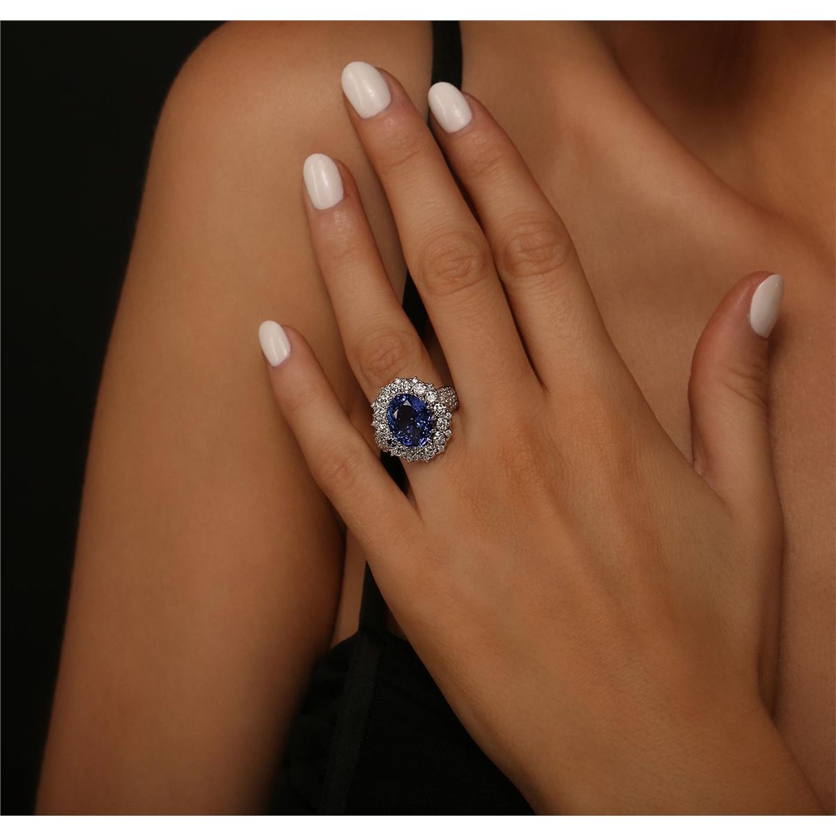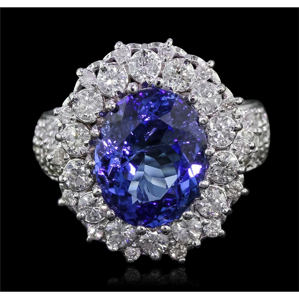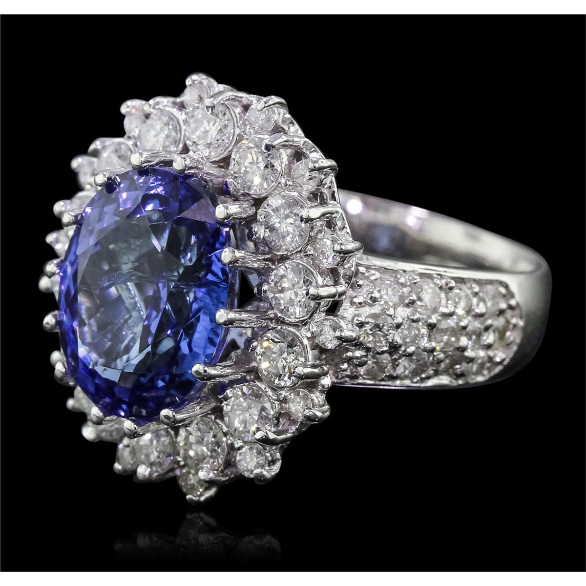 One electronically tested 14KT white gold Ladies combination cast & assembled ring with a bright polish finish. Condition is new. Identified with markings of "K14". Containing: One prong set oval modified brilliant cut natural tanzanite, measuring 12.10 x 9.70 x 6.50mm, approximate weight of 5.17ct., clarity is eye clean, type I, medium, moderately strong, bluish violet color, (GIA bV 5/4), cut is good. Colored gemstones are presumed to have been subjected to commonly used color/clarity enhancement processes. Forty-One prong set round brilliant cut diamonds, measuring 1.50 - 1.30 x 0.84mm (depth est.) approximate. Total Weight of 41 Stones = 1.20ct. Clarity: I-1 to I-2. Color: I - J, Cut is Good. Fourteen prong set round brilliant cut diamonds, measuring 2.90 - 2.90 x 1.74mm (depth est.) approximate. Total Weight of 14 Stones = 1.25ct. Clarity: I-1 to I-2. Color: H - I, Cut is Good. Total Weight of Colored Stones 5.17ct. Total Weight of Diamonds 2.45ct. Total Weight of Ring 8.60 grams. GGL Appraised at $11,550.00.