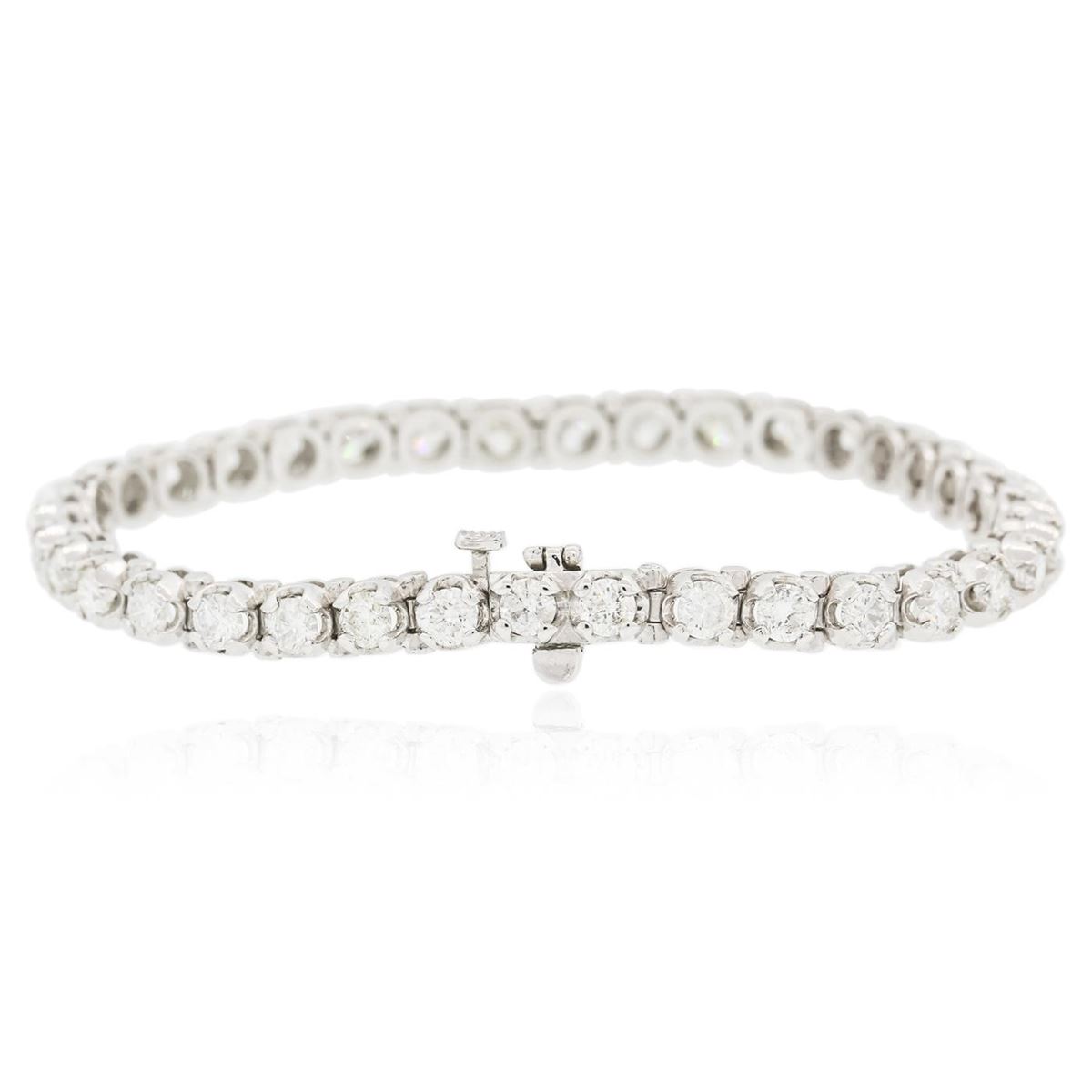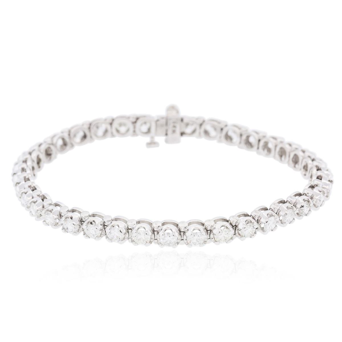 One electronically tested 14KT white gold Ladies combination cast & assembled tennis bracelet with a hidden box clasp with a bright polish finish. Condition is new. Measurements: 7" in length. Identified with markings of "14K". Containing: Thirty-Six prong set round brilliant cut diamonds, measuring 3.40 - 3.40 x 2.04mm (depth est.) approximate. Total Weight of 36 Stones = 5.18ct. Clarity: SI-2 to I-2. Color: H - I, Cut is Good. All diamonds are graded in the mounting, unless otherwise stated. Total Weight of Diamonds 5.18ct. Total Weight of Bracelet 15.00 grams. GGL Appraised at $17,270.00.