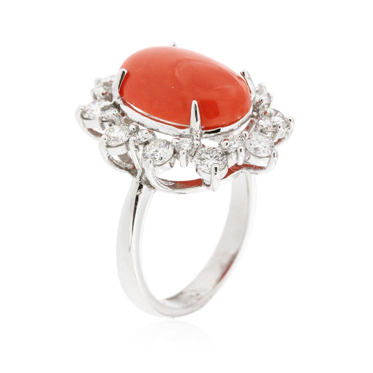 One electronically tested 14KT white gold Ladies combination cast & assembled fashion ring with a bright polish finish. Identified with markings of "14K". Condition is excellent. Containing: One prong set oval cabochon cut natural red coral, measuring 15.20 x 10.70 x 4.30mm, approximate weight of 5.19ct., clarity is severely included, medium, very slightly brownish, orangy red color, (GIA oR 5/3), cut is very good. Colored gemstones are presumed to have been subjected to commonly used and possible undetectable color/clarity enhancement processes. Ten prong set round brilliant cut diamonds, measuring 3.50 - 3.50 x 2.10mm (depth est.) approximate total weight of 10 Stones = 1.57ct. Clarity of SI-1 to SI-2, Color of H - J, Cut is Good. Ten prong set round brilliant cut diamonds, measuring 2.00 - 2.00 x 1.20mm (depth est.) approximate total weight of 10 Stones = 0.24ct. Clarity of SI-1 to I-1, Color of H - J, Cut is Good. Total Weight of Colored Stones 5.19ct. Total Weight of Diamonds 1.81ct. Total Weight of Ring 7.50gm. GGL Appraised at $8,355.00.