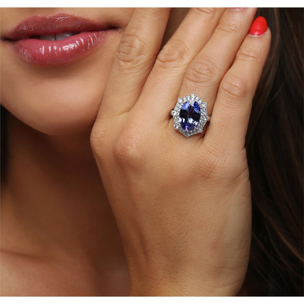 One electronically tested 14KT white gold Ladies combination cast & assembled ring with a bright polish finish. Condition is new. Identified with markings of "14K". Containing: One prong set oval modified brilliant cut natural tanzanite, measuring 14.40 x 9.70 x 5.35mm, approximate weight of 5.20ct., clarity is eye clean, type I, medium light, very slightly grayish, bluish violet color, (GIA bV 4/3), cut is good. Colored gemstones are presumed to have been subjected to commonly used color/clarity enhancement processes. Eight prong set round brilliant cut diamonds, measuring 2.50 - 2.58 x 1.52mm (depth est.) approximate. Total Weight of 8 Stones = 0.48ct. Clarity: I-1. Color: I - J, Cut is Good. Forty prong set round brilliant cut diamonds, measuring 1.50 - 1.50 x 0.90mm (depth est.) approximate. Total Weight of 40 Stones = 0.49ct. Clarity: SI-2 to I-2. Color: I - J, Cut is Good. All grading of diamonds and colored gemstones in this piece of jewelry are graded in the mounting, unless otherwise stated. Total Weight of Colored Stones 5.20ct. Total Weight of Diamonds 0.97ct. Total Weight of Ring 5.60 grams. GGL Appraised at $10,020.00.