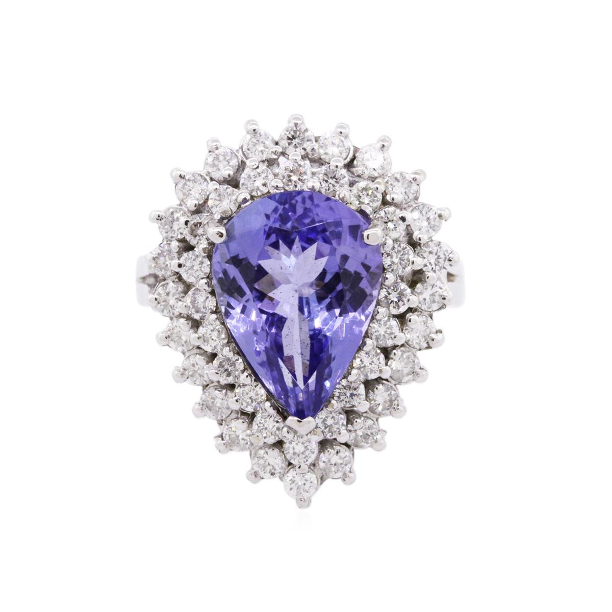 One electronically tested 14KT white gold ladies combination cast & assembled tanzanite and diamond ring with a flat shank with a bright polish finish. Identified with markings of "K14". Condition is new. Containing: One prong set pear modified brilliant cut natural tanzanite, measuring 13.00 x 9.59 x 6.23mm, approximate weight of 5.20ct., clarity is eye clean, type I, medium, very slightly grayish, violet color, (GIA V 5/3), cut is good. Forty-Four prong set round brilliant cut diamonds, measuring 2.00 - 1.80 x 1.14mm (depth est.) approximate total weight of 44 Stones = 1.10ct. Clarity: I-1 to I-2. Color: I - J, Cut is Good. Colored gemstones are presumed to have been subjected to commonly used enhancement processes. All diamonds and colored gemstones are graded in the mounting, unless otherwise stated. Total Weight of Colored Stones 5.20ct. Total Weight of Diamonds 1.10ct. Total Weight of Ring 7.20 grams. GGL Appraised at $11,000.00.