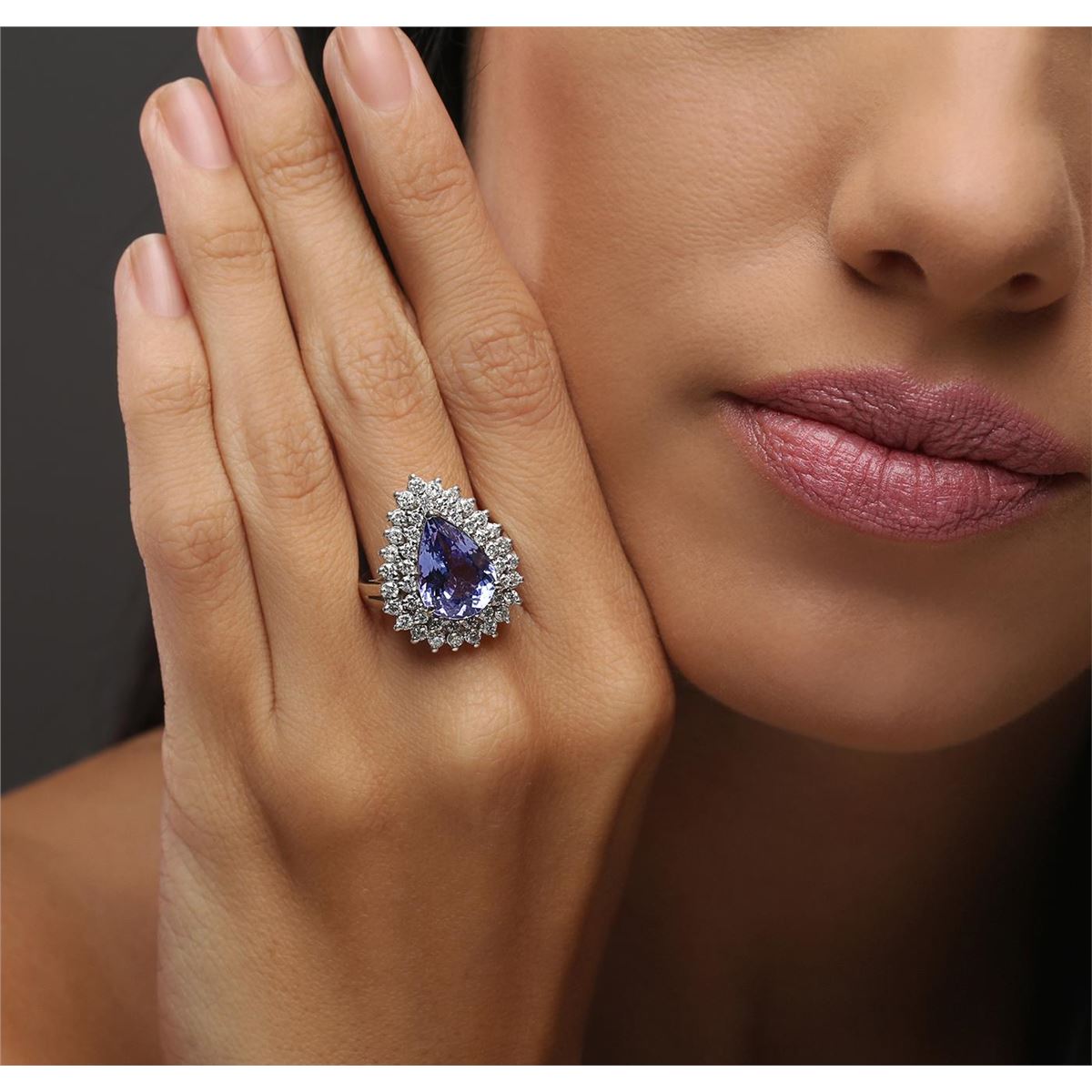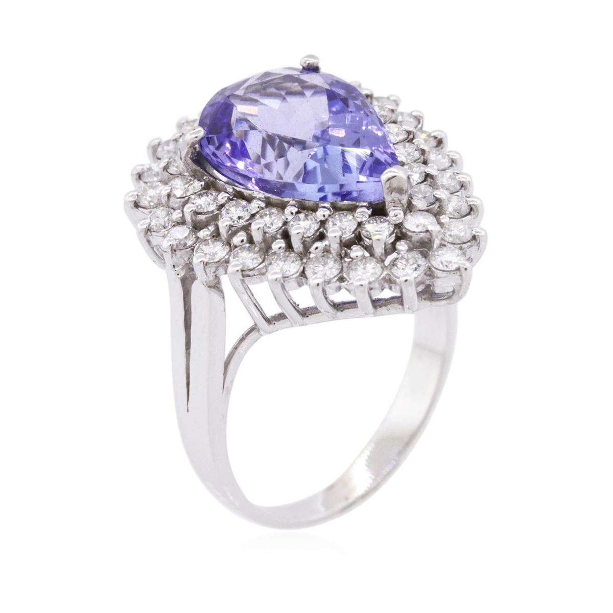 One electronically tested 14KT white gold ladies combination cast & assembled tanzanite and diamond ring with a flat shank with a bright polish finish. Identified with markings of "K14". Condition is new. Containing: One prong set pear modified brilliant cut natural tanzanite, measuring 13.00 x 9.59 x 6.23mm, approximate weight of 5.20ct., clarity is eye clean, type I, medium, very slightly grayish, violet color, (GIA V 5/3), cut is good. Forty-Four prong set round brilliant cut diamonds, measuring 2.00 - 1.80 x 1.14mm (depth est.) approximate total weight of 44 Stones = 1.10ct. Clarity: I-1 to I-2. Color: I - J, Cut is Good. Colored gemstones are presumed to have been subjected to commonly used enhancement processes. All diamonds and colored gemstones are graded in the mounting, unless otherwise stated. Total Weight of Colored Stones 5.20ct. Total Weight of Diamonds 1.10ct. Total Weight of Ring 7.20 grams. GGL Appraised at $11,000.00.