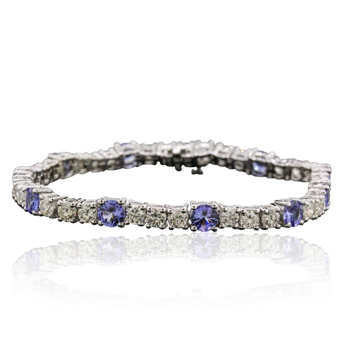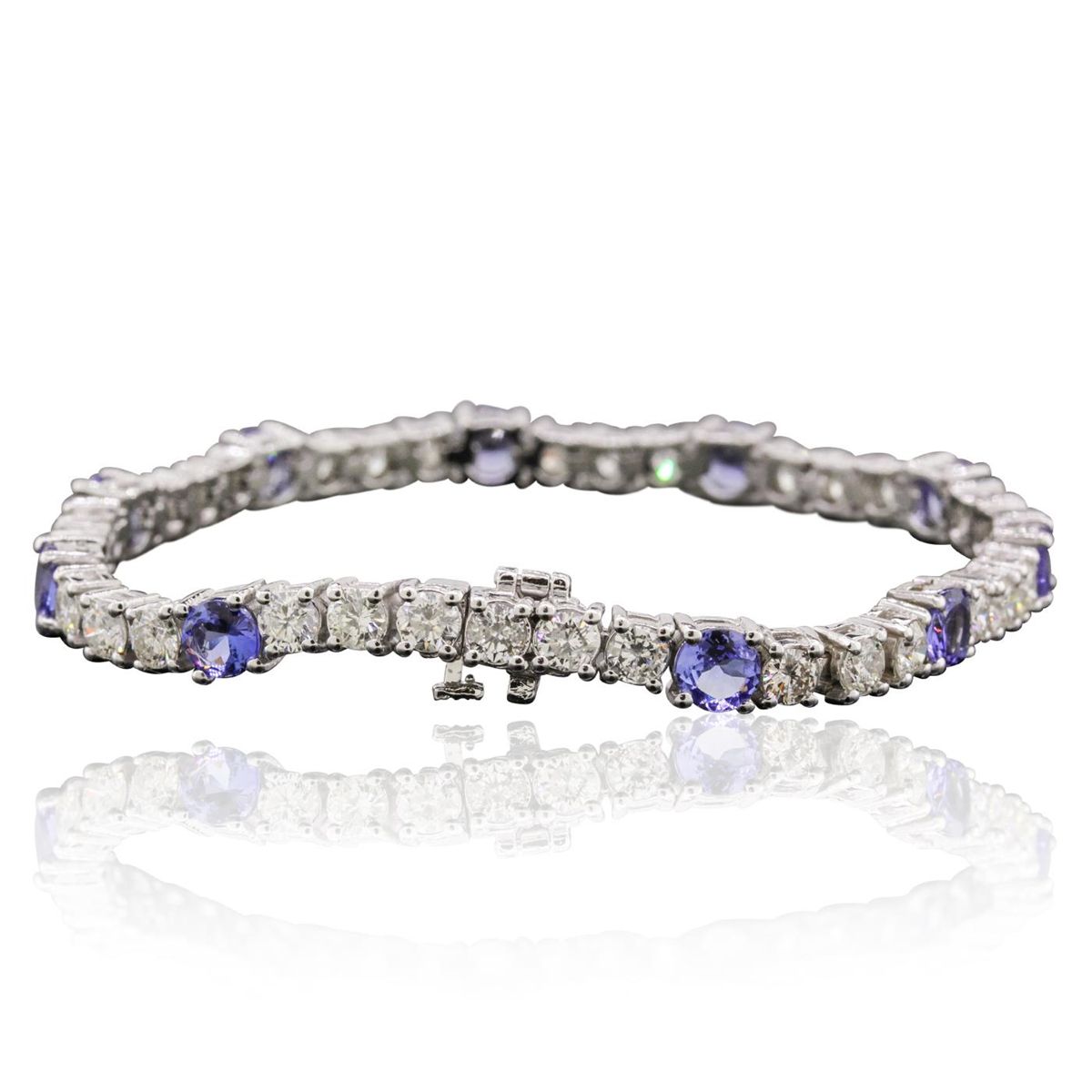 One electronically tested 14KT white gold ladies cast & assembled tanzanite and diamond bracelet with a bright polish finish. Condition is new, good workmanship. Seven and one-quarter inch length bracelet features a flexible tanzanite and diamond ribbon, terminating in a concealed clasp with safety bar. Identified with markings of "14K". Containing: Ten prong set round mixed cut natural tanzanites, measuring 5.10 - 5.00 x 2.80 mm, 6%. bulge factor, approximate. Total Weight of 5.20ct., clarity is eye clean, type I, medium dark, very slightly grayish, bluish violet color, (GIA bV 6/3), cut is good. Transmitting light with no distortion, transparent. Color grade is an average for the group. Graded in the setting. Tanzanite is a very rare gemstone that is only found in the country of Tanzania. Originally discovered in 1967. Tiffany & Company, named the stone Tanzanite. It is found in the Usumburu Mountains that border the Umba Valley of northern Tanzania. Tanzanite occurs in gray, brown, violet, blue, reddish-purple, & green. The gem is interesting because of its exceptional pleochroism. Rotated in different directions a tanzanite will exhibit multiple changes of color. Tanzanite has a low tolerance to ultrasonic cleaning, and should not be cleaned using this method. Thirty-Three prong set round brilliant cut diamonds, measuring 3.30 - 3.20 x 1.95mm (depth est.) approximate. Total Weight of 33 Stones = 4.00ct. Graded in the setting. Clarity: SI-2 to I-1. Color: H - J. Total Weight of Colored Stones 5.20ct. Total Weight of Diamonds 4.00ct. Total Weight of Bracelet 17.36 grams. AIG Appraised at $17,960.00.