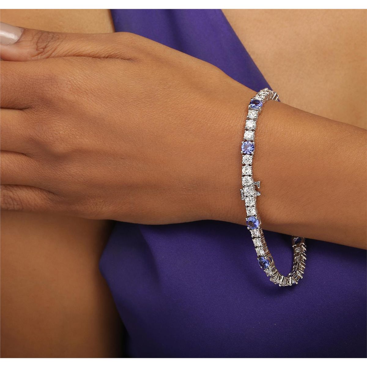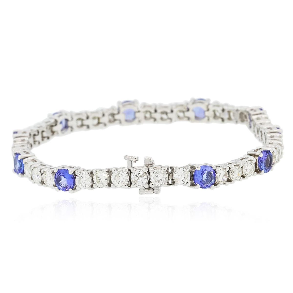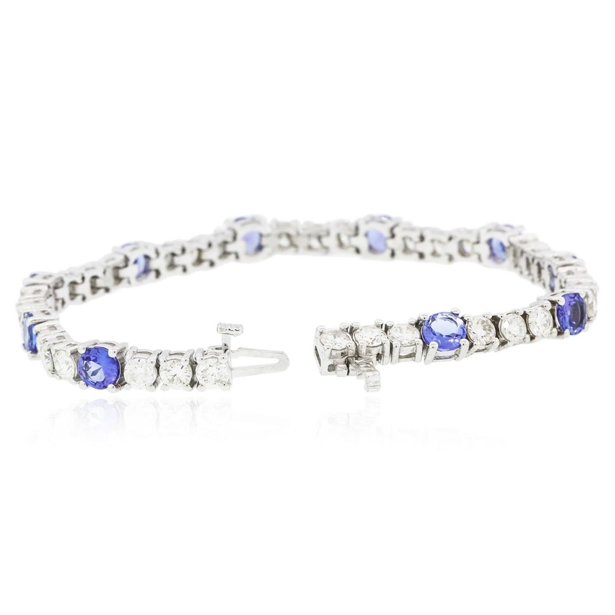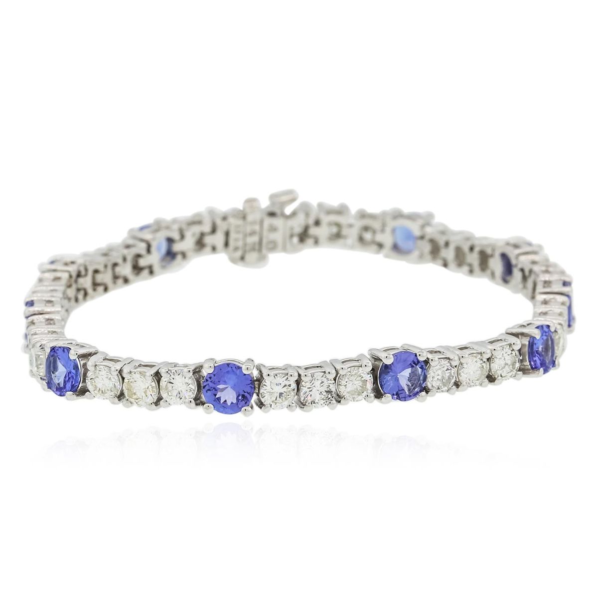 One electronically tested 14KT white gold ladies cast & assembled tanzanite and diamond bracelet with a bright polish finish. Condition is new, good workmanship. Seven and one-quarter inch length bracelet features a flexible tanzanite and diamond ribbon, terminating in a concealed clasp with safety bar. Identified with markings of "14K". Containing: Ten prong set round mixed cut natural tanzanites, measuring 5.10 - 5.00 x 2.80 mm, 6%. bulge factor, approximate. Total Weight of 5.20ct., clarity is eye clean, type I, medium dark, very slightly grayish, bluish violet color, (GIA bV 6/3), cut is good. Transmitting light with no distortion, transparent. Color grade is an average for the group. Graded in the setting. Tanzanite is a very rare gemstone that is only found in the country of Tanzania. Originally discovered in 1967. Tiffany & Company, named the stone Tanzanite. It is found in the Usumburu Mountains that border the Umba Valley of northern Tanzania. Tanzanite occurs in gray, brown, violet, blue, reddish-purple, & green. The gem is interesting because of its exceptional pleochroism. Rotated in different directions a tanzanite will exhibit multiple changes of color. Tanzanite has a low tolerance to ultrasonic cleaning, and should not be cleaned using this method. Thirty-Three prong set round brilliant cut diamonds, measuring 3.30 - 3.20 x 1.95mm (depth est.) approximate. Total Weight of 33 Stones = 4.00ct. Graded in the setting. Clarity: SI-2 to I-1. Color: H - J. Total Weight of Colored Stones 5.20ct. Total Weight of Diamonds 4.00ct. Total Weight of Bracelet 17.36 grams. AIG Appraised at $17,960.00.