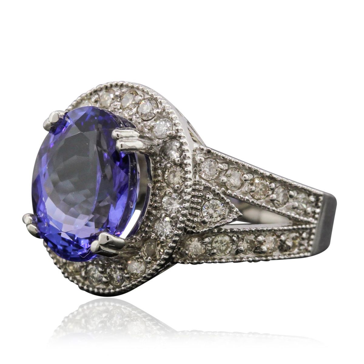 One electronically tested 14KT white gold Ladies combination cast & assembled ring with a bright polish finish. Condition is new. Identified with markings of "K14". Containing: One prong set oval modified brilliant cut natural tanzanite, measuring 12.51 x 9.79 x 6.26mm, approximate weight of 5.21ct., clarity is eye clean, type I, medium, moderately strong, bluish violet color, (GIA bV 5/4), cut is very good. Colored gemstones are presumed to have been subjected to commonly used color/clarity enhancement processes. Forty-Three prong set round brilliant cut diamonds, measuring 1.80 - 1.80 x 1.08mm (depth est.) approximate. Total Weight of 43 Stones = 0.92ct. Clarity: SI-2 to I-1. Color: I - J, Cut is Good. Total Weight of Colored Stones 5.21ct. Total Weight of Diamonds 0.92ct. Total Weight of Ring 9.50 grams. GGL Appraised at $9,545.00.