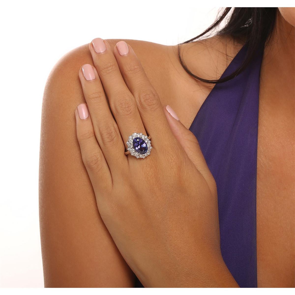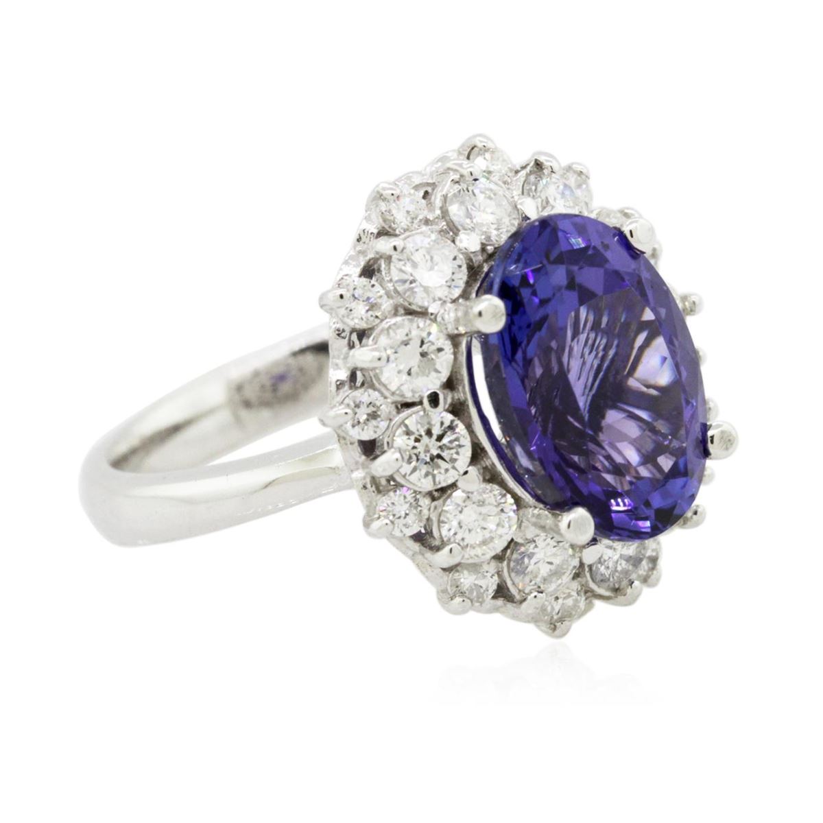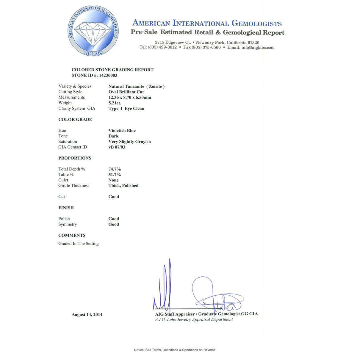One electronically tested 14KT white gold ladies cast tanzanite and diamond ring with a bright polish finish. Condition is new, good workmanship. The featured tanzanite is set within two tiered diamond bezels, completed by a two and one-half millimeter wide band. Identified with markings of "K14". Containing: One prong set oval brilliant cut natural tanzanite, measuring 12.35 x 8.70 x 6.50mm, 8%. bulge factor, approximate weight of 5.21ct., clarity is eye clean, type I, dark, very slightly grayish, violetish blue color, (GIA vB 7/3), cut is good. Transmitting light with no distortion, transparent. Colored Stone Grading Report attached. Graded in the setting.Tanzanite is a very rare gemstone that is only found in the country of Tanzania. Originally discovered in 1967. Tiffany & Company, named the stone Tanzanite. It is found in the Usumburu Mountains that border the Umba Valley of northern Tanzania. Tanzanite occurs in gray, brown, violet, blue, reddish-purple, & green. The gem is interesting because of its exceptional pleochroism. Rotated in different directions a tanzanite will exhibit multiple changes of color. Tanzanite has a low tolerance to ultrasonic cleaning, and should not be cleaned using this method.Twelve prong set round brilliant cut diamonds, measuring 2.90 - 2.80 x 1.71mm (depth est.) approximate. Total Weight of 12 Stones = 1.11ct. Graded in the setting. Clarity: SI-2 to I-1. Color: G - I Twelve prong set round brilliant cut diamonds, measuring 1.90 - 1.80 x 1.11mm (depth est.) approximate. Total Weight of 12 Stones = 0.37ct. Graded in the setting. Clarity: SI-1 to I-1. Color: G - I. Total Weight of Colored Stones 5.21ct. Total Weight of Diamonds 1.48ct. Total Weight of Ring 7.32gm. AIG Appraised at $18,565.00.