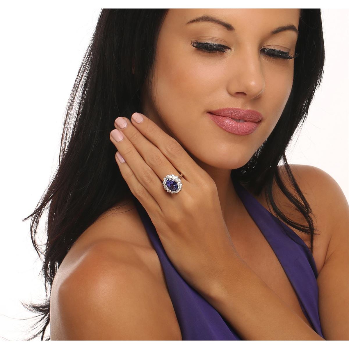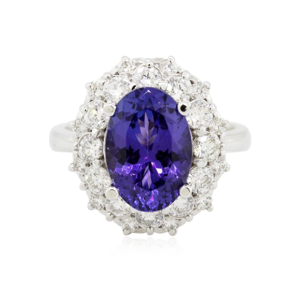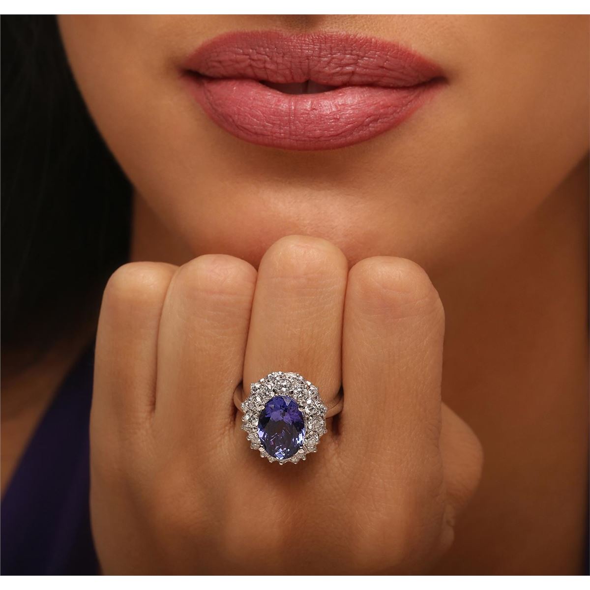 One electronically tested 14KT white gold ladies cast tanzanite and diamond ring with a bright polish finish. Condition is new, good workmanship. The featured tanzanite is set within two tiered diamond bezels, completed by a two and one-half millimeter wide band. Identified with markings of "K14". Containing: One prong set oval brilliant cut natural tanzanite, measuring 12.35 x 8.70 x 6.50mm, 8%. bulge factor, approximate weight of 5.21ct., clarity is eye clean, type I, dark, very slightly grayish, violetish blue color, (GIA vB 7/3), cut is good. Transmitting light with no distortion, transparent. Colored Stone Grading Report attached. Graded in the setting.Tanzanite is a very rare gemstone that is only found in the country of Tanzania. Originally discovered in 1967. Tiffany & Company, named the stone Tanzanite. It is found in the Usumburu Mountains that border the Umba Valley of northern Tanzania. Tanzanite occurs in gray, brown, violet, blue, reddish-purple, & green. The gem is interesting because of its exceptional pleochroism. Rotated in different directions a tanzanite will exhibit multiple changes of color. Tanzanite has a low tolerance to ultrasonic cleaning, and should not be cleaned using this method.Twelve prong set round brilliant cut diamonds, measuring 2.90 - 2.80 x 1.71mm (depth est.) approximate. Total Weight of 12 Stones = 1.11ct. Graded in the setting. Clarity: SI-2 to I-1. Color: G - I Twelve prong set round brilliant cut diamonds, measuring 1.90 - 1.80 x 1.11mm (depth est.) approximate. Total Weight of 12 Stones = 0.37ct. Graded in the setting. Clarity: SI-1 to I-1. Color: G - I. Total Weight of Colored Stones 5.21ct. Total Weight of Diamonds 1.48ct. Total Weight of Ring 7.32gm. AIG Appraised at $18,565.00.