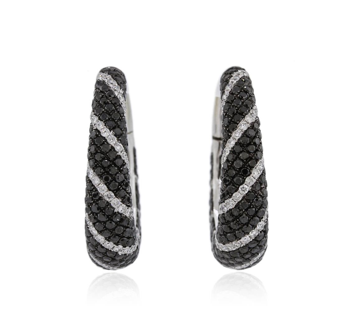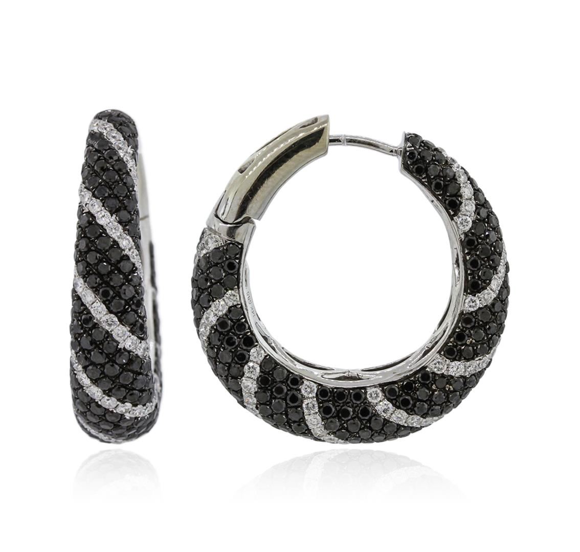 One pair electronically tested 14KT white gold ladies cast diamond hoop earrings with hinged clip backs with a bright polish finish. Identified with markings of "14K". Condition is new. Containing: One Hundred Seventy-Four prong set round brilliant cut diamonds, measuring 1.20 - 1.20 x 0.72mm (depth est.) approximate total weight of 174 Stones = 1.10ct. Clarity: SI-2 to I-1. Color: G - H, Cut is Good. Five Hundred Sixteen prong set round brilliant cut diamonds, measuring 1.30 - 1.30 x 0.78mm (depth est.) approximate total weight of 516 Stones = 4.13ct. color of Fancy Black, Cut is Good. All diamonds are graded in the mounting, unless otherwise stated. Total Weight of Diamonds 5.22ct. Total Weight of Hoop Earrings 11.70 grams. GGL Appraised at $7,845.00.