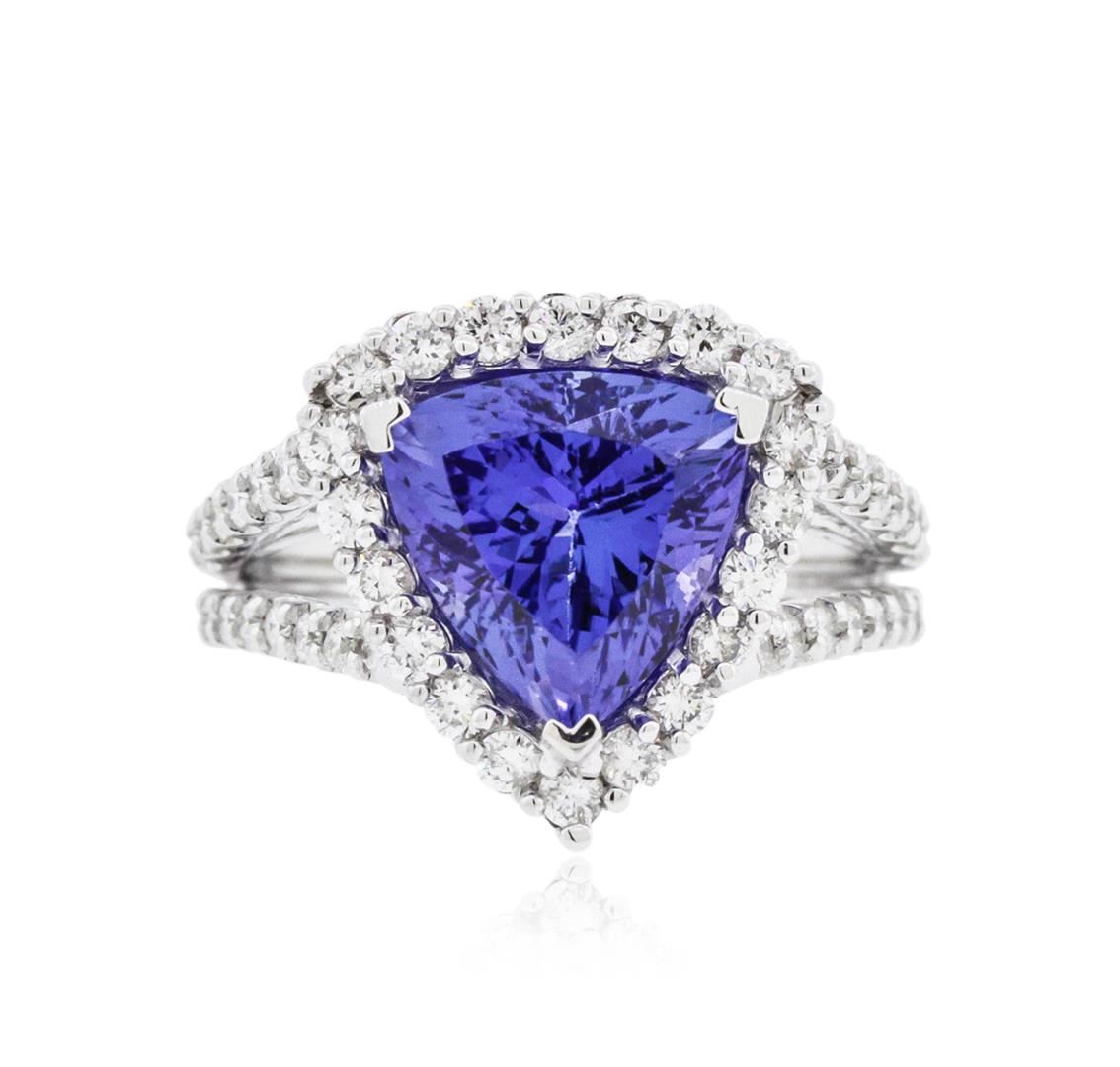 One electronically tested 14KT white gold ladies cast tanzanite and diamond ring with a bright polish finish. Identified with markings of "14K". Condition is new. Containing: One prong set triangle modified mixed cut natural tanzanite, measuring 11.00 x 11.00 x 7.16mm, approximate weight of 5.22ct., clarity is eye clean, type I, medium, moderately strong, bluish violet color, (GIA bV 5/4), cut is good. Fifty-Five prong set round brilliant cut diamonds, measuring 1.80 - 1.30 x 0.93mm (depth est.) approximate total weight of 55 Stones = 0.75ct. Clarity: SI-1 to I-1. Color: I - J, Cut is Good. Colored gemstones are presumed to have been subjected to commonly used enhancement processes. All diamonds and colored gemstones are graded in the mounting, unless otherwise stated. Total Weight of Colored Stones 5.22ct. Total Weight of Diamonds 0.75ct. Total Weight of Ring 6.10 grams. GGL Appraised at $5,995.00.