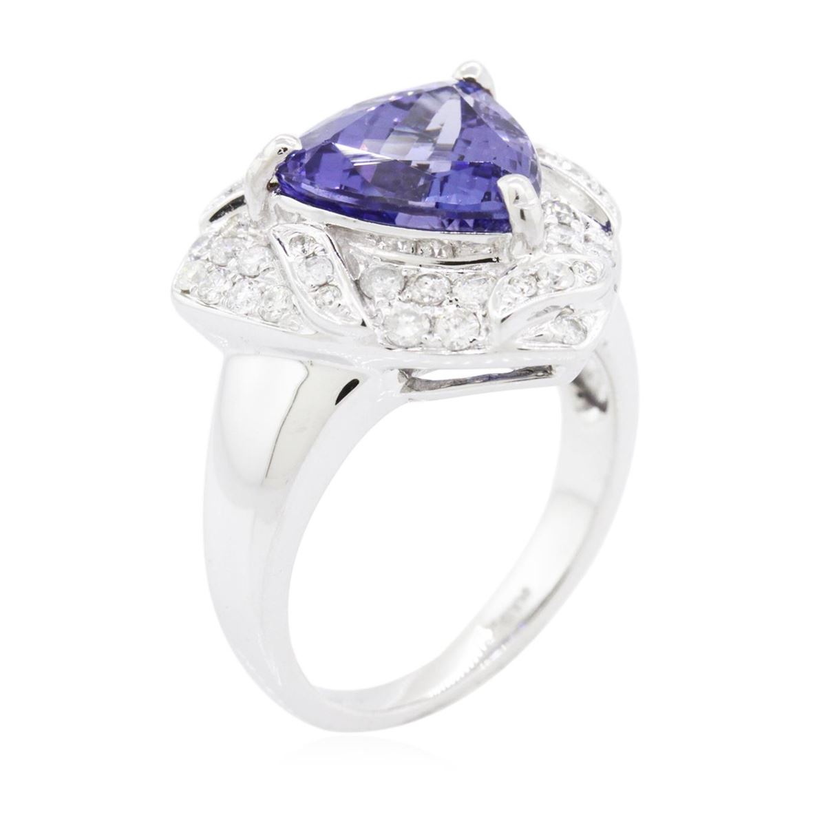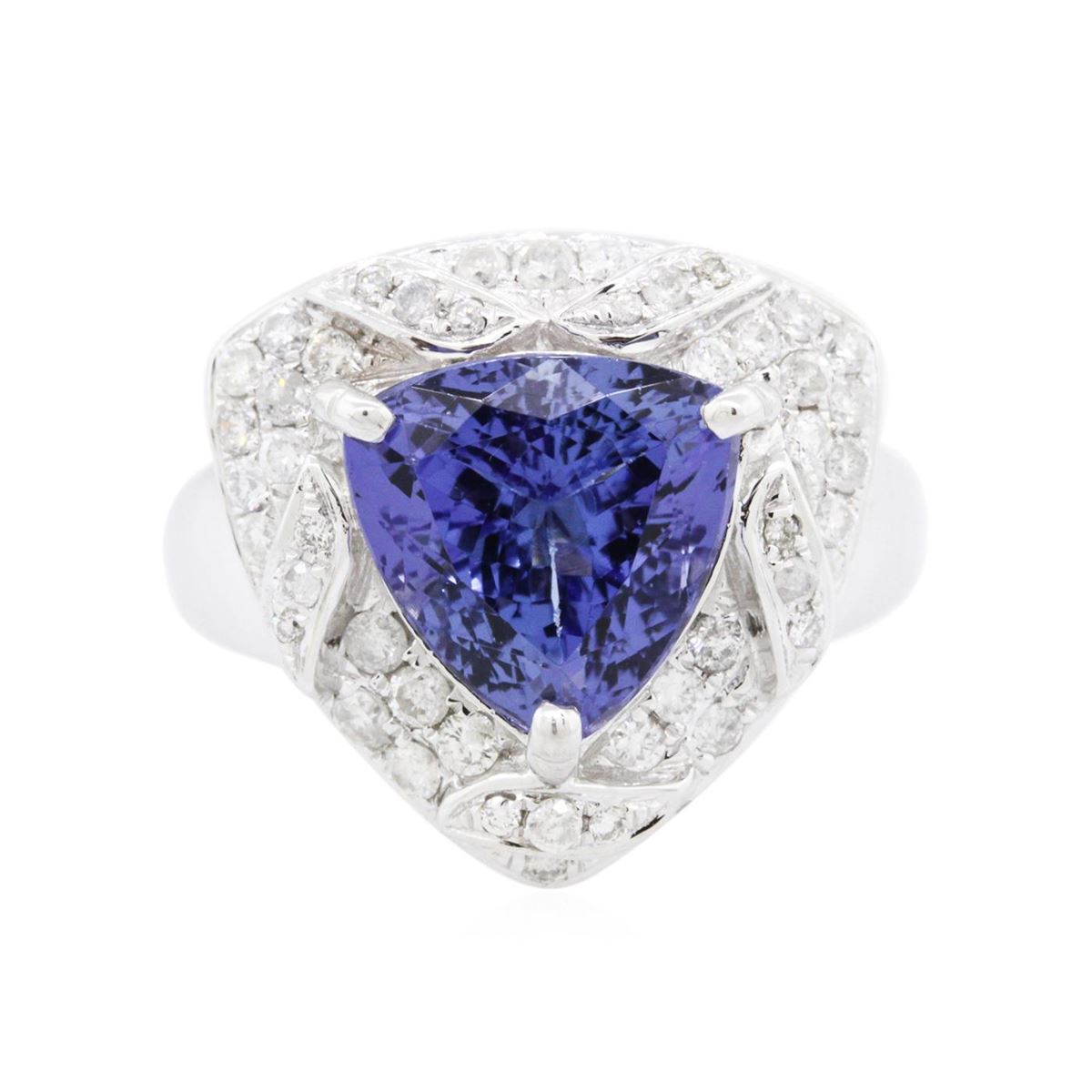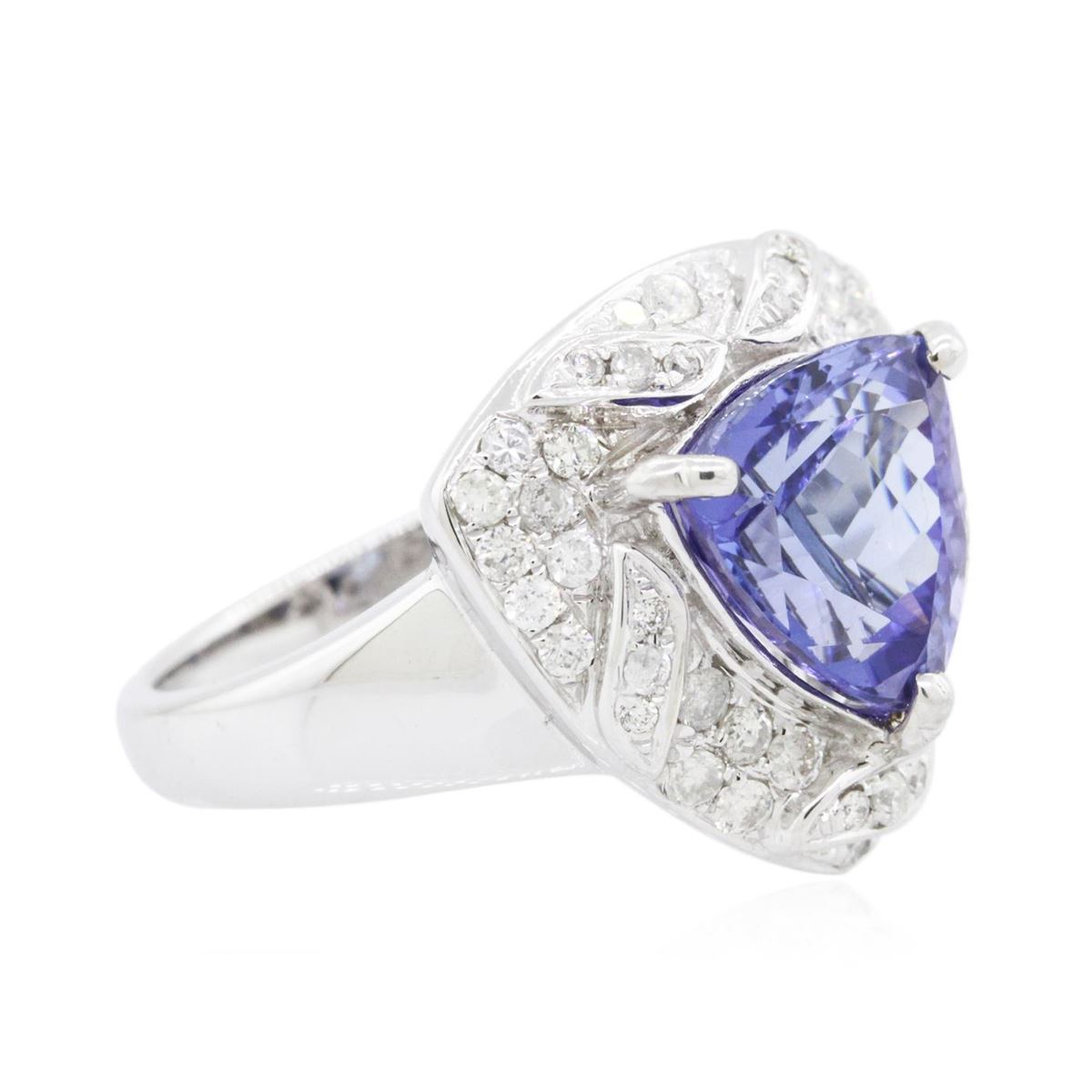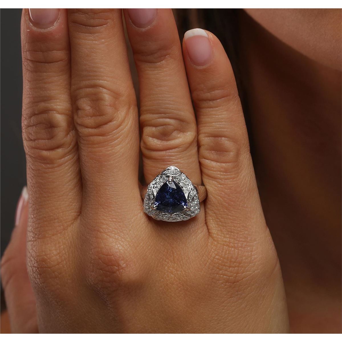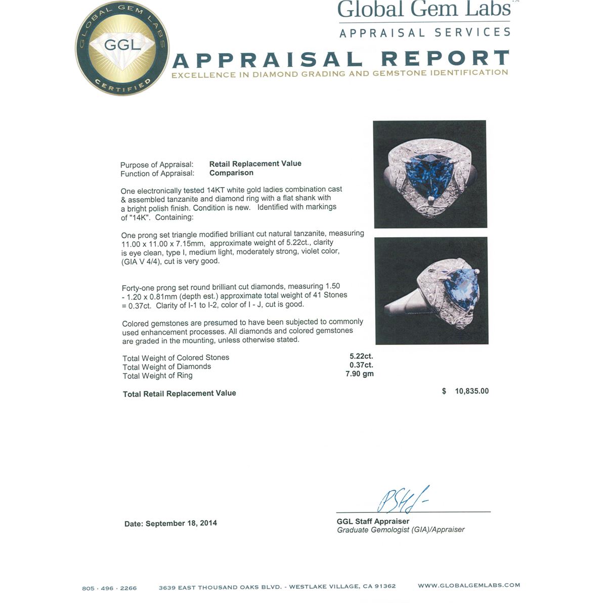 One electronically tested 14KT white gold ladies combination cast & assembled tanzanite and diamond ring with a flat shank with a bright polish finish. Identified with markings of "14K". Condition is new. Containing: One prong set triangle modified brilliant cut natural tanzanite, measuring 11.00 x 11.00 x 7.15mm, approximate weight of 5.22ct., clarity is eye clean, type I, medium light, moderately strong, violet color, (GIA V 4/4), cut is very good. Forty-One prong set round brilliant cut diamonds, measuring 1.50 - 1.20 x 0.81mm (depth est.) approximate total weight of 41 Stones = 0.37ct. Clarity: I-1 to I-2. Color: I - J, Cut is Good. Colored gemstones are presumed to have been subjected to commonly used enhancement processes. All diamonds and colored gemstones are graded in the mounting, unless otherwise stated. Total Weight of Colored Stones 5.22ct. Total Weight of Diamonds 0.37ct. Total Weight of Ring 7.90 grams. GGL Appraised at $10,835.00.