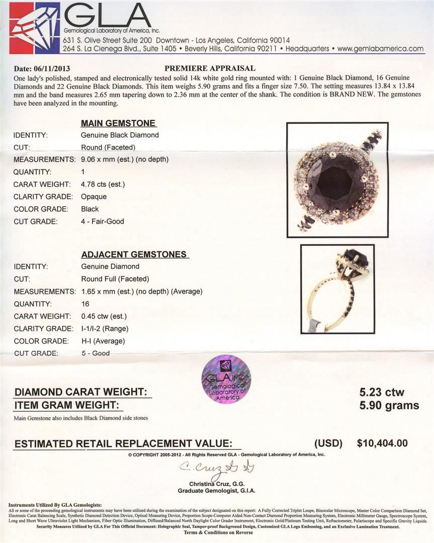 One lady's polished, stamped and electronically tested solid 14k white gold ring mounted with: 1 Genuine Black Diamond, 16 Genuine Diamonds and 22 Genuine Black Diamonds. This item weighs 5.90 grams and fits a finger size 7.50. The setting measures 13.84 x 13.84 mm and the band measures 2.65 mm tapering down to 2.36 mm at the center of the shank. The condition is BRAND NEW. The gemstones have been analyzed in the mounting. GLA Appraised at $10,404.00.