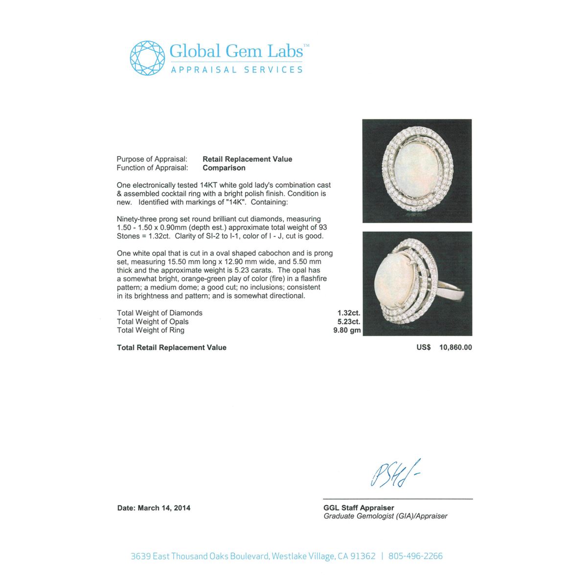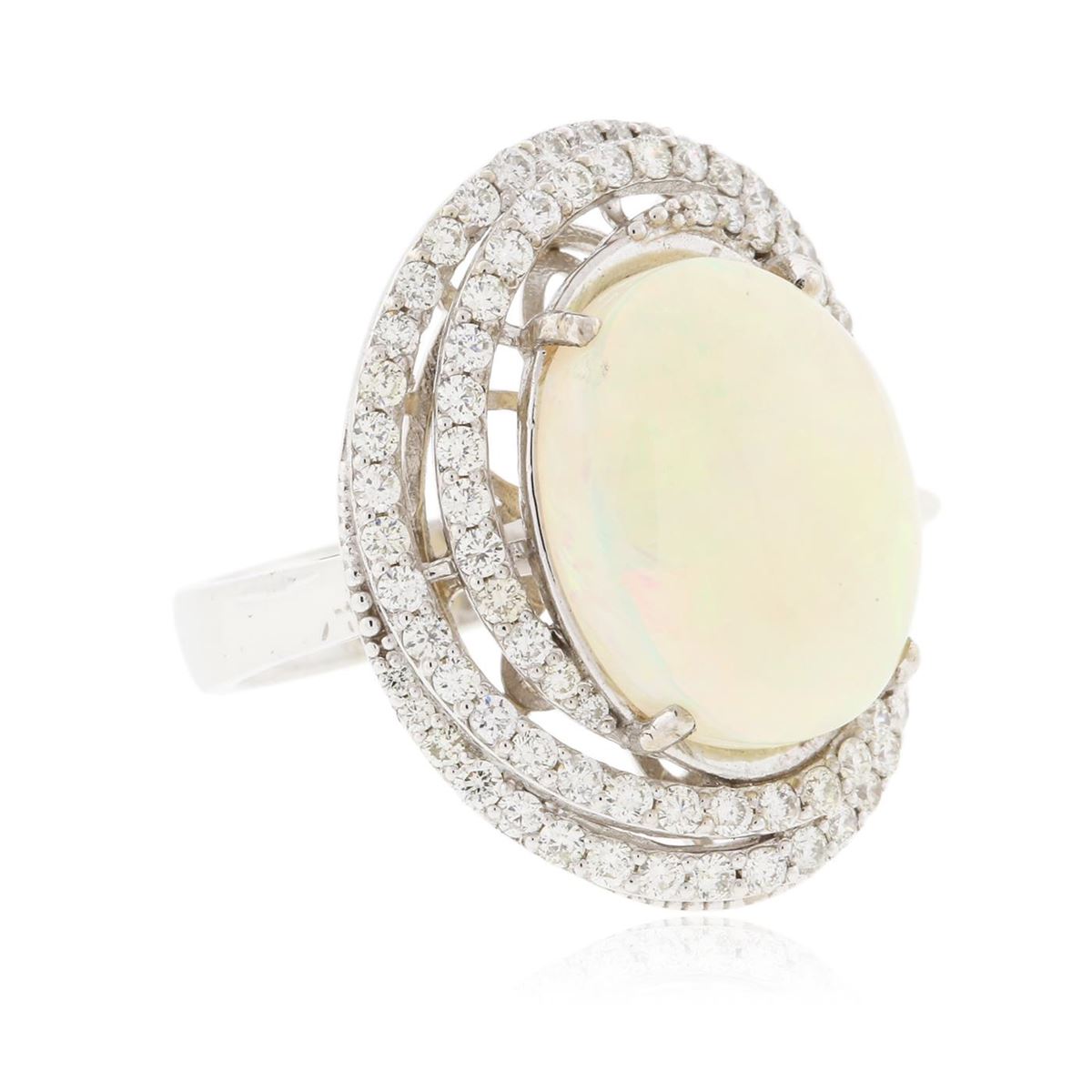 One electronically tested 14KT white gold Ladies combination cast & assembled cocktail ring with a bright polish finish. Condition is new. Identified with markings of "14K". Containing: Ninety-Three prong set round brilliant cut diamonds, measuring 1.50 - 1.50 x 0.90mm (depth est.) approximate. Total Weight of 93 Stones = 1.32ct. Clarity: SI-2 to I-1. Color: I - J, Cut is Good. One white opal that is cut in a oval shaped cabochon and is prong set, measuring 15.50 mm long x 12.90 mm wide, and 5.50 mm thick and the approximate weight is 5.23 carats. The opal has a somewhat bright, orange-green play of color (fire) in a flashfire pattern; a medium dome; a good cut; no inclusions; consistent in its brightness and pattern; and is somewhat directional. Total Weight of Diamonds 1.32ct. Total Weight of Opals 5.23ct. Total Weight of Ring 9.80gm. GGL Appraised at $10,860.00.