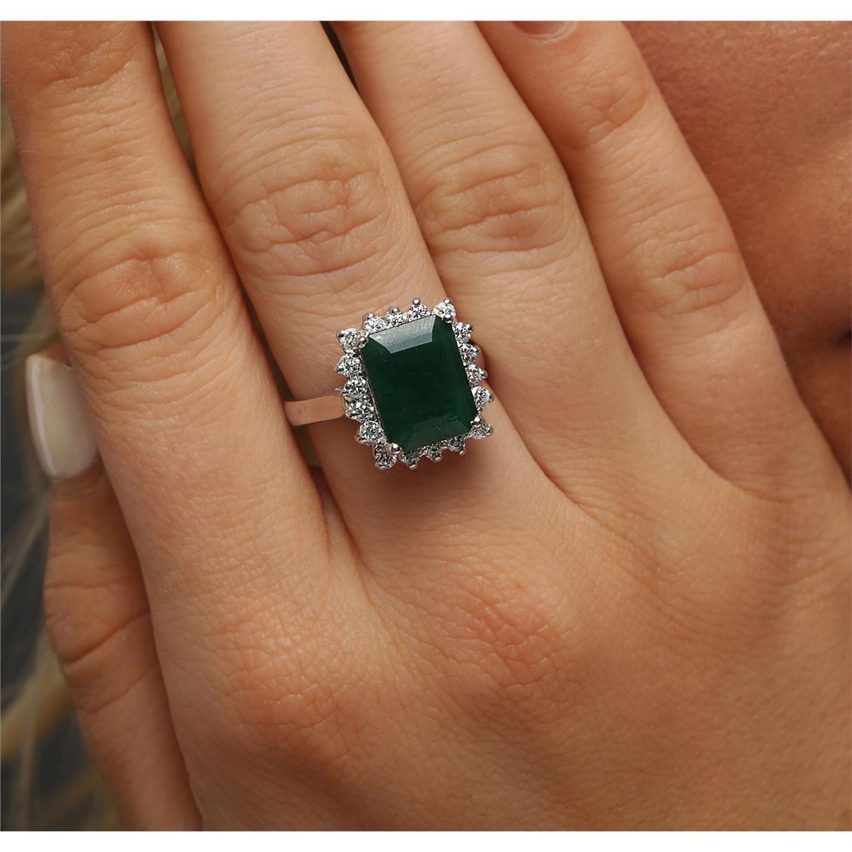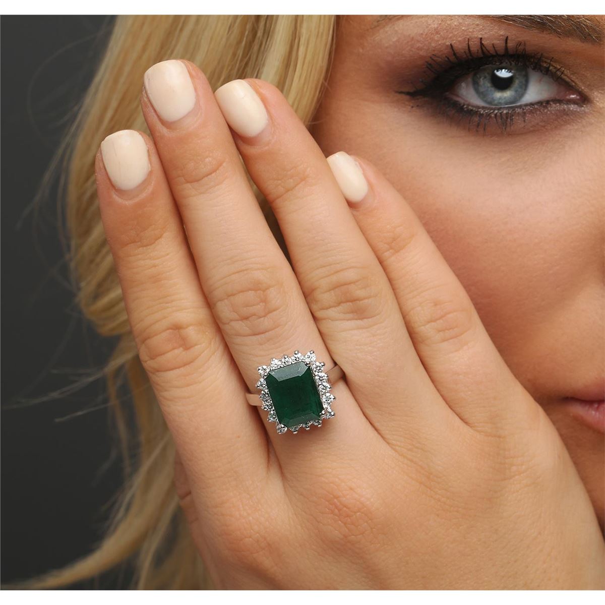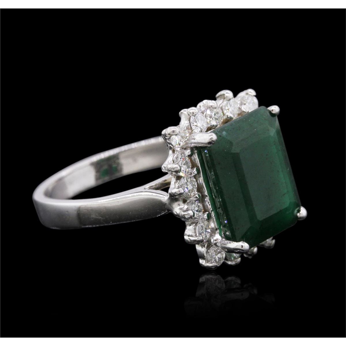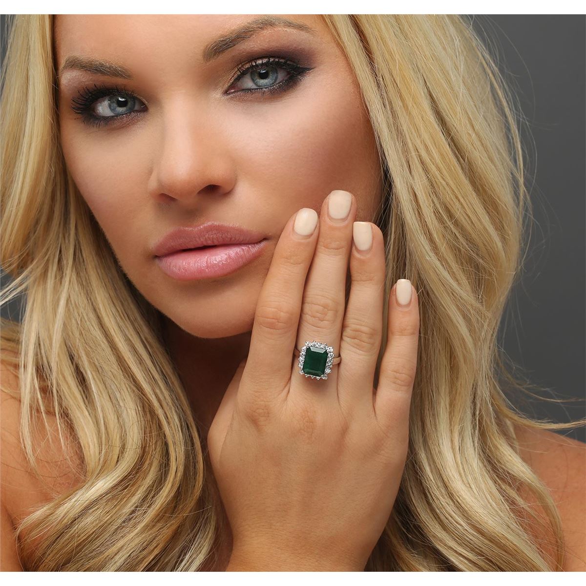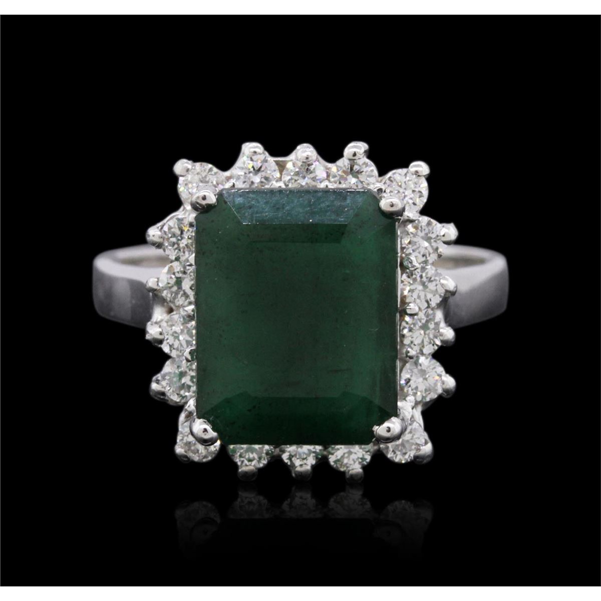 One electronically tested 14KT white gold ladies cast emerald and diamond ring with a bright polish finish. The featured emerald is set within a diamond bezel, completed by a two and one-half millimeter wide band. Identified with markings of 14K. Condition is new, good workmanship. Containing: One prong set rectangular step cut natural emerald, measuring 12.25 x 9.60 x 5.15mm, 6% bulge factor, approximate weight of 5.24ct., clarity is heavily included, type III, dark, very slightly grayish, very slightly bluish green color, (GIA vslbG 7/3), cut is good. Transmitting light somewhat diffusely, translucent. Naturally occurring internal & external characteristics are present. Indications of oil residue. Colored Stone Grading Report attached. Graded in the setting. Eighteen prong set round brilliant cut diamonds, measuring 2.30 - 2.20 x 1.35mm (depth est.) approximate total weight of 18 Stones = 0.85ct. Graded in the setting. Clarity: SI-1 to I-1. Color: G - I. Total Weight of Colored Stones 5.24ct. Total Weight of Diamonds 0.85ct. Total Weight of Ring 7.18 grams. AIG Appraised at $9,250.00.
