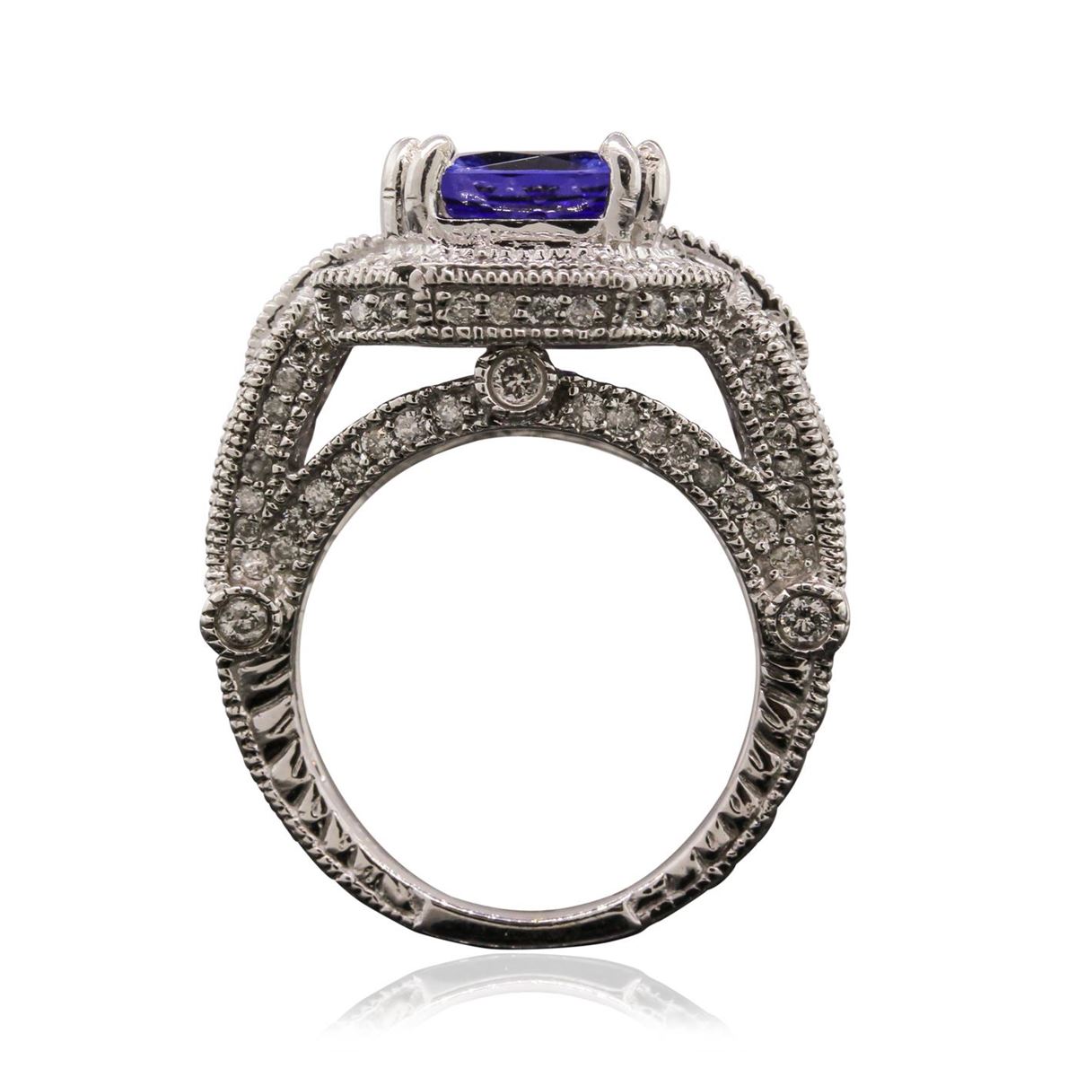 One electronically tested 14KT white gold ladies cast tanzanite and diamond ring. Condition is good. The featured tanzanite is set within a diamond bezel, supported by diamond set split shoulders and completed by a three and one-half millimeter wide band. Bright and patterned finish with migraine detailing throughout. Identified with markings of "14K". Containing: One prong set rectangular cushion mixed cut natural tanzanite, measuring 11.20 x 9.00 x 6.60mm, approximate weight of 5.24ct., clarity is eye clean, type I, medium dark, moderately strong, bluish violet color, (GIA bV 6/4), cut is good. Transmitting light with no distortion, transparent. Colored Stone Grading Report attached. Graded in the setting. Tanzanite is a very rare gemstone that is only found in the country of Tanzania. Originally discovered in 1967. Tiffany & Company, named the stone Tanzanite. It is found in the Usumburu Mountains that border the Umba Valley of northern Tanzania. Tanzanite occurs in gray, brown, violet, blue, reddish-purple, & green. The gem is interesting because of its exceptional pleochroism. Rotated in different directions a tanzanite will exhibit multiple changes of color. Tanzanite has a low tolerance to ultrasonic cleaning, and should not be cleaned using this method.One Hundred Thirty-Six bead & bezel set round brilliant cut diamonds, measuring 1.60 - 1.30 x 0.87mm (depth est.) approximate. Total Weight of 136 Stones = 1.61ct. Graded in the setting. Clarity: I-1 to I-2. Color: G - I. Total Weight of Colored Stones 5.24ct. Total Weight of Diamonds 1.61ct. Total Weight of Ring 9.80 grams. AIG Appraised at $20,020.00.