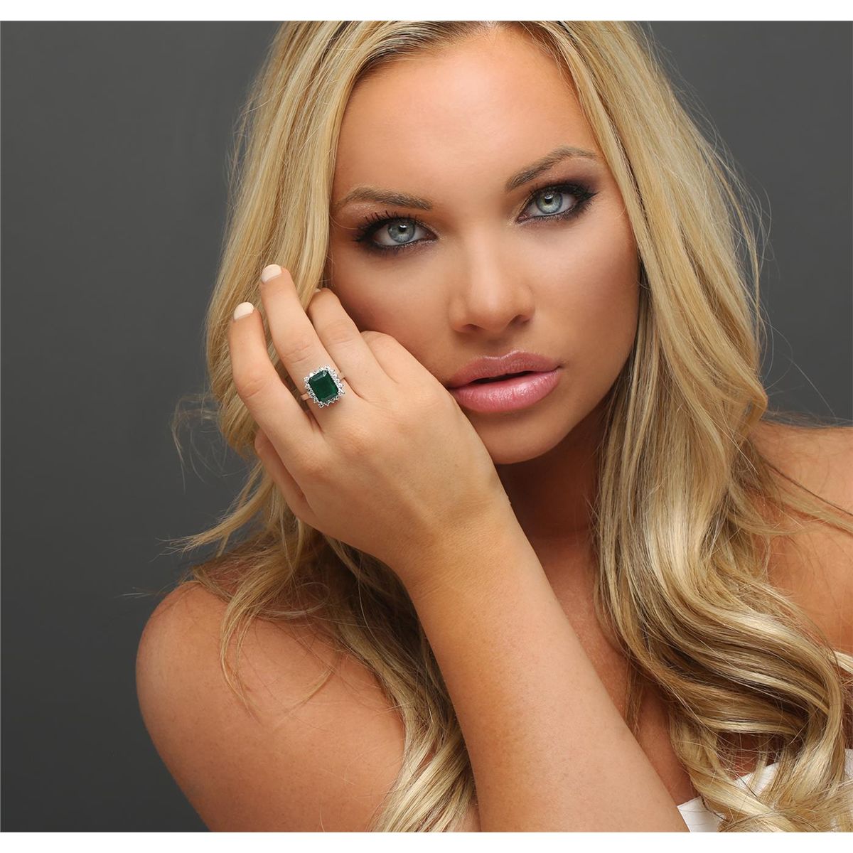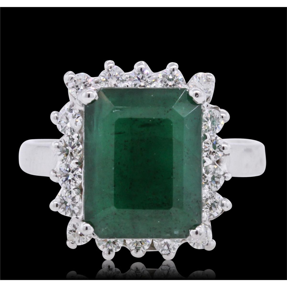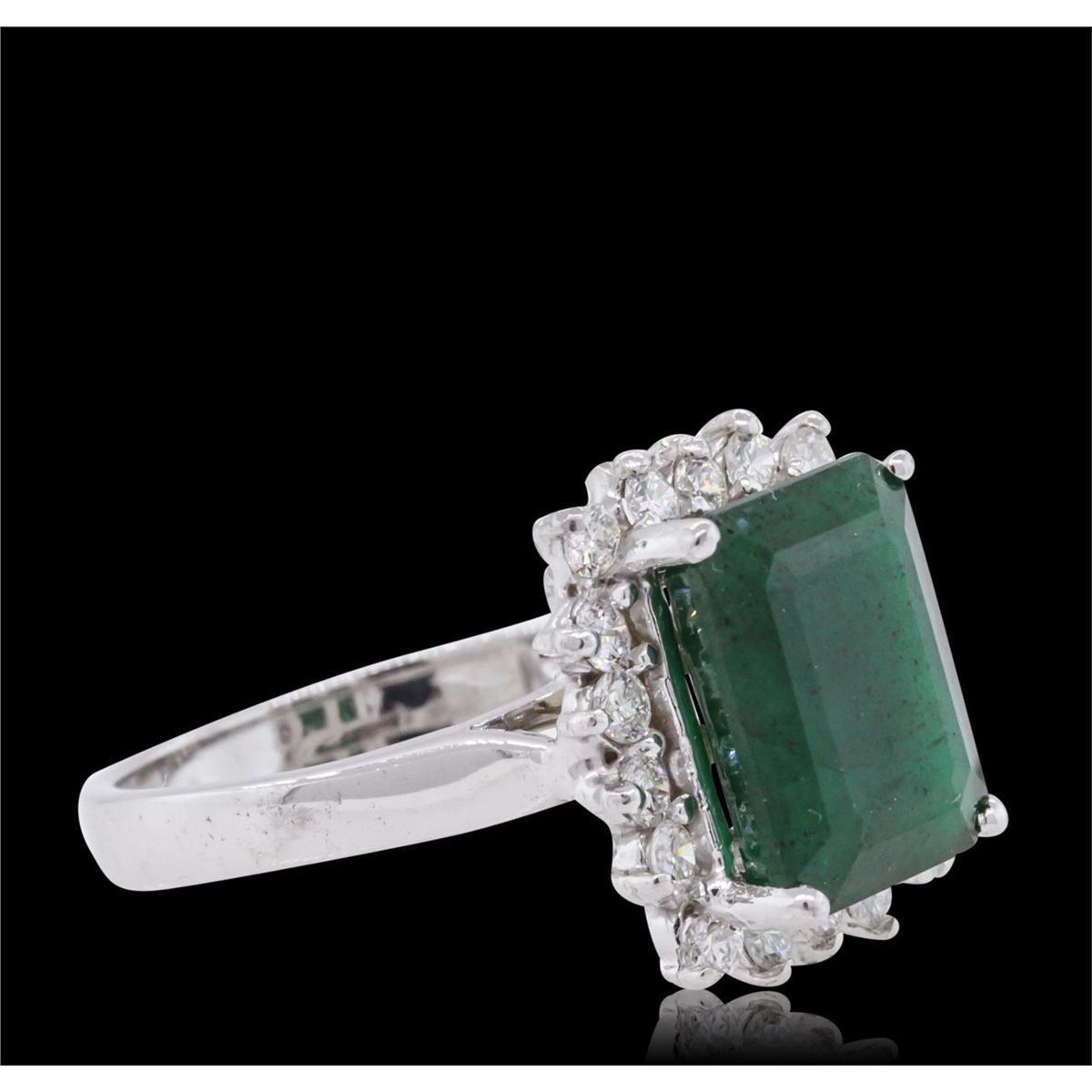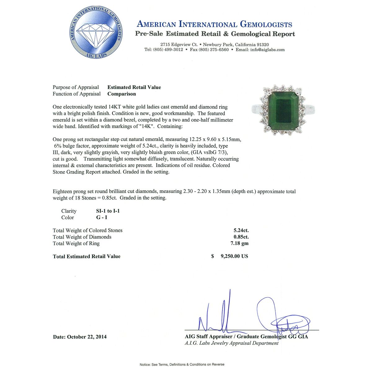 One electronically tested 14KT white gold ladies cast emerald and diamond ring with a bright polish finish. The featured emerald is set within a diamond bezel, completed by a two and one-half millimeter wide band. Identified with markings of 14K. Condition is new, good workmanship. Containing: One prong set rectangular step cut natural emerald, measuring 12.25 x 9.60 x 5.15mm, 6% bulge factor, approximate weight of 5.24ct., clarity is heavily included, type III, dark, very slightly grayish, very slightly bluish green color, (GIA vslbG 7/3), cut is good. Transmitting light somewhat diffusely, translucent. Naturally occurring internal & external characteristics are present. Indications of oil residue. Colored Stone Grading Report attached. Graded in the setting. Eighteen prong set round brilliant cut diamonds, measuring 2.30 - 2.20 x 1.35mm (depth est.) approximate total weight of 18 Stones = 0.85ct. Graded in the setting. Clarity: SI-1 to I-1. Color: G - I. Total Weight of Colored Stones 5.24ct. Total Weight of Diamonds 0.85ct. Total Weight of Ring 7.18 grams. AIG Appraised at $9,250.00.