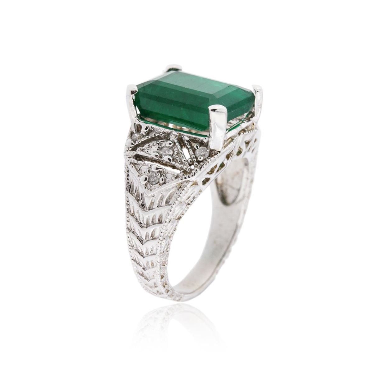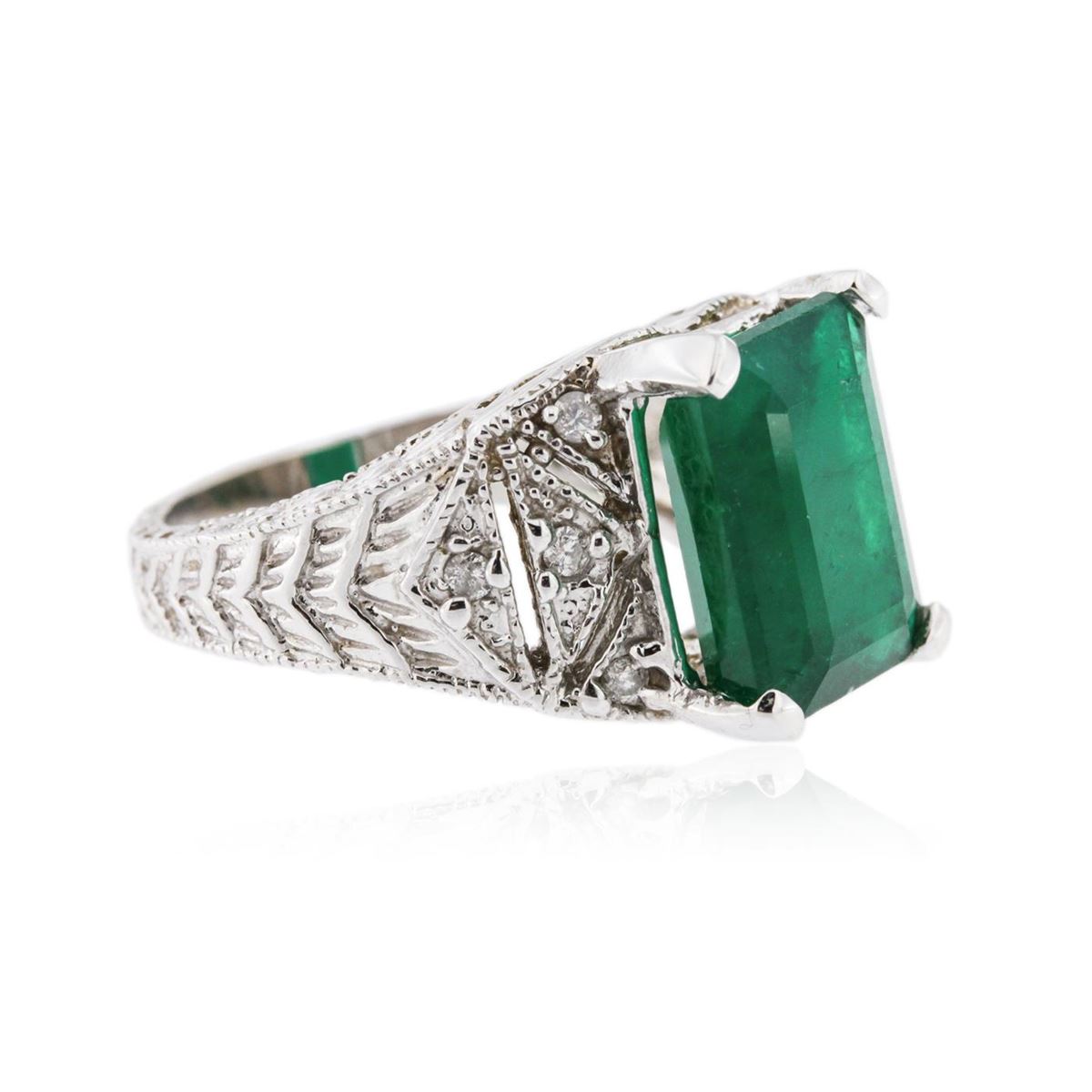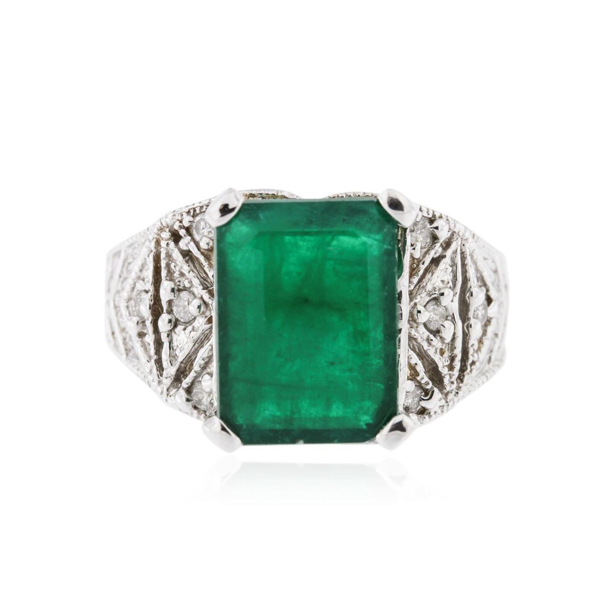 One electronically tested 14KT white gold ladies cast emerald and diamond ring. Condition is good. The featured emerald is supported by diamond set shoulders and completed by a three millimeter wide band. Bright and pattered finish with milgrain detailing throughout. Identified with markings of "14K". Containing: One prong set rectangular step cut natural emerald, measuring 12.00 x 8.85 x 5.30mm, 8% bulge factor, approximate weight of 5.26ct., clarity is heavily included, type III, medium dark, moderately strong, very slightly bluish green color, (GIA vslbG 6/4), cut is good. Transmitting light with a minimum of distortion, transparent. Naturally occurring internal & external characteristics are present. Indication of oil, & opticon residue. Colored stone grading report attached. Graded in the setting. Eight prong set round brilliant cut diamonds, measuring 1.50 - 1.50 x 0.90mm (depth est.) approximate total weight of 8 stones = 0.13ct. Graded in the setting. Clarity I-1 to I-2. Color G-I. Total weight of Emerald 5.26ct. Total weight of Diamonds 0.13ct. Total weight of Ring 7.80gm. AIG Appraised at $16,070.00.