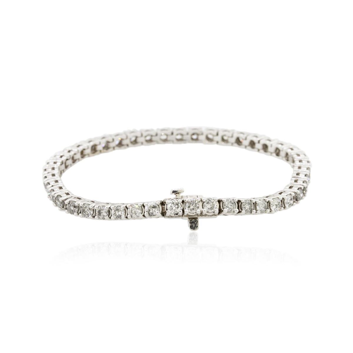 One electronically tested 14KT white gold Ladies combination cast & assembled tennis bracelet with a hidden box clasp with a bright polish finish. Condition is new. Measurements: 7" in length. Identified with markings of "14K". Containing: Forty-Four prong set round brilliant cut diamonds, measuring 3.20 - 3.20 x 1.92mm (depth est.) approximate. Total Weight of 44 Stones = 5.28ct. Clarity: I-1 to I-3. Color: I - J, Cut is Good. Total Weight of Diamonds 5.28ct. Total Weight of Bracelet 17.50 grams. GGL Appraised at $14,295.00.