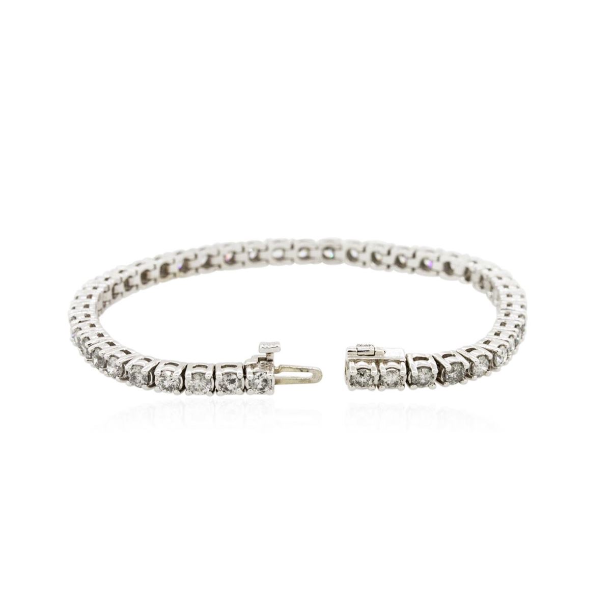 One electronically tested 14KT white gold Ladies combination cast & assembled tennis bracelet with a hidden box clasp with a bright polish finish. Condition is new. Measurements: 7" in length. Identified with markings of "14K". Containing: Forty-Four prong set round brilliant cut diamonds, measuring 3.20 - 3.20 x 1.92mm (depth est.) approximate. Total Weight of 44 Stones = 5.28ct. Clarity: I-1 to I-3. Color: I - J, Cut is Good. Total Weight of Diamonds 5.28ct. Total Weight of Bracelet 17.50 grams. GGL Appraised at $14,295.00.