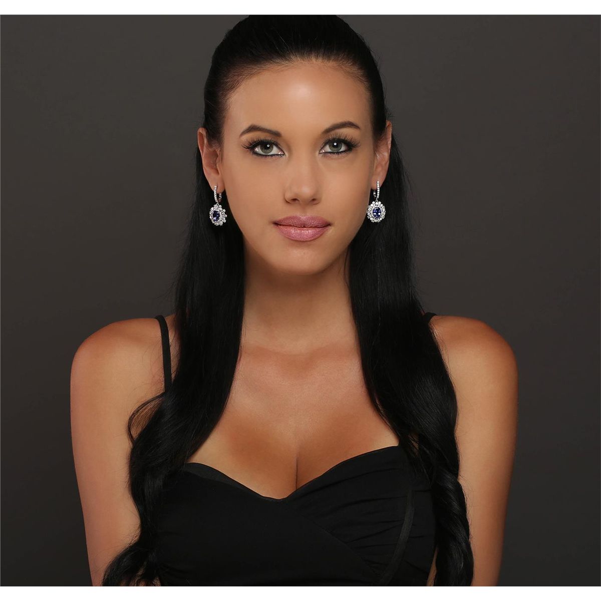 One pair electronically tested 14KT white gold ladies combination cast & assembled dangle earrings with hinged clip backs with a bright polish finish. Identified with markings of "14K". Condition is new. Containing: Two prong set oval modified brilliant cut natural tanzanites, measuring 10.00 x 8.70 x 4.50mm, approximate total weight of 5.28ct., clarity is eye clean, type I, medium light, moderately strong, bluish violet color, (GIA bV 4/4), cut is good. Seventy-Six prong set round brilliant cut diamonds, measuring 1.50 - 1.50 x 0.90mm (depth est.) approximate total weight of 76 Stones = 0.94ct. Clarity: SI-2 to I-1. Color: H - J, Cut is Good. Forty prong set round brilliant cut diamonds, measuring 2.50 - 2.50 x 1.50mm (depth est.) approximate total weight of 40 Stones = 2.28ct. Clarity: SI-1 to I-1. Color: G - I, Cut is Good. Colored gemstones are presumed to have been subjected to commonly used enhancement processes. All diamonds and colored gemstones are graded in the mounting, unless otherwise stated. Total Weight of Colored Stones 5.28ct. Total Weight of Diamonds 3.22ct. Total Weight of Earrings 9.60 grams. GGL Appraised at $18,360.00.