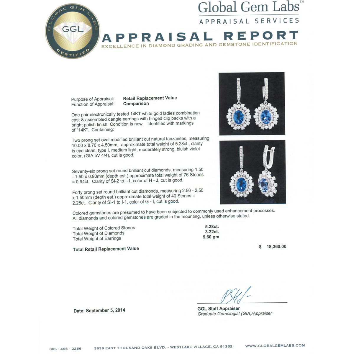 One pair electronically tested 14KT white gold ladies combination cast & assembled dangle earrings with hinged clip backs with a bright polish finish. Identified with markings of "14K". Condition is new. Containing: Two prong set oval modified brilliant cut natural tanzanites, measuring 10.00 x 8.70 x 4.50mm, approximate total weight of 5.28ct., clarity is eye clean, type I, medium light, moderately strong, bluish violet color, (GIA bV 4/4), cut is good. Seventy-Six prong set round brilliant cut diamonds, measuring 1.50 - 1.50 x 0.90mm (depth est.) approximate total weight of 76 Stones = 0.94ct. Clarity: SI-2 to I-1. Color: H - J, Cut is Good. Forty prong set round brilliant cut diamonds, measuring 2.50 - 2.50 x 1.50mm (depth est.) approximate total weight of 40 Stones = 2.28ct. Clarity: SI-1 to I-1. Color: G - I, Cut is Good. Colored gemstones are presumed to have been subjected to commonly used enhancement processes. All diamonds and colored gemstones are graded in the mounting, unless otherwise stated. Total Weight of Colored Stones 5.28ct. Total Weight of Diamonds 3.22ct. Total Weight of Earrings 9.60 grams. GGL Appraised at $18,360.00.