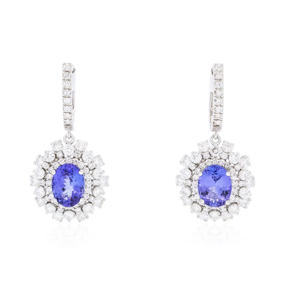 One pair electronically tested 14KT white gold ladies combination cast & assembled dangle earrings with hinged clip backs with a bright polish finish. Identified with markings of "14K". Condition is new. Containing: Two prong set oval modified brilliant cut natural tanzanites, measuring 10.00 x 8.70 x 4.50mm, approximate total weight of 5.28ct., clarity is eye clean, type I, medium light, moderately strong, bluish violet color, (GIA bV 4/4), cut is good. Seventy-Six prong set round brilliant cut diamonds, measuring 1.50 - 1.50 x 0.90mm (depth est.) approximate total weight of 76 Stones = 0.94ct. Clarity: SI-2 to I-1. Color: H - J, Cut is Good. Forty prong set round brilliant cut diamonds, measuring 2.50 - 2.50 x 1.50mm (depth est.) approximate total weight of 40 Stones = 2.28ct. Clarity: SI-1 to I-1. Color: G - I, Cut is Good. Colored gemstones are presumed to have been subjected to commonly used enhancement processes. All diamonds and colored gemstones are graded in the mounting, unless otherwise stated. Total Weight of Colored Stones 5.28ct. Total Weight of Diamonds 3.22ct. Total Weight of Earrings 9.60 grams. GGL Appraised at $18,360.00.