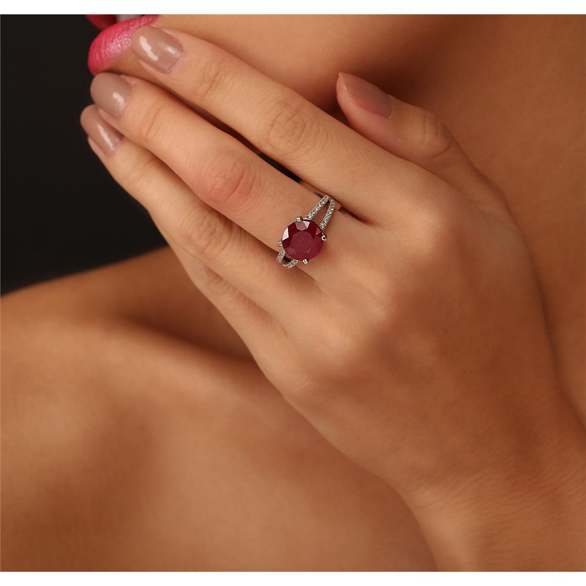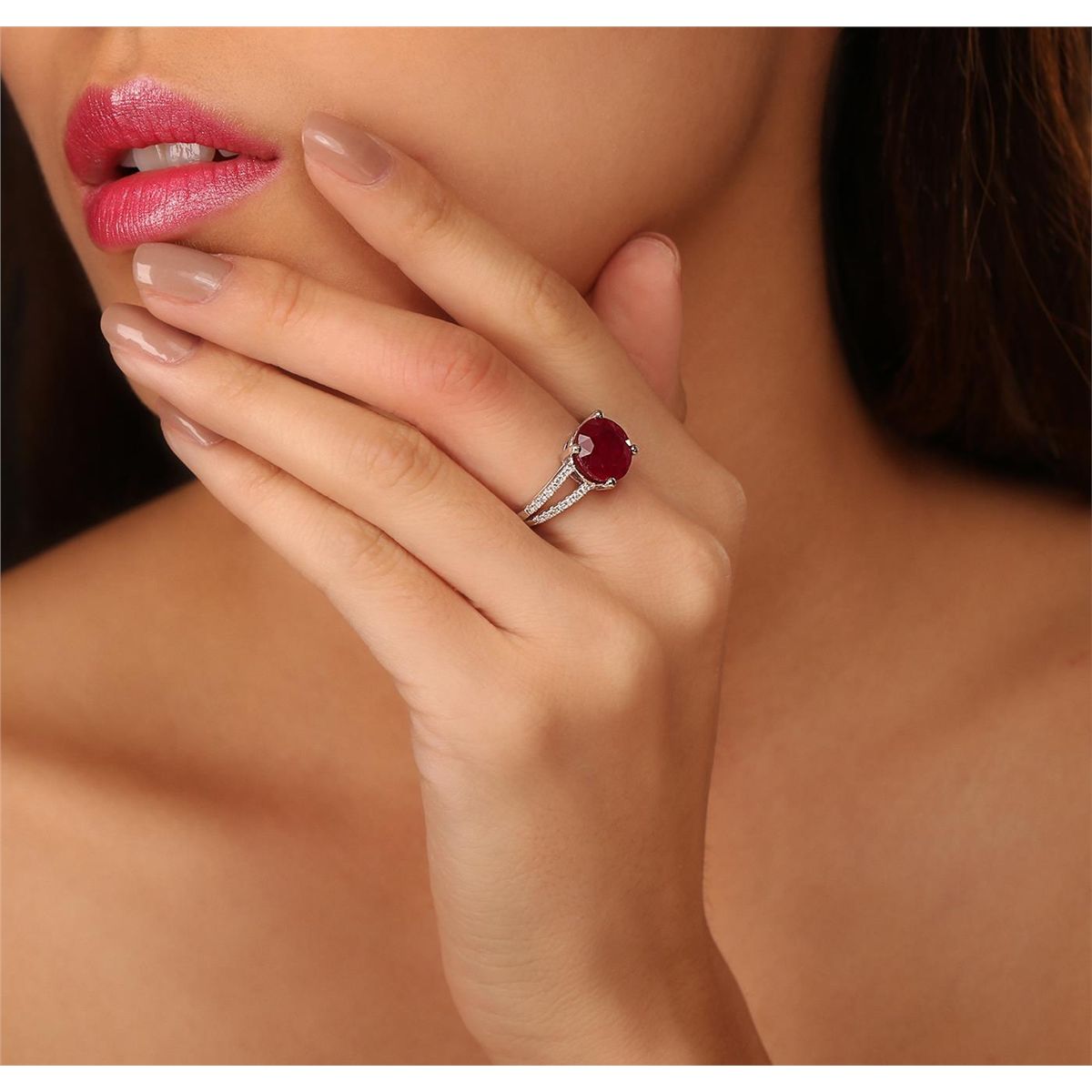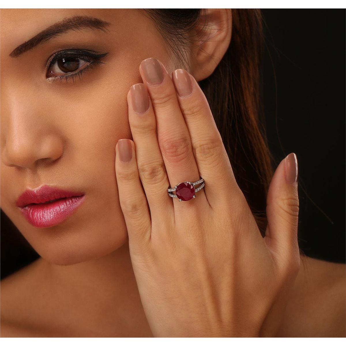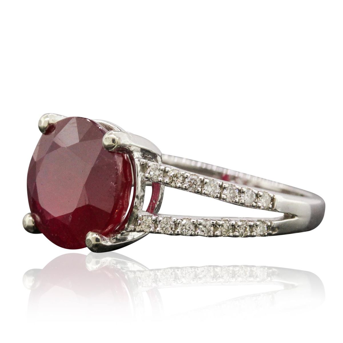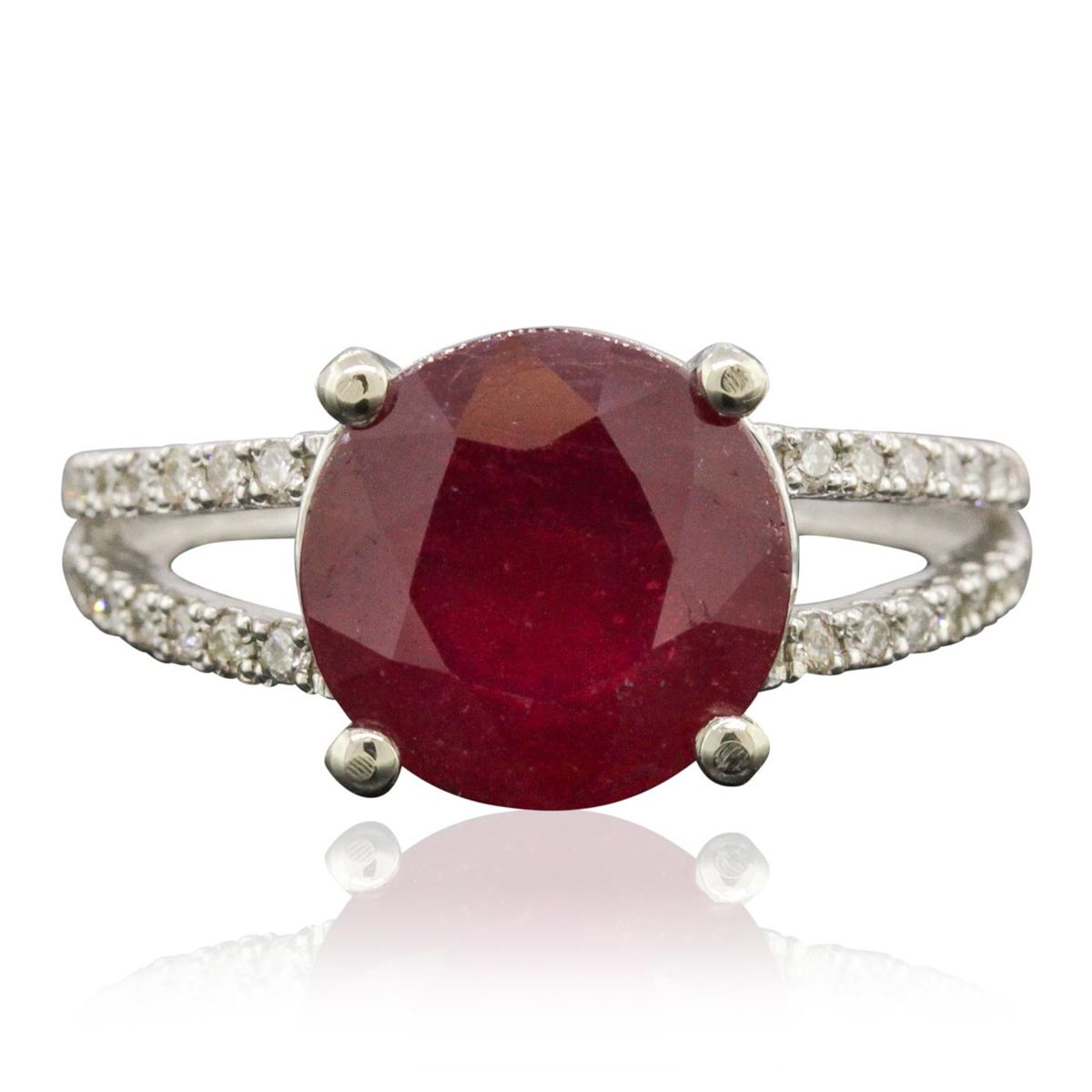 One electronically tested 14KT white gold ladies cast ruby and diamond ring with a bright polish finish. The featured ruby is supported by diamond set split shoulders, completed by a one and one-half millimeter wide band. Identified with markings of "14K". Condition is new, good workmanship. Containing: One prong set round brilliant cut natural ruby, measuring 10.10 - 10.05 x 6.00 mm, 8%. bulge factor, approximate weight of 5.29ct., clarity is heavily included, type II, dark, very slightly brownish, slightly purplish red color, (GIA slpR 7/3), cut is good. Transmitting light somewhat diffusely, transparent to translucent. Naturally occurring internal & external characteristics are present. Indications of laboratory high temperature heat treatment, with glass & flux additives. Graded in the setting. Ruby has a low tolerance to rhodium plating, repolishing the surface, & ultrasonic cleaning. Twenty-Eight prong set round brilliant cut diamonds, measuring 1.20 - 1.10 x 0.69mm (depth est.) approximate total weight of 28 Stones = 0.25ct. Graded in the setting. Clarity: SI-1 to I-1. Color: H - J. Total Weight of Colored Stones 5.29ct. Total Weight of Diamonds 0.25ct. Total Weight of Ring 3.99 grams. AIG Appraised at $2,535.00.