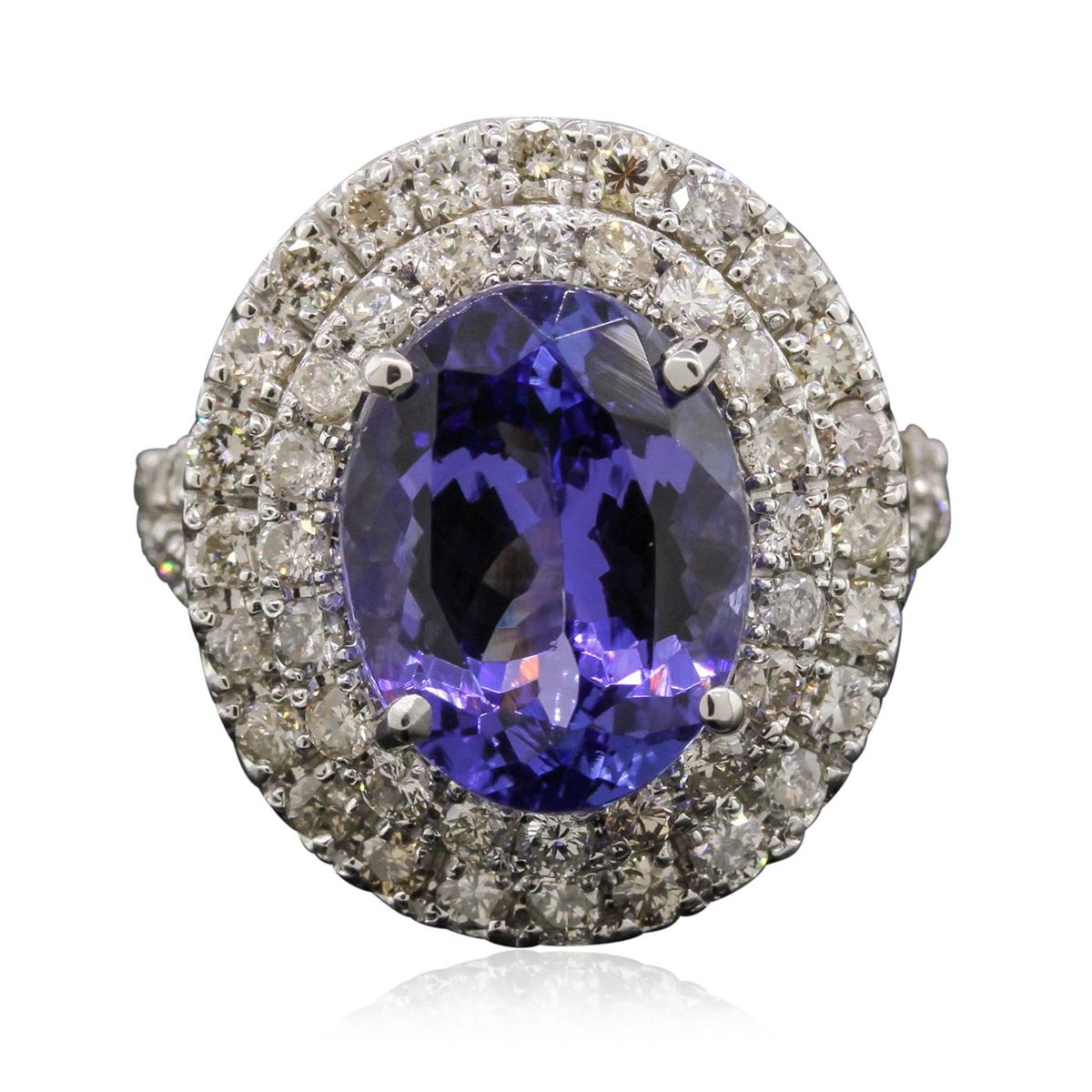 One electronically tested 14KT white gold Ladies combination cast & assembled ring with a bright polish finish. Condition is new. Identified with markings of "K14". Containing: One prong set oval modified brilliant cut natural tanzanite, measuring 12.41 x 9.64 x 6.50mm, approximate weight of 5.29ct., clarity is eye clean, type I, medium, very slightly grayish, bluish violet color, (GIA bV 5/3), cut is good. Colored gemstones are presumed to have been subjected to commonly used color/clarity enhancement processes. Seventy-Two prong set round brilliant cut diamonds, measuring 1.80 - 1.80 x 1.08mm (depth est.) approximate. Total Weight of 72 Stones = 1.53ct. Clarity: I-1 to I-2. Color: K - L, Cut is Good. Total Weight of Colored Stones 5.29ct. Total Weight of Diamonds 1.53ct. Total Weight of Ring 7.70 grams. GGL Appraised at $9,410.00.