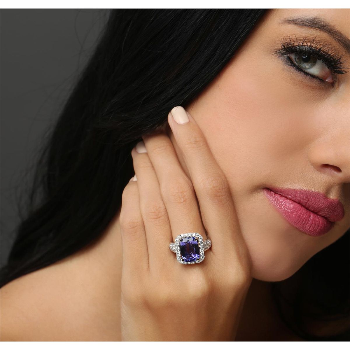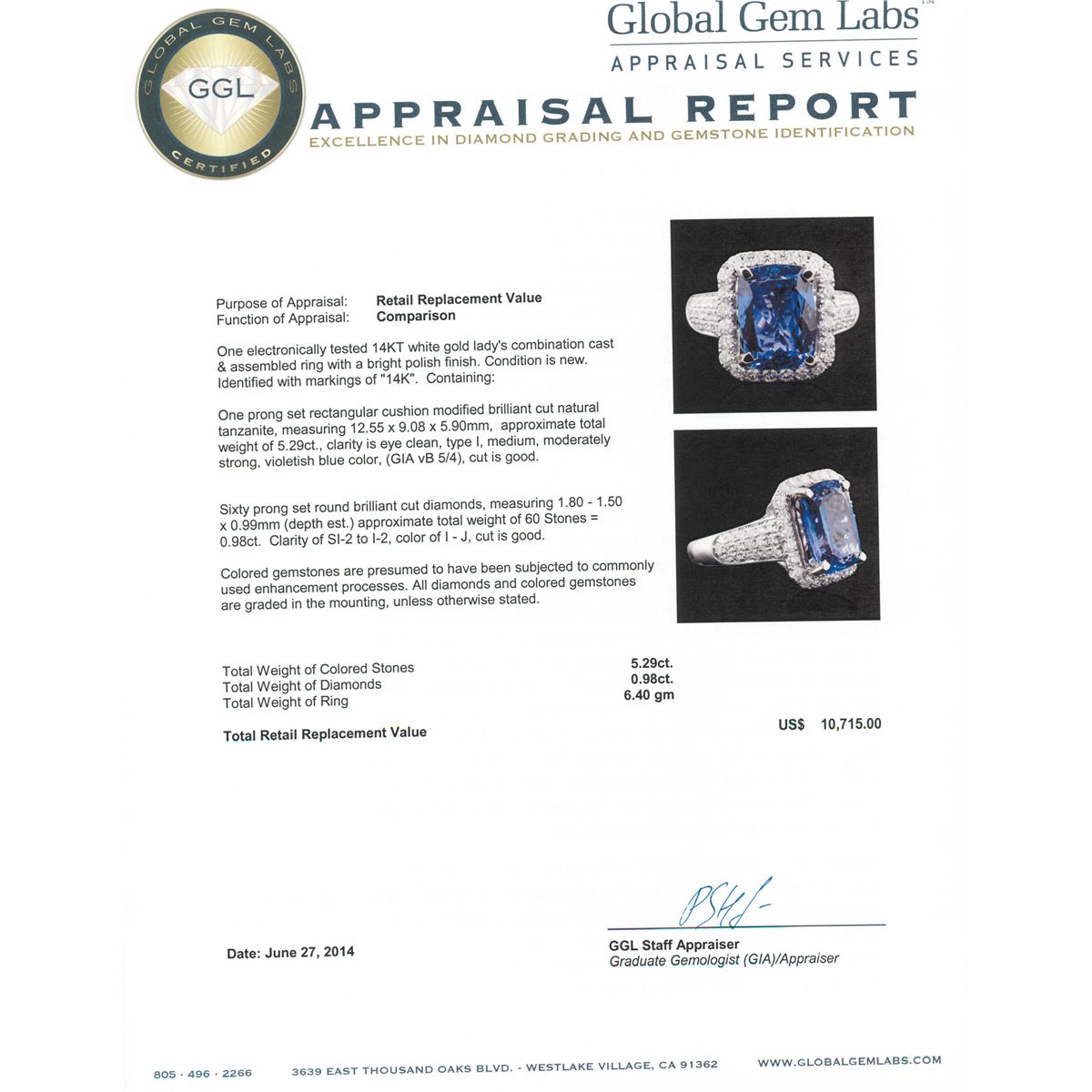 One electronically tested 14KT white gold Ladies combination cast & assembled ring with a bright polish finish. Condition is new. Identified with markings of "14K". Containing: One prong set rectangular cushion modified brilliant cut natural tanzanite, measuring 12.55 x 9.08 x 5.90mm, approximate. Total Weight of 5.29ct., clarity is eye clean, type I, medium, moderately strong, violetish blue color, (GIA vB 5/4), cut is good. Sixty prong set round brilliant cut diamonds, measuring 1.80 - 1.50 x 0.99mm (depth est.) approximate total weight of 60 Stones = 0.98ct. Clarity: SI-2 to I-2. Color: I - J, Cut is Good. Colored gemstones are presumed to have been subjected to commonly used enhancement processes. All diamonds and colored gemstones are graded in the mounting, unless otherwise stated. Total Weight of Colored Stones 5.29ct. Total Weight of Diamonds 0.98ct. Total Weight of Ring 6.40 grams. GGL Appraised at $10,715.00.
