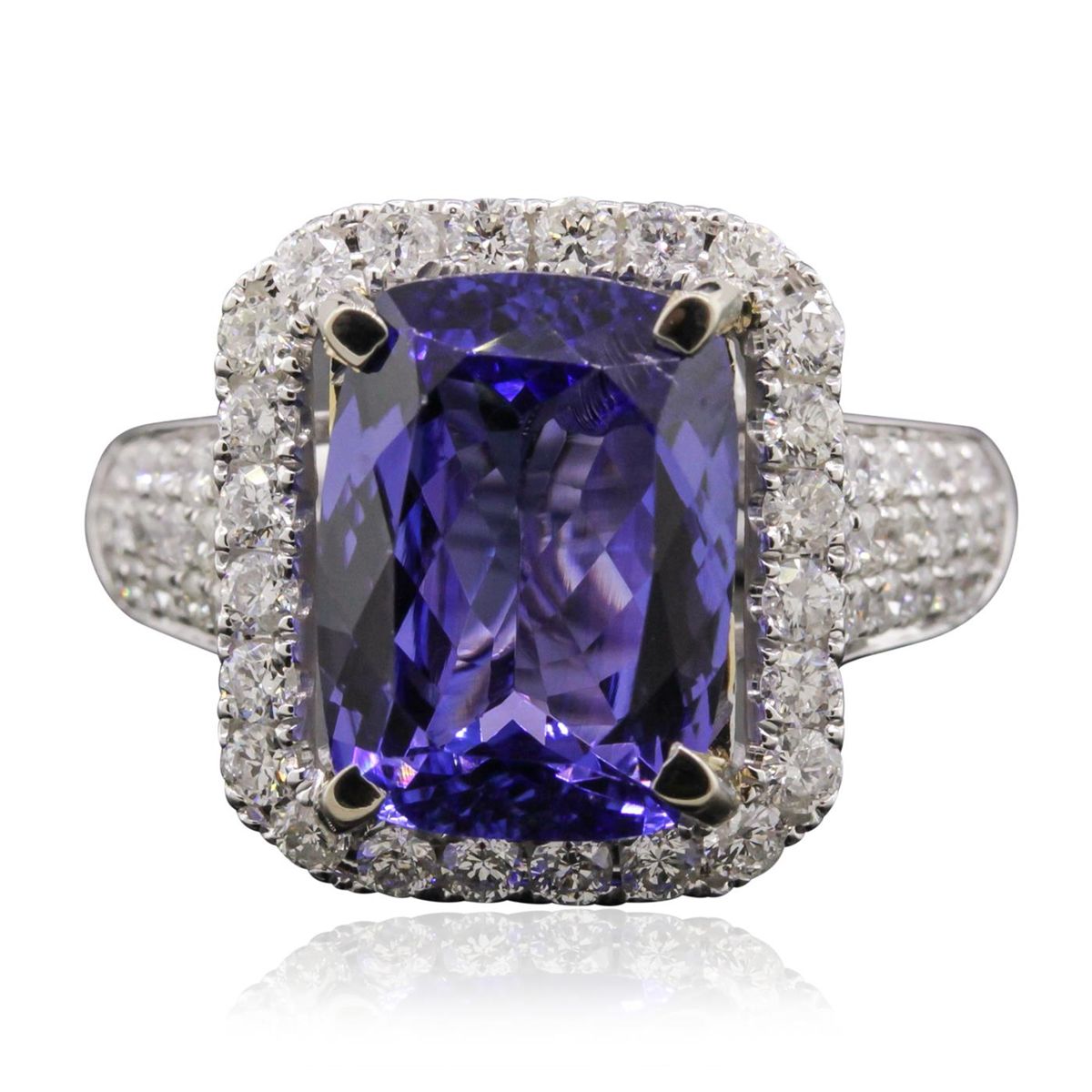 One electronically tested 14KT white gold Ladies combination cast & assembled ring with a bright polish finish. Condition is new. Identified with markings of "14K". Containing: One prong set rectangular cushion modified brilliant cut natural tanzanite, measuring 12.55 x 9.08 x 5.90mm, approximate. Total Weight of 5.29ct., clarity is eye clean, type I, medium, moderately strong, violetish blue color, (GIA vB 5/4), cut is good. Sixty prong set round brilliant cut diamonds, measuring 1.80 - 1.50 x 0.99mm (depth est.) approximate total weight of 60 Stones = 0.98ct. Clarity: SI-2 to I-2. Color: I - J, Cut is Good. Colored gemstones are presumed to have been subjected to commonly used enhancement processes. All diamonds and colored gemstones are graded in the mounting, unless otherwise stated. Total Weight of Colored Stones 5.29ct. Total Weight of Diamonds 0.98ct. Total Weight of Ring 6.40 grams. GGL Appraised at $10,715.00.