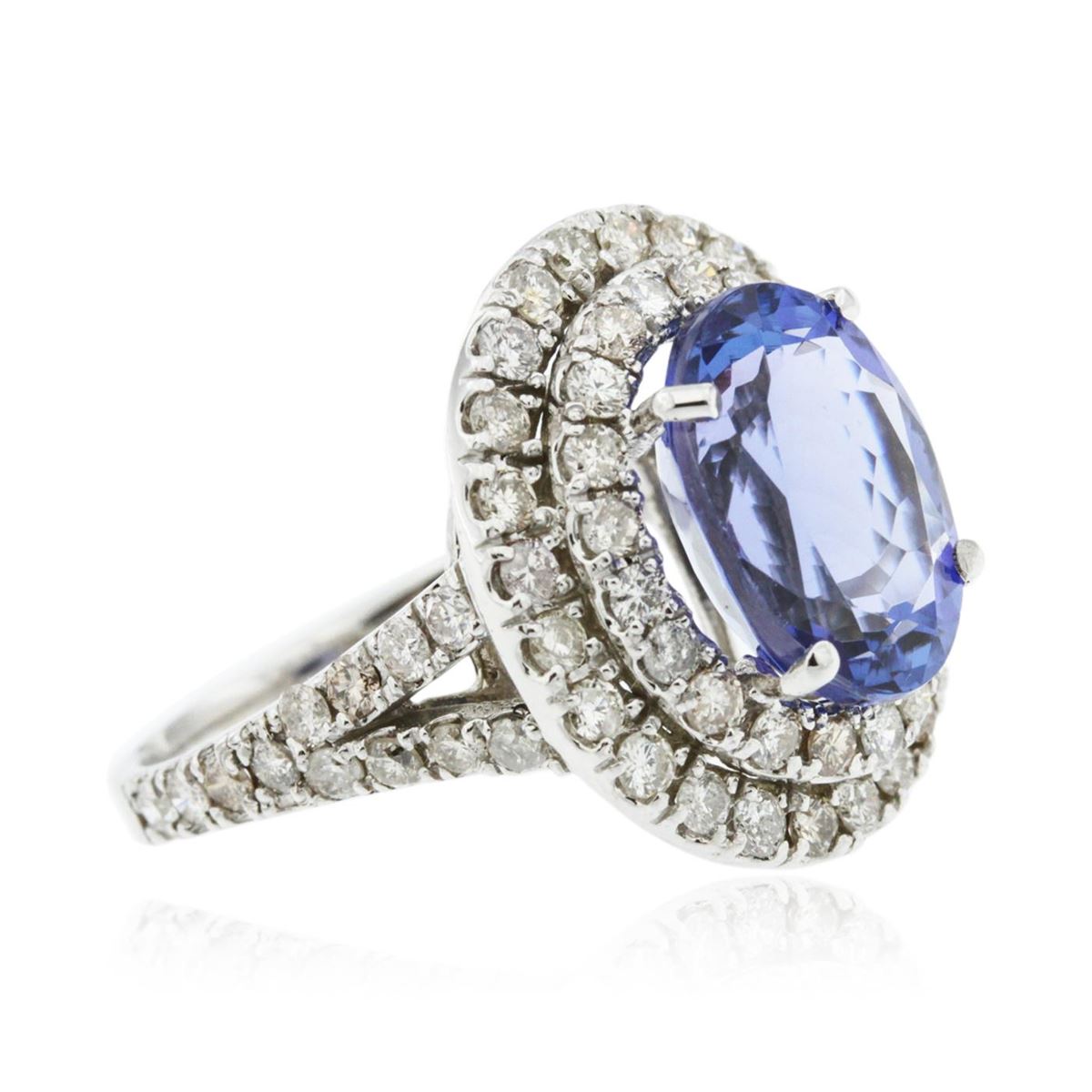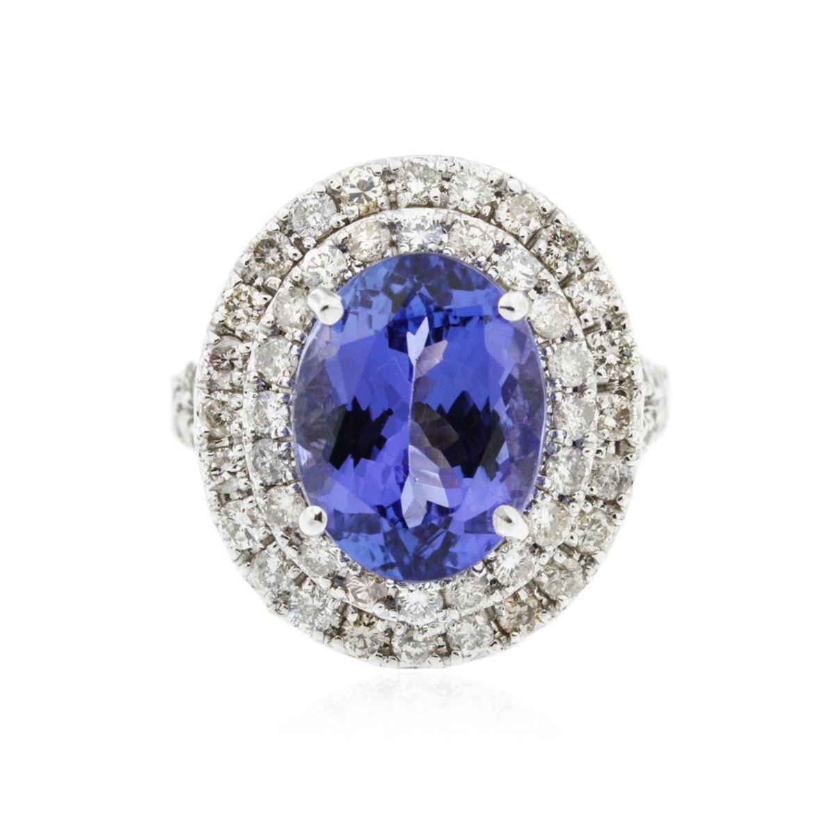 One electronically tested 14KT white gold Ladies combination cast & assembled ring with a bright polish finish. Condition is new. Identified with markings of "K14". Containing: One prong set oval modified brilliant cut natural tanzanite, measuring 12.41 x 9.64 x 6.50mm, approximate weight of 5.29ct., clarity is eye clean, type I, medium, very slightly grayish, bluish violet color, (GIA bV 5/3), cut is good. Colored gemstones are presumed to have been subjected to commonly used color/clarity enhancement processes. Seventy-Two prong set round brilliant cut diamonds, measuring 1.80 - 1.80 x 1.08mm (depth est.) approximate. Total Weight of 72 Stones = 1.53ct. Clarity: I-1 to I-2. Color: K - L, Cut is Good. Total Weight of Colored Stones 5.29ct. Total Weight of Diamonds 1.53ct. Total Weight of Ring 7.70 grams. GGL Appraised at $9,410.00.