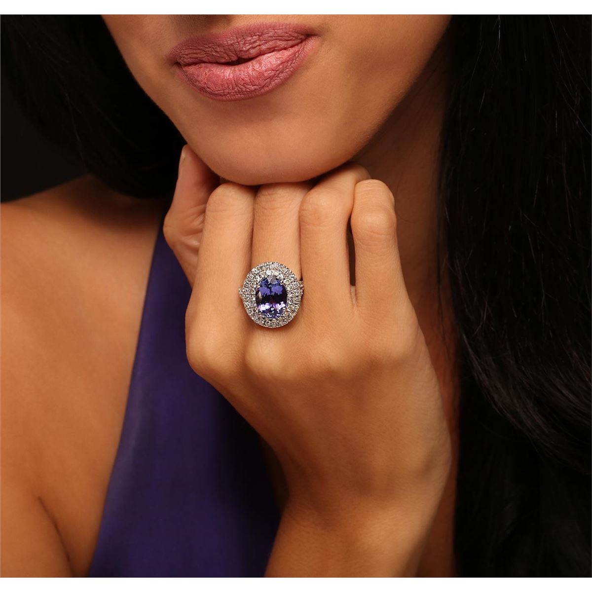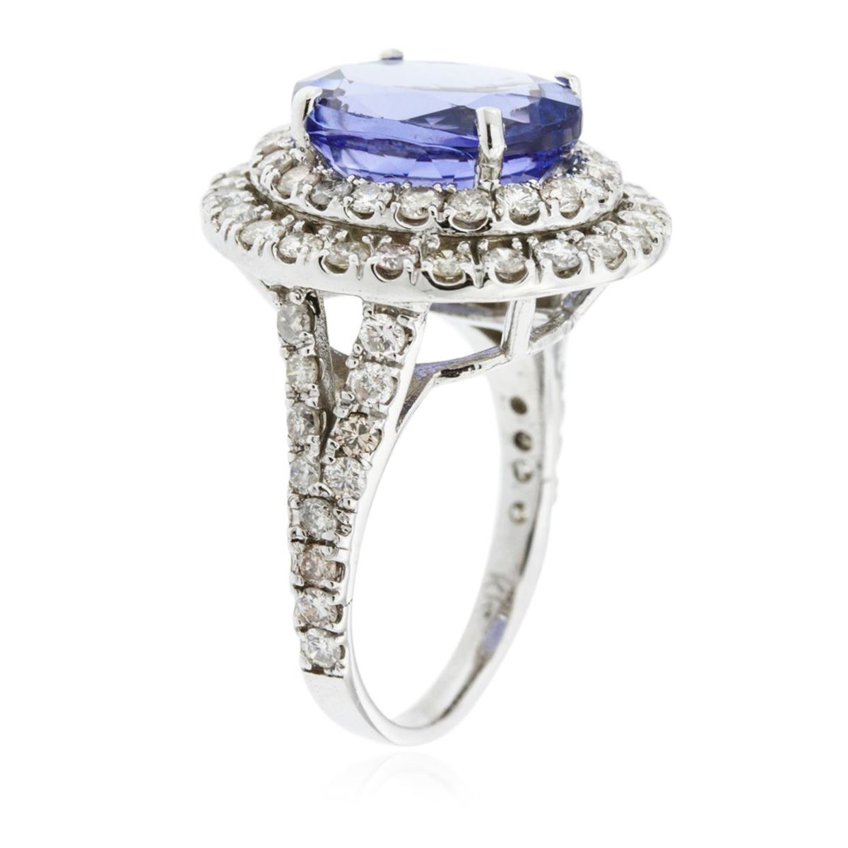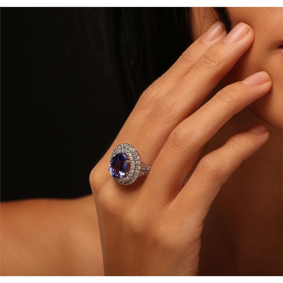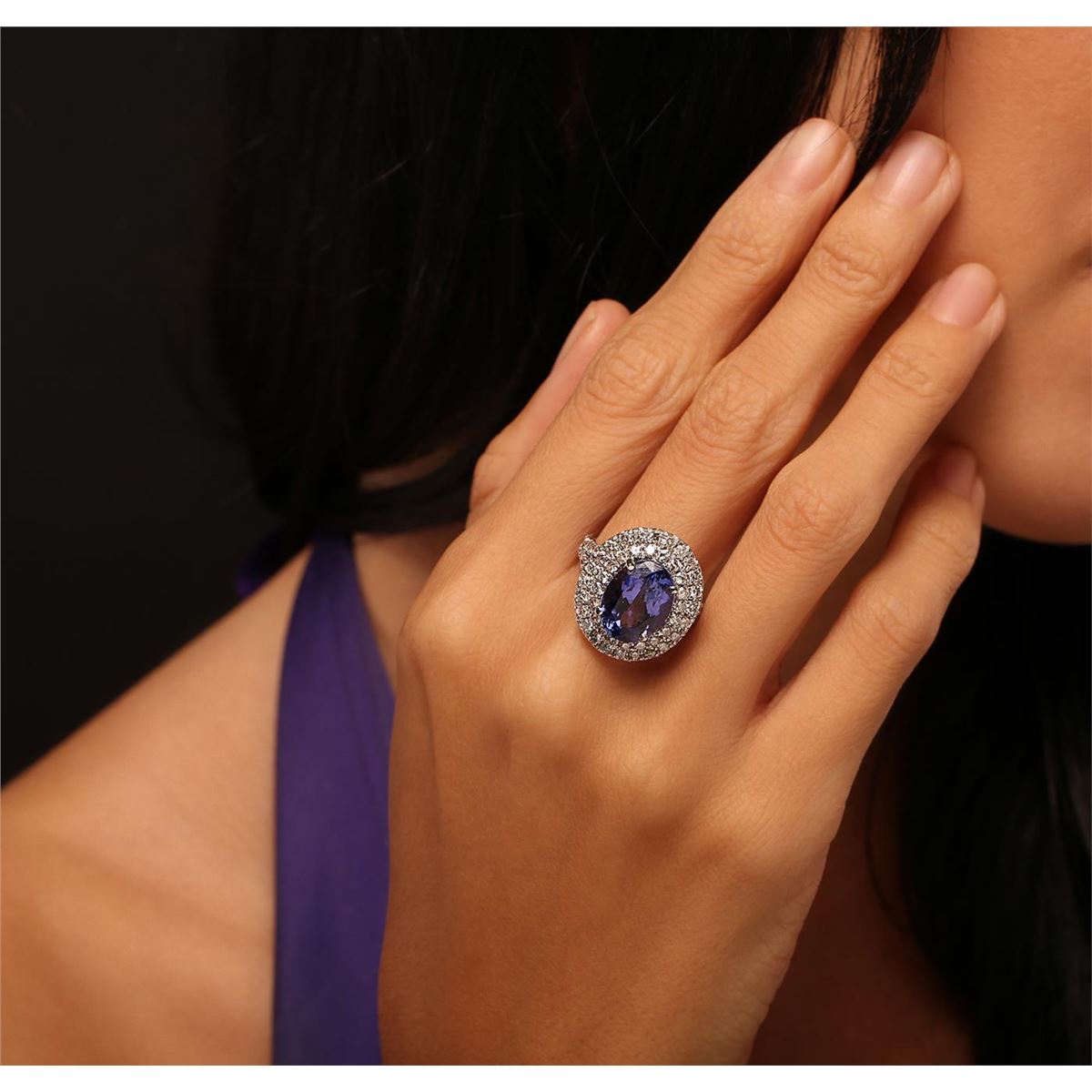 One electronically tested 14KT white gold Ladies combination cast & assembled ring with a bright polish finish. Condition is new. Identified with markings of "K14". Containing: One prong set oval modified brilliant cut natural tanzanite, measuring 12.41 x 9.64 x 6.50mm, approximate weight of 5.29ct., clarity is eye clean, type I, medium, very slightly grayish, bluish violet color, (GIA bV 5/3), cut is good. Colored gemstones are presumed to have been subjected to commonly used color/clarity enhancement processes. Seventy-Two prong set round brilliant cut diamonds, measuring 1.80 - 1.80 x 1.08mm (depth est.) approximate. Total Weight of 72 Stones = 1.53ct. Clarity: I-1 to I-2. Color: K - L, Cut is Good. Total Weight of Colored Stones 5.29ct. Total Weight of Diamonds 1.53ct. Total Weight of Ring 7.70 grams. GGL Appraised at $9,410.00.
