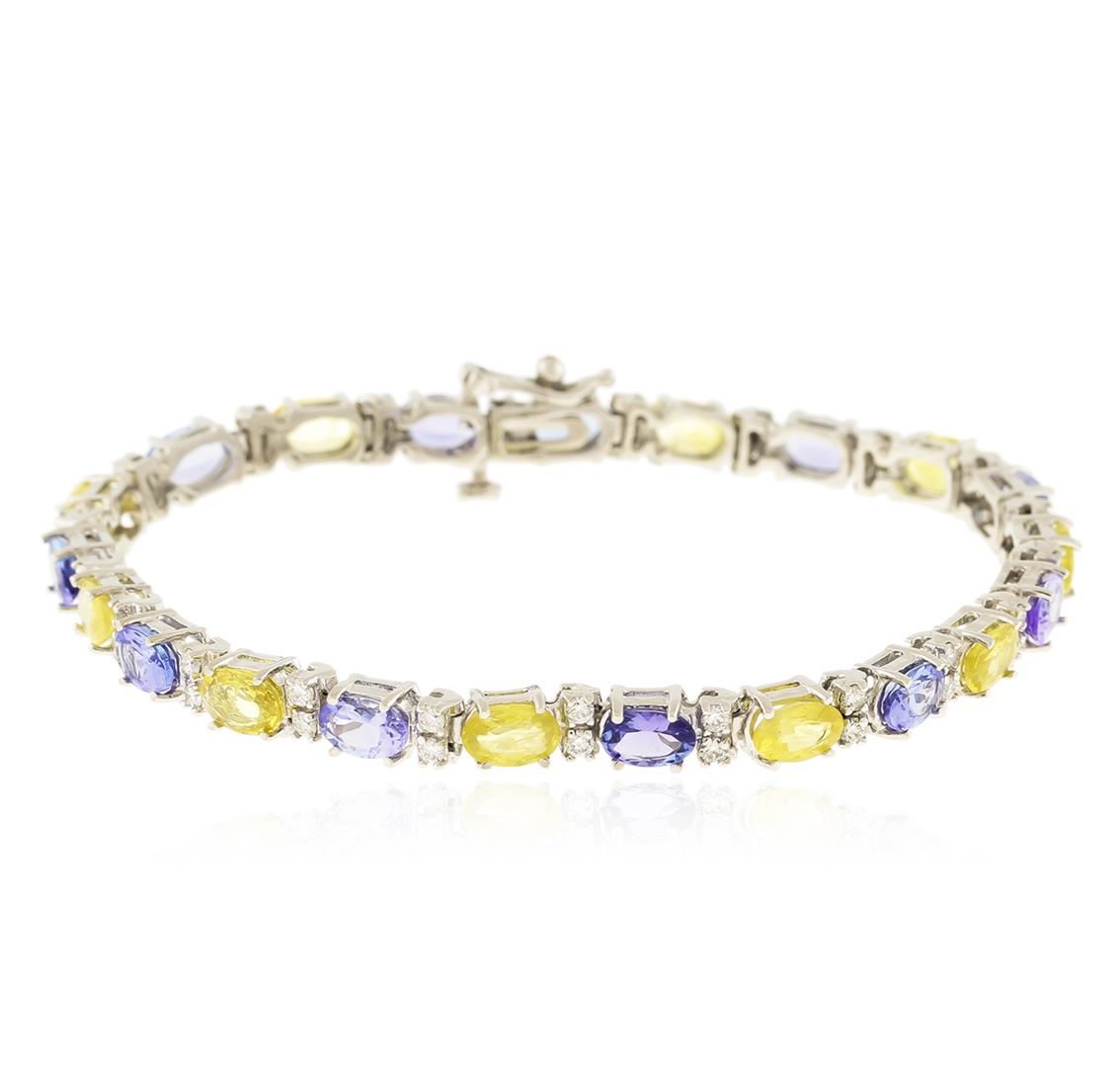 One electronically tested 14KT white gold ladies cast sapphire, tanzanite and diamond bracelet with a hidden box clasp with safety closer with a bright polish finish. Measurements: 6.75" in length. Identified with markings of "14K". Condition is new. Containing: Ten prong set oval modified brilliant cut natural yellow sapphires, measuring 5.80 x 4.10 x 2.67mm, approximate total weight of 5.30ct., clarity is slightly included, type II, medium light, brownish, yellow color, (GIA Y 4/3), cut is good. Eleven prong set oval modified brilliant cut natural tanzanites, measuring 5.80 x 4.10 x 2.67mm, approximate total weight of 4.95ct., clarity is eye clean, type I, medium light, very slightly grayish, violet color, (GIA V 4/3), cut is good. Forty-Two prong set round brilliant cut diamonds, measuring 1.30 - 1.30 x 0.78mm (depth est.) approximate total weight of 42 Stones = 0.34ct. Clarity: SI-1 to SI-2. Color: I - J, Cut is Good. Colored gemstones are presumed to have been subjected to commonly used enhancement processes. All diamonds and colored gemstones are graded in the mounting, unless otherwise stated. Total Weight of Colored Stones 10.25ct. Total Weight of Diamonds 0.34ct. Total Weight of Bracelet 13.00. grams. GGL Appraised at $4,265.00.