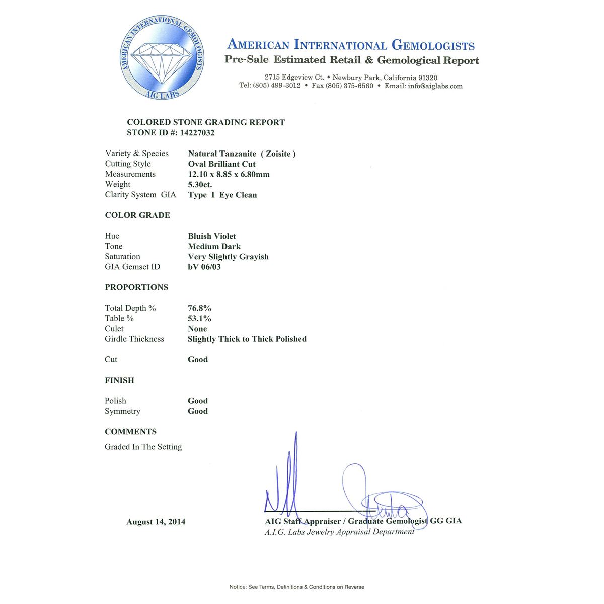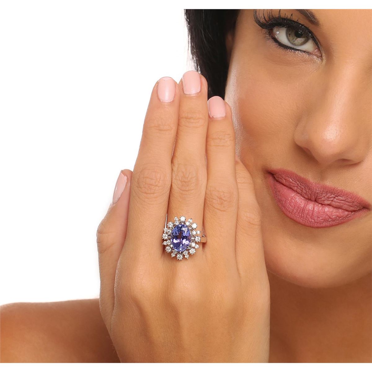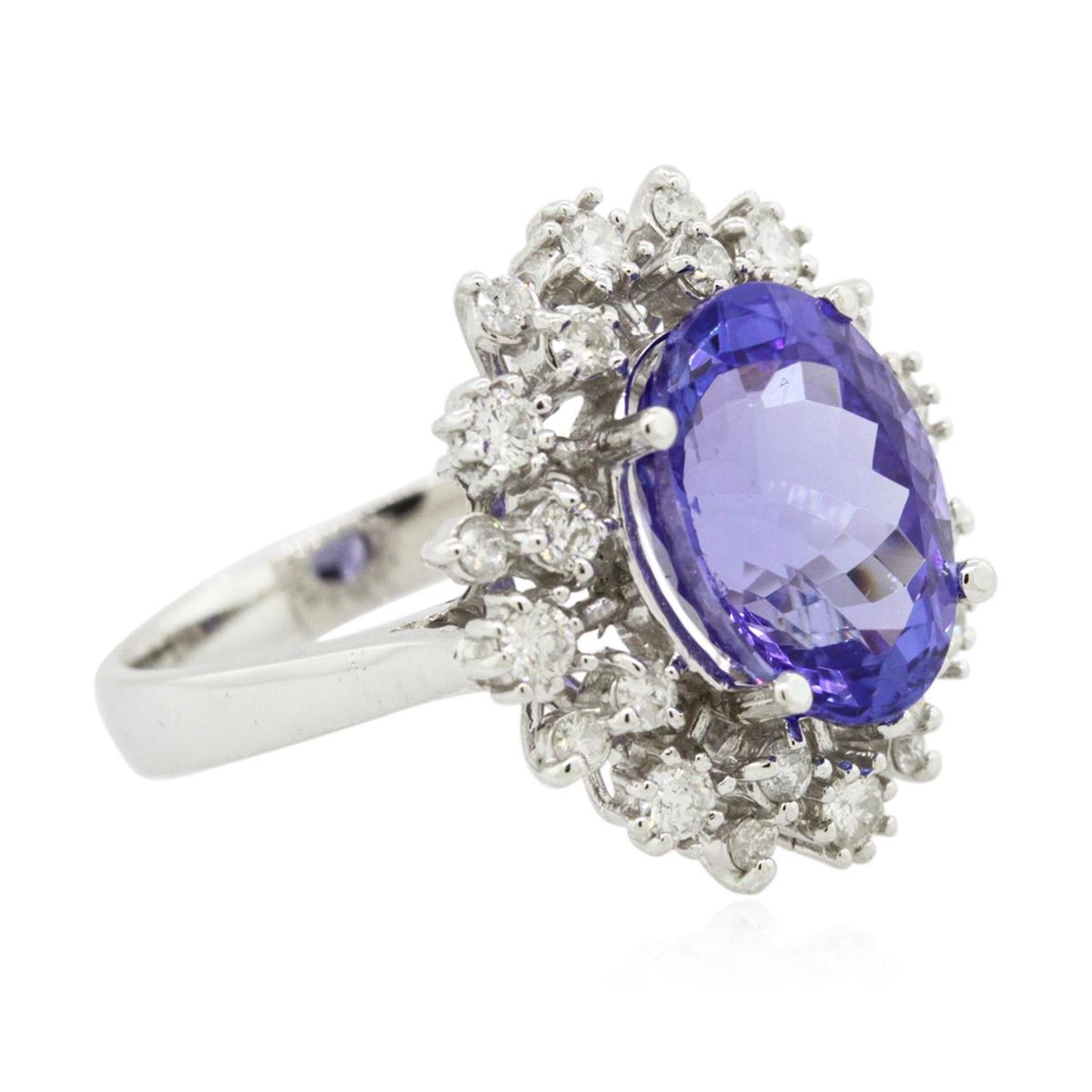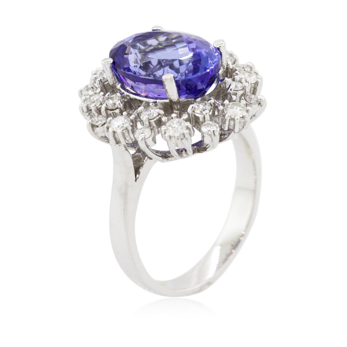 One electronically tested 14KT white gold ladies cast tanzanite and diamond ring with a bright polish finish. Condition is new, good workmanship. The featured tanzanite is set within a stylized diamond bezel, completed by a three millimeter wide band. Identified with markings of "K14". Containing: One prong set oval brilliant cut natural tanzanite, measuring 12.10 x 8.85 x 6.80mm, 6%. bulge factor, approximate weight of 5.30ct., clarity is eye clean, type I, medium dark, very slightly grayish, bluish violet color, (GIA bV 6/3), cut is good. Transmitting light with no distortion, transparent. Colored Stone Grading Report attached. Graded in the setting.Tanzanite is a very rare gemstone that is only found in the country of Tanzania. Originally discovered in 1967. Tiffany & Company, named the stone Tanzanite. It is found in the Usumburu Mountains that border the Umba Valley of northern Tanzania. Tanzanite occurs in gray, brown, violet, blue, reddish-purple, & green. The gem is interesting because of its exceptional pleochroism. Rotated in different directions a tanzanite will exhibit multiple changes of color. Tanzanite has a low tolerance to ultrasonic cleaning, and should not be cleaned using this method.Twenty-Four prong set round brilliant cut diamonds, measuring 2.20 - 1.80 x 1.20mm (depth est.) approximate. Total Weight of 24 Stones = 0.80ct. Graded in the setting. Clarity: I-1 to I-2. Color: G - I. Total Weight of Colored Stones 5.30ct. Total Weight of Diamonds 0.80ct. Total Weight of Ring 6.33gm. AIG Appraised at $16,055.00.