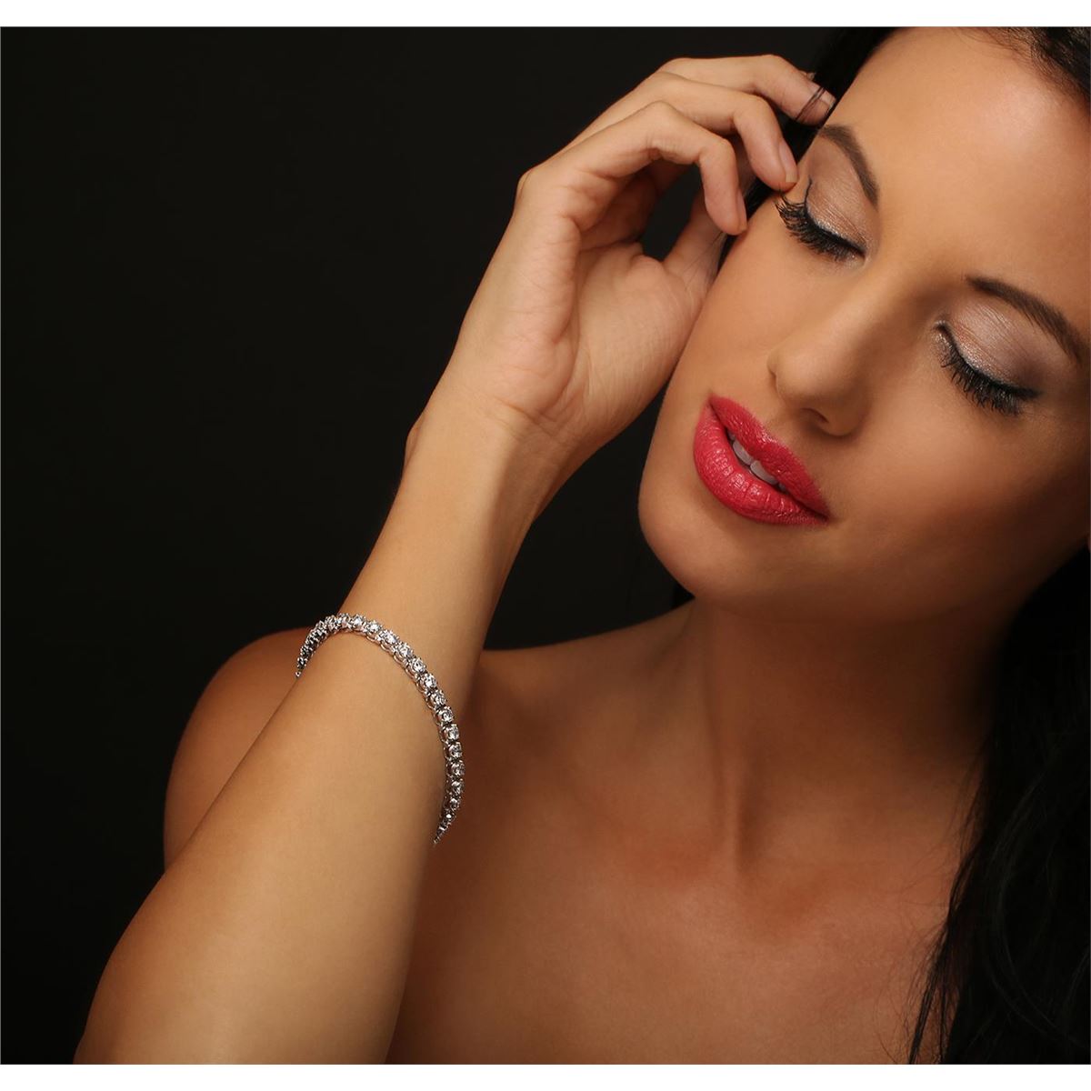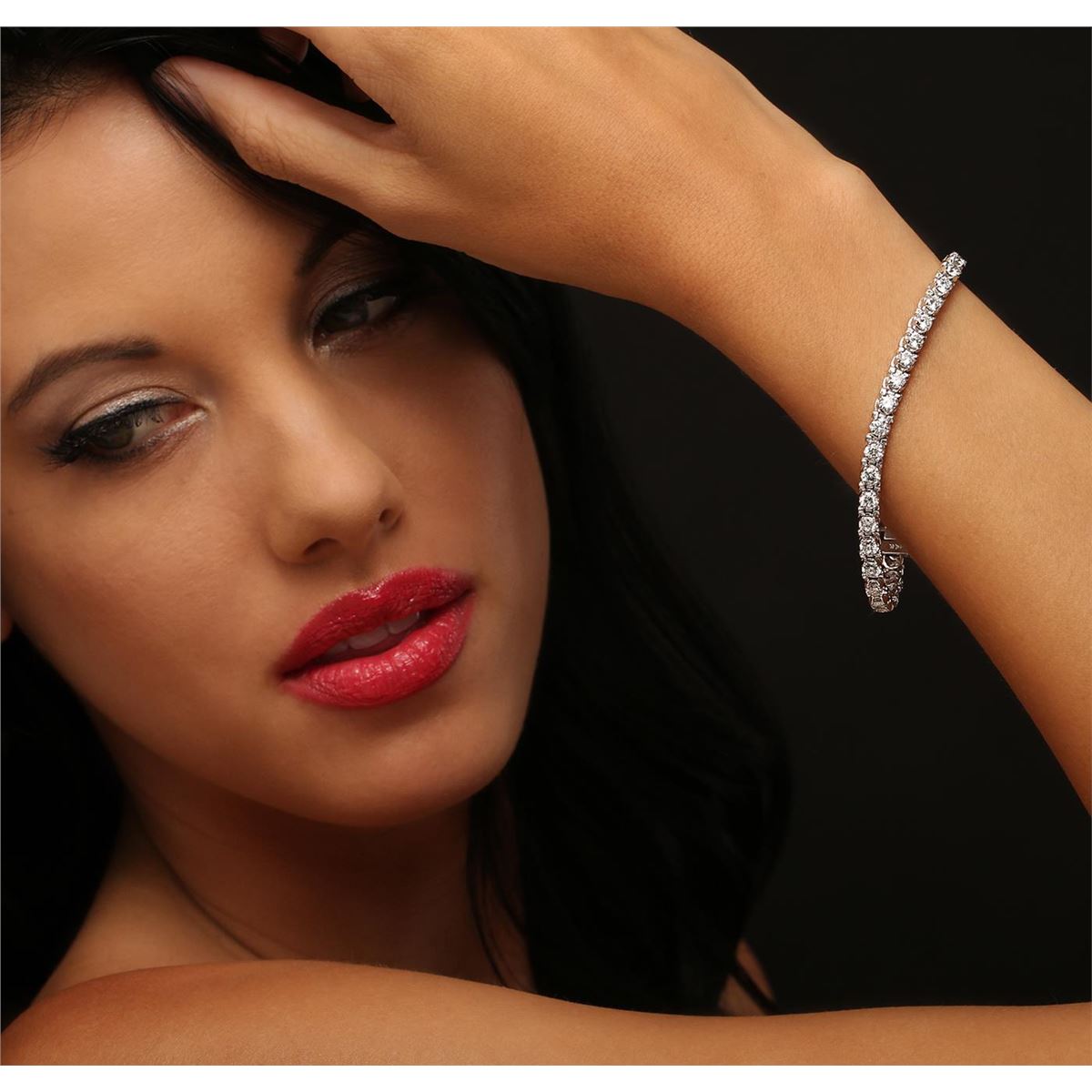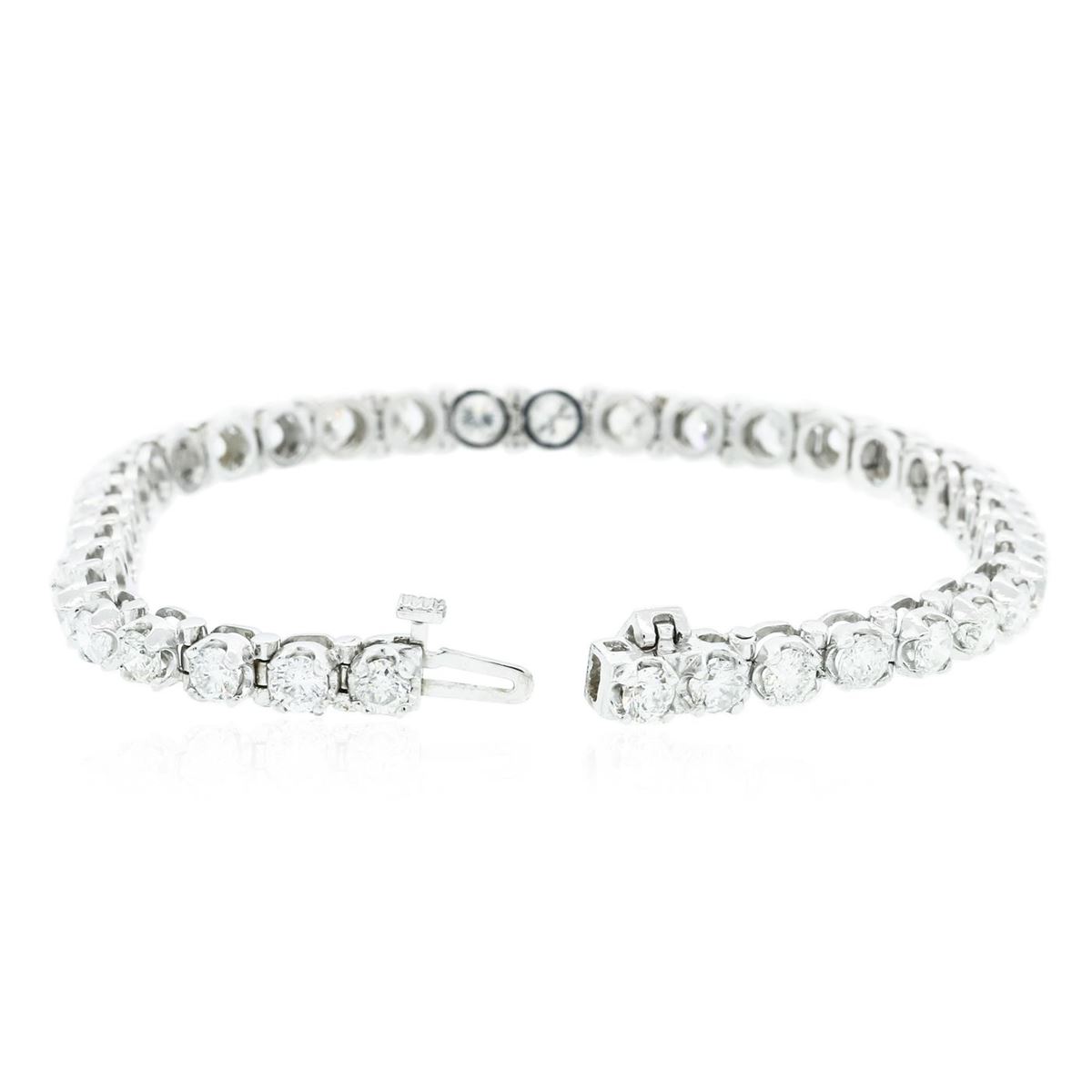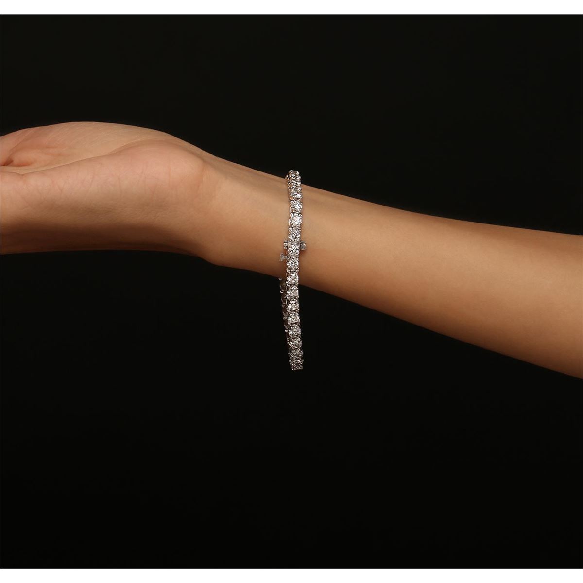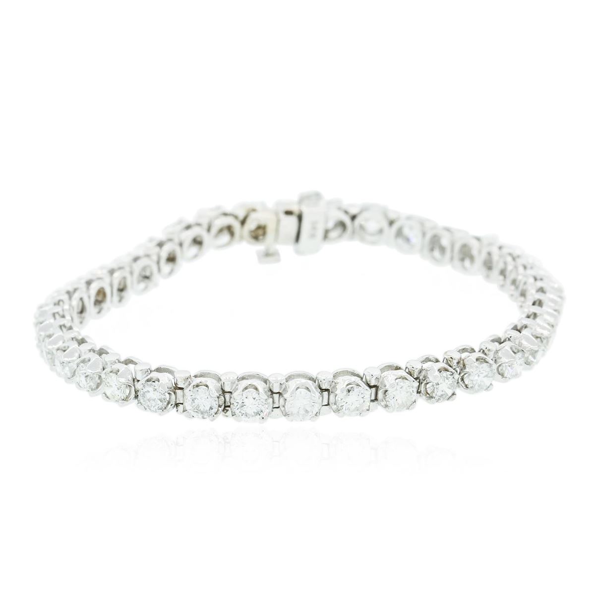 One electronically tested 14KT white gold ladies cast & assembled diamond tennis bracelet with a bright polish finish. Condition is new, good workmanship. Seven inch length bracelet composed of a flexible ribbon of diamonds, terminating in a concealed clasp with safety bar. Identified with markings of "14K". Tennis bracelets & necklaces got their unusual name from an incident involving the U.S. professional tennis player Chris Evert during a tennis match in the 1980's. Evert had been wearing an expensive diamond bracelet, an inline string of individually-set diamonds. Previously these bracelets were known as eternity bracelets. When the clasp snapped during play, she asked the officials to stop the tennis match until the bracelet could be found. Since that day, bracelets and necklaces featuring an inline string of diamonds have been called tennis bracelets and tennis necklaces. Containing: Thirty-Seven prong set round brilliant cut diamonds, measuring 3.40 - 3.35 x 2.03mm (depth est.) approximate total weight of 37 Stones = 5.33ct. Graded in the setting. Clarity: SI-2 to I-2. Color: G - I. Total Weight of Diamonds 5.33ct. Total Weight of Bracelet 13.60 grams. AIG Appraised at $15,800.00.