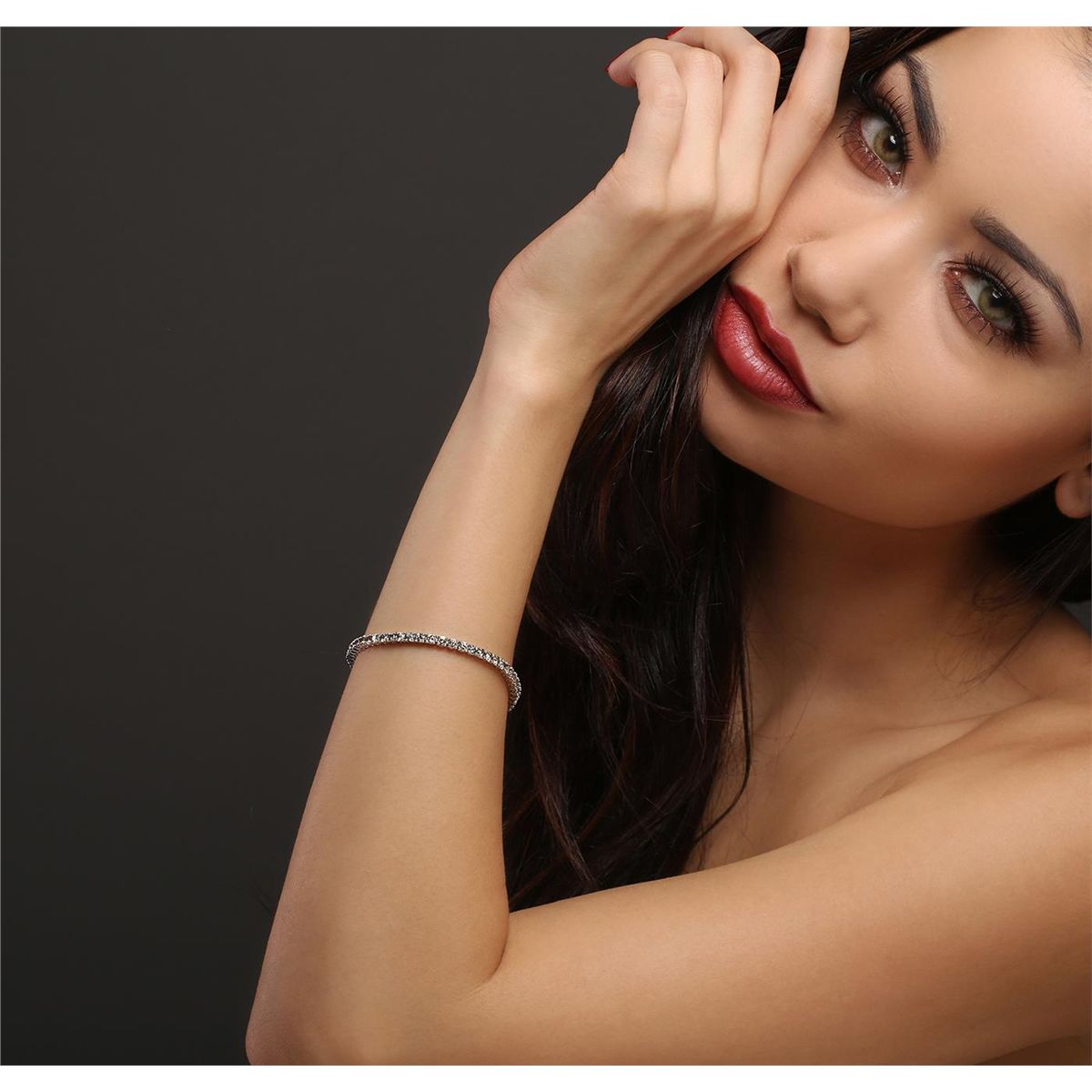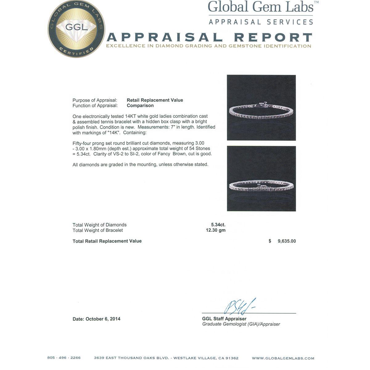 One electronically tested 14KT white gold ladies combination cast & assembled tennis bracelet with a hidden box clasp with a bright polish finish. Measurements: 7" in length. Identified with markings of "14K". Condition is new. Containing: Fifty-Four prong set round brilliant cut diamonds, measuring 3.00 - 3.00 x 1.80mm (depth est.) approximate total weight of 54 Stones = 5.34ct. Clarity: VS-2 to SI-2, Cut is Good. All diamonds are graded in the mounting, unless otherwise stated. Total Weight of Diamonds 5.34ct. Total Weight of Bracelet 12.30 grams. GGL Appraised at $9,635.00.