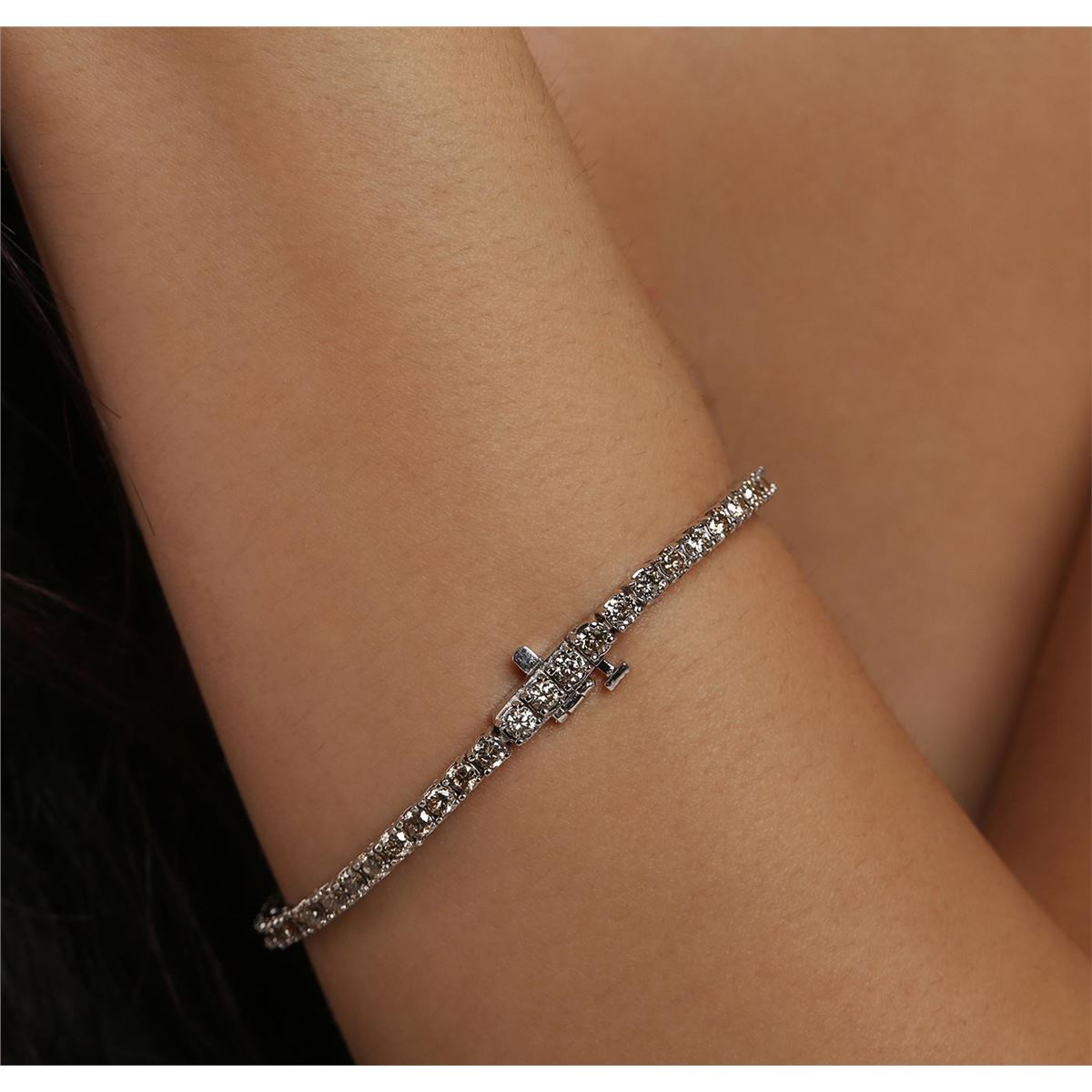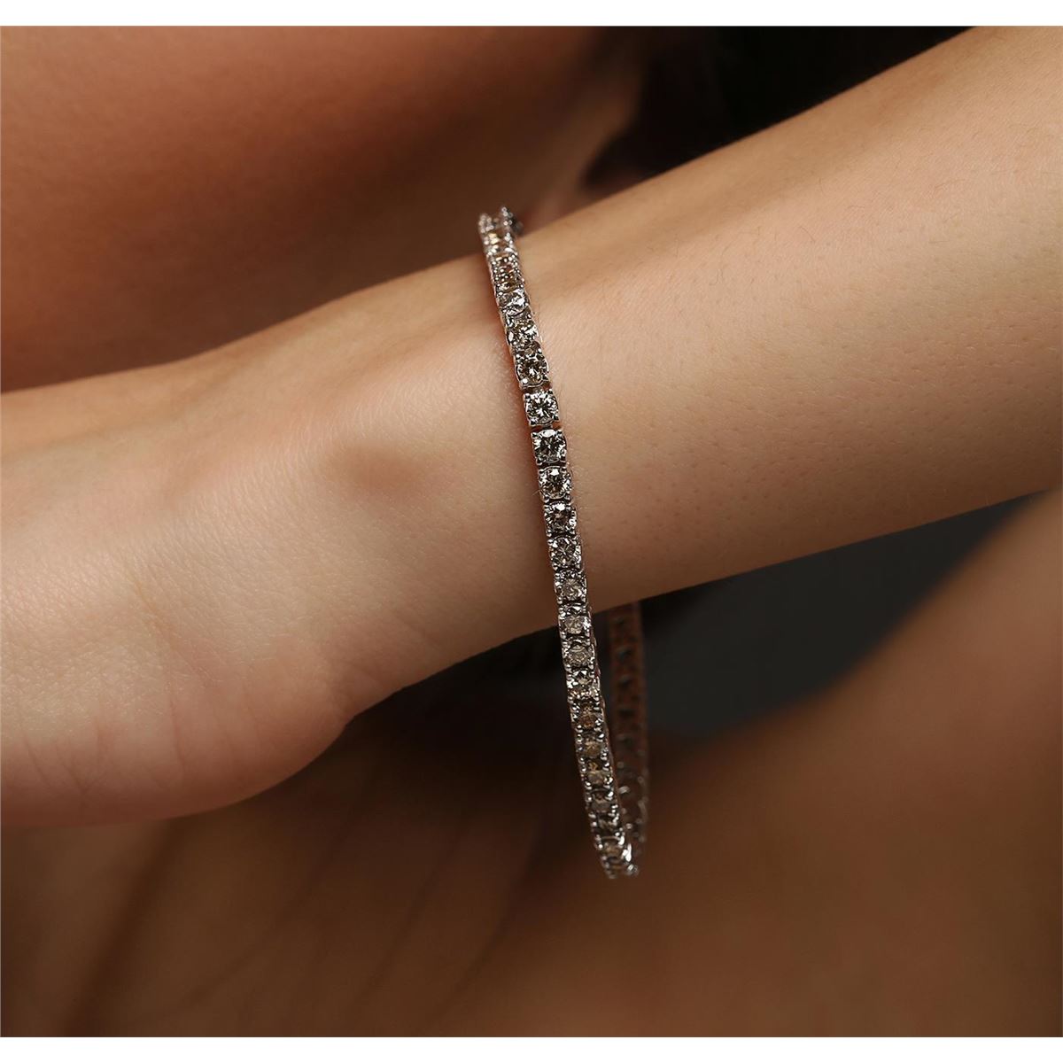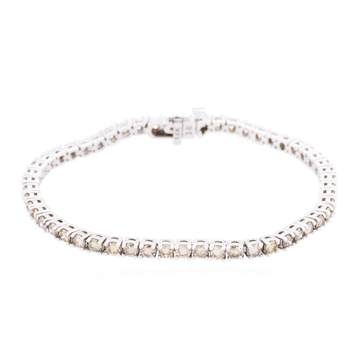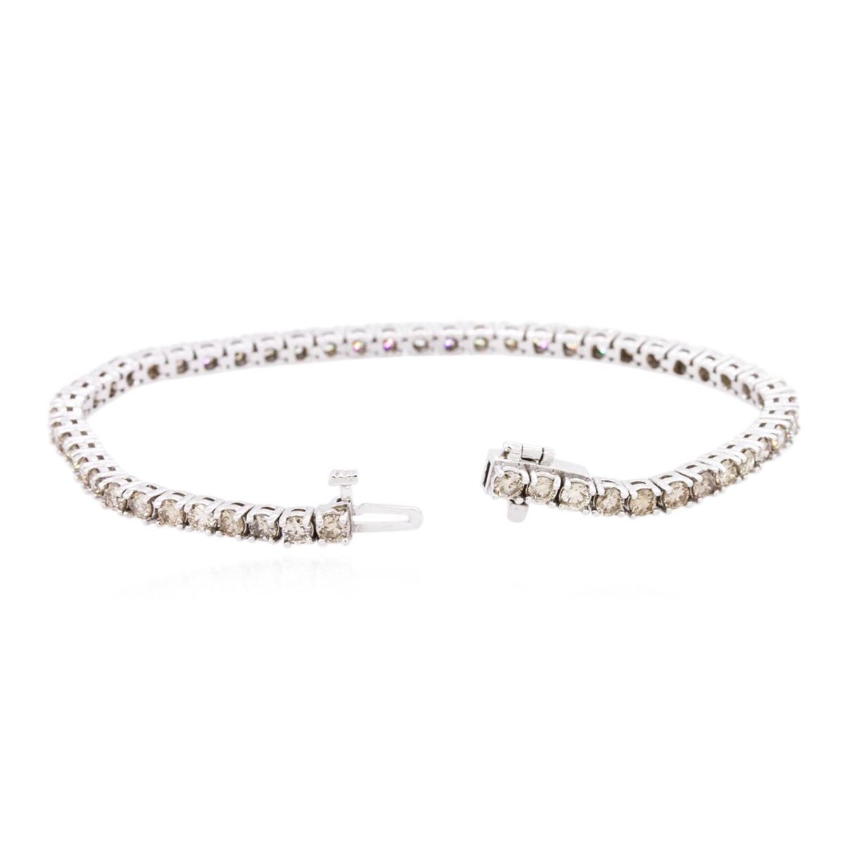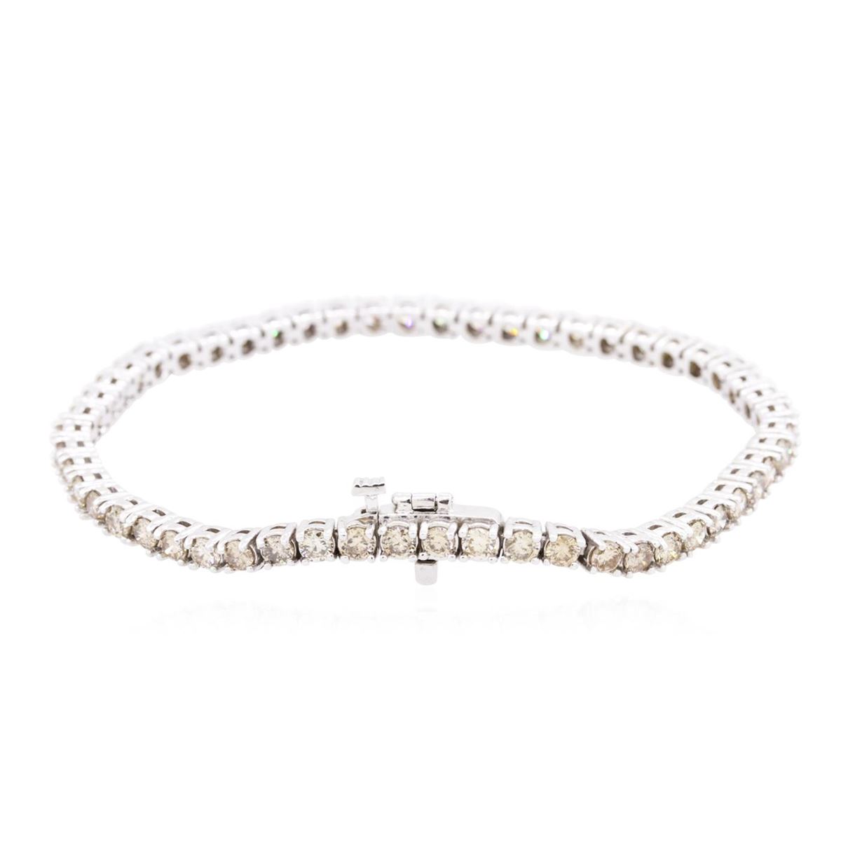 One electronically tested 14KT white gold ladies combination cast & assembled tennis bracelet with a hidden box clasp with a bright polish finish. Measurements: 7" in length. Identified with markings of "14K". Condition is new. Containing: Fifty-Four prong set round brilliant cut diamonds, measuring 3.00 - 3.00 x 1.80mm (depth est.) approximate total weight of 54 Stones = 5.34ct. Clarity: VS-2 to SI-2, Cut is Good. All diamonds are graded in the mounting, unless otherwise stated. Total Weight of Diamonds 5.34ct. Total Weight of Bracelet 12.30 grams. GGL Appraised at $9,635.00.