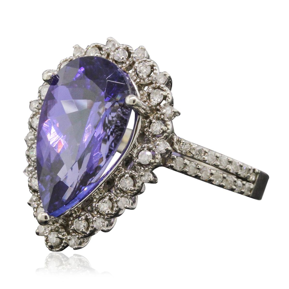 One electronically tested 14KT white gold ladies combination cast & assembled ring with a bright polish finish. Condition is new. Identified with markings of "K14". Containing: One prong set pear modified brilliant cut natural tanzanite, measuring 14.80 x 9.00 x 6.00mm, approximate weight of 5.35ct., clarity is eye clean, type I, medium light, moderately strong, bluish violet color, (GIA bV 4/4), cut is very good. Fifty-Seven prong set round brilliant cut diamonds, measuring 1.10 - 1.10 x 0.66mm (depth est.) approximate. Total Weight of 57 Stones = 0.27ct. Clarity: I-1 to I-2. Color: H - I, Cut is Good. Colored gemstones are presumed to have been subjected to commonly used enhancement processes. All diamonds and colored gemstones are graded in the mounting, unless otherwise stated. Total Weight of Colored Stones 5.35ct. Total Weight of Diamonds 0.27ct. Total Weight of Ring 6.30 grams. GGL Appraised at $10,415.00.