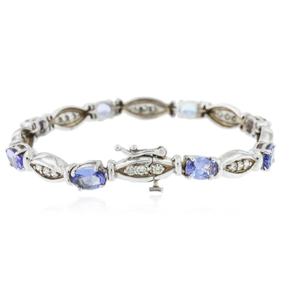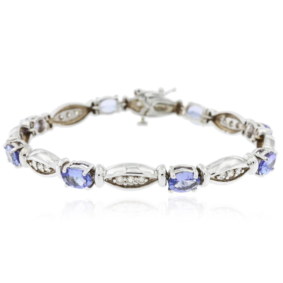 One electronically tested 14KT white gold Ladies combination cast & assembled fashion bracelet with a hidden box clasp with a high polish finish. Condition is new. Measurements: 6.75" in length. Identified with markings of "14K". Containing: Eight prong set oval modified mixed cut natural tanzanites, measuring 6.90 x 4.90 x 2.89mm, approximate. Total Weight of 5.36ct., clarity is eye clean, type I, medium light, very slightly grayish, violet color, (GIA V 4/3), cut is very good. Colored gemstones are presumed to have been subjected to commonly used color/clarity enhancement processes. Twenty-Four prong set round brilliant cut diamonds, measuring 2.00. - 2.00. x 1.20mm (depth est.) approximate. Total Weight of 24 Stones = 0.70ct. Clarity: SI-1 to SI-2. Color: I - J, Cut is Good. Total Weight of Colored Stones 5.36ct. Total Weight of Diamonds 0.70ct. Total Weight of Bracelet 16.60 grams. GGL Appraised at $10,500.00.