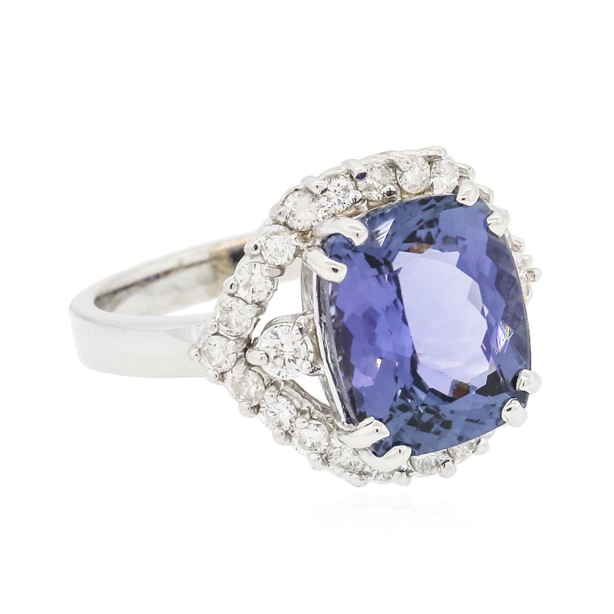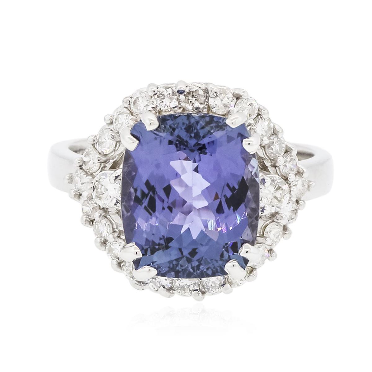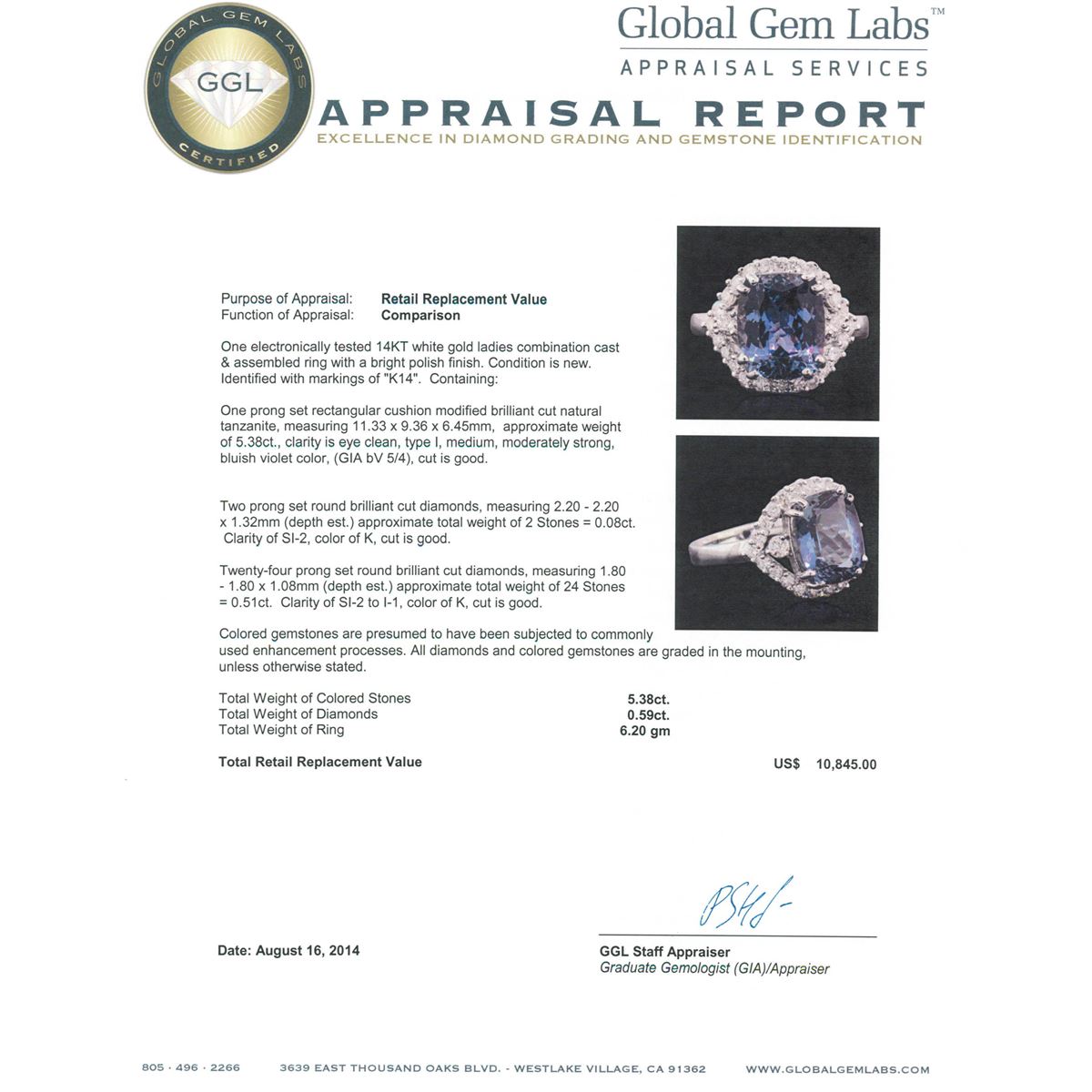 One electronically tested 14KT white gold ladies combination cast & assembled ring with a bright polish finish. Condition is new. Identified with markings of "K14". Containing: One prong set rectangular cushion modified brilliant cut natural tanzanite, measuring 11.33 x 9.36 x 6.45mm, approximate weight of 5.38ct., clarity is eye clean, type I, medium, moderately strong, bluish violet color, (GIA bV 5/4), cut is good. Two prong set round brilliant cut diamonds, measuring 2.20 - 2.20 x 1.32mm (depth est.) approximate. Total Weight of 2 Stones = 0.08ct. Clarity: SI-2. Color: K, Cut is Good. Twenty-Four prong set round brilliant cut diamonds, measuring 1.80 - 1.80 x 1.08mm (depth est.) approximate. Total Weight of 24 Stones = 0.51ct. Clarity: SI-2 to I-1. Color: K, Cut is Good. Colored gemstones are presumed to have been subjected to commonly used enhancement processes. All diamonds and colored gemstones are graded in the mounting, unless otherwise stated. Total Weight of Colored Stones 5.38ct. Total Weight of Diamonds 0.59ct. Total Weight of Ring 6.20 grams. GGL Appraised at $10,845.00.