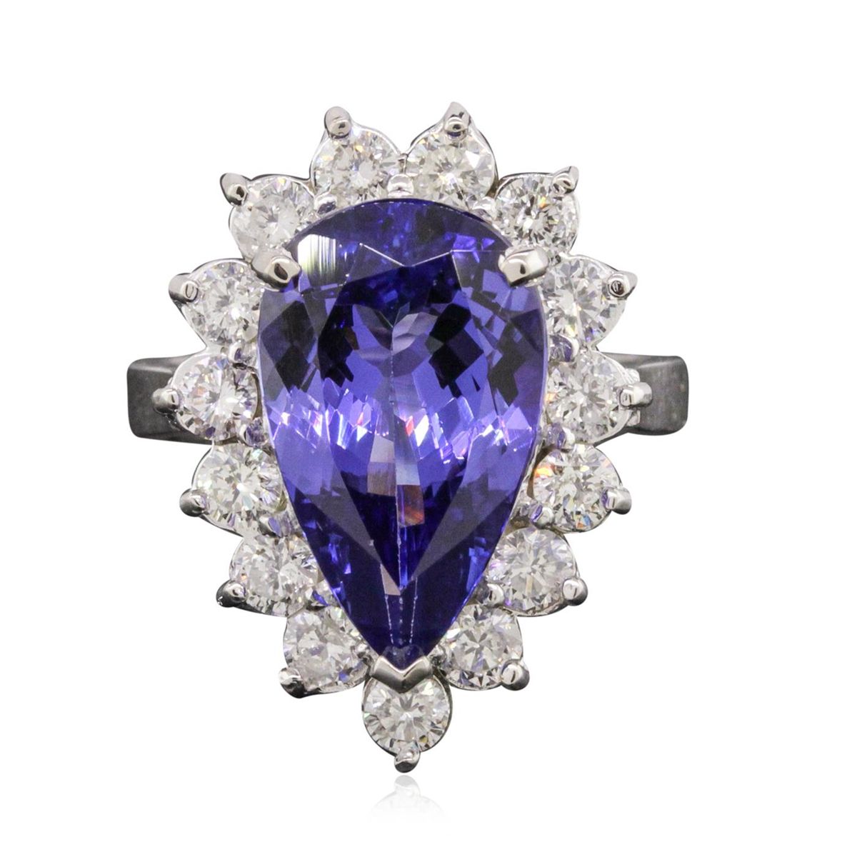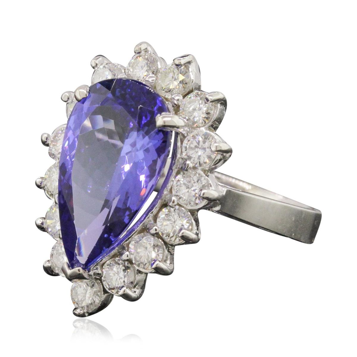 One electronically tested 14KT white gold ladies combination cast & assembled ring with a bright polish finish. Condition is new. Identified with markings of "K14". Containing: One prong set pear modified brilliant cut natural tanzanite, measuring 15.30 x 9.54 x 5.50mm, approximate weight of 5.38ct., clarity is eye clean, type I, medium, moderately strong, violetish blue color, (GIA vB 5/4), cut is good. Fifteen prong set round brilliant cut diamonds, measuring 3.00 - 3.00 x 1.80mm (depth est.) approximate. Total Weight of 15 Stones = 1.48ct. Clarity: SI-2 to I-1. Color: J - K, Cut is Good. Colored gemstones are presumed to have been subjected to commonly used enhancement processes. All diamonds and colored gemstones are graded in the mounting, unless otherwise stated. Total Weight of Colored Stones 5.38ct. Total Weight of Diamonds 1.48ct. Total Weight of Ring 7.10 grams. GGL Appraised at $12,470.00.