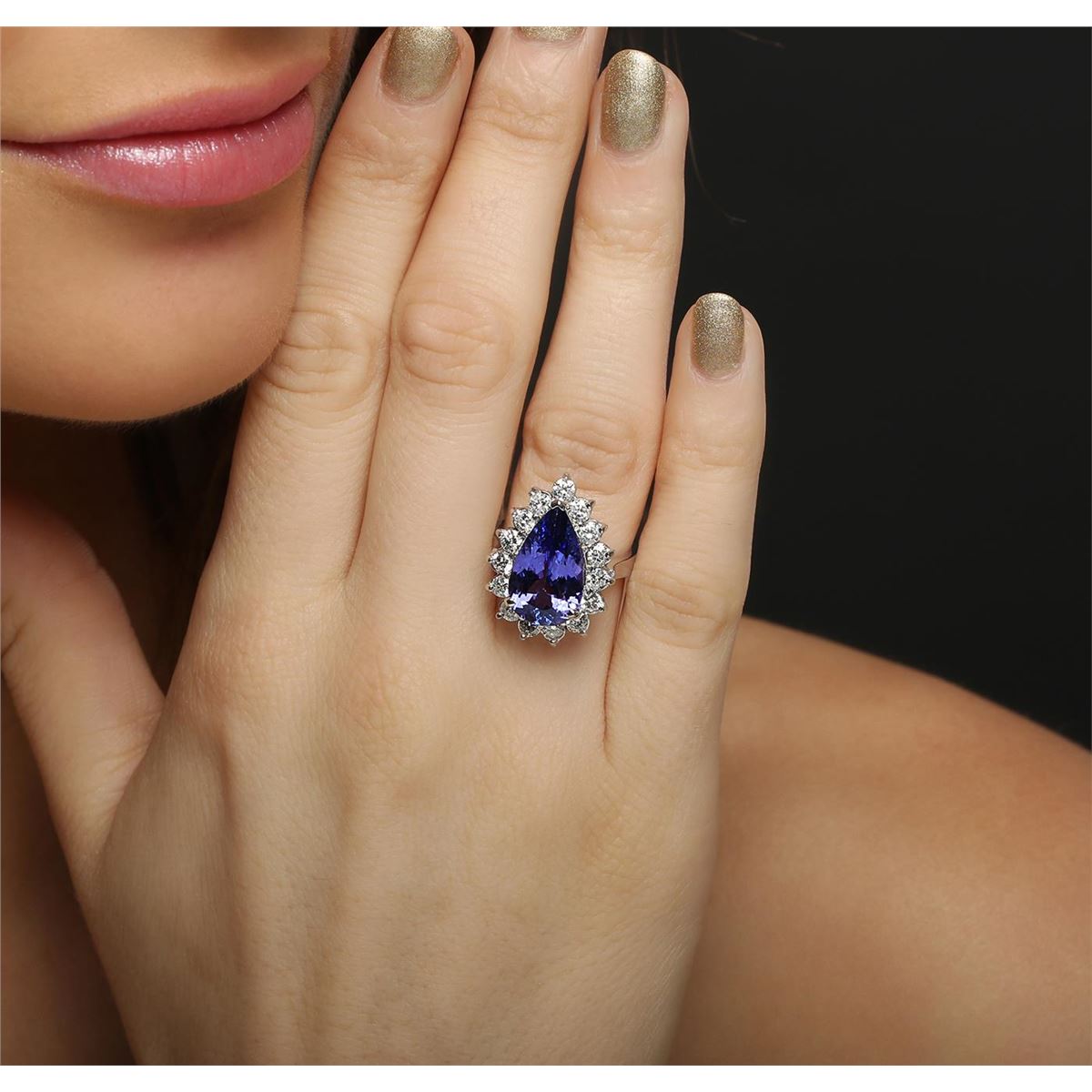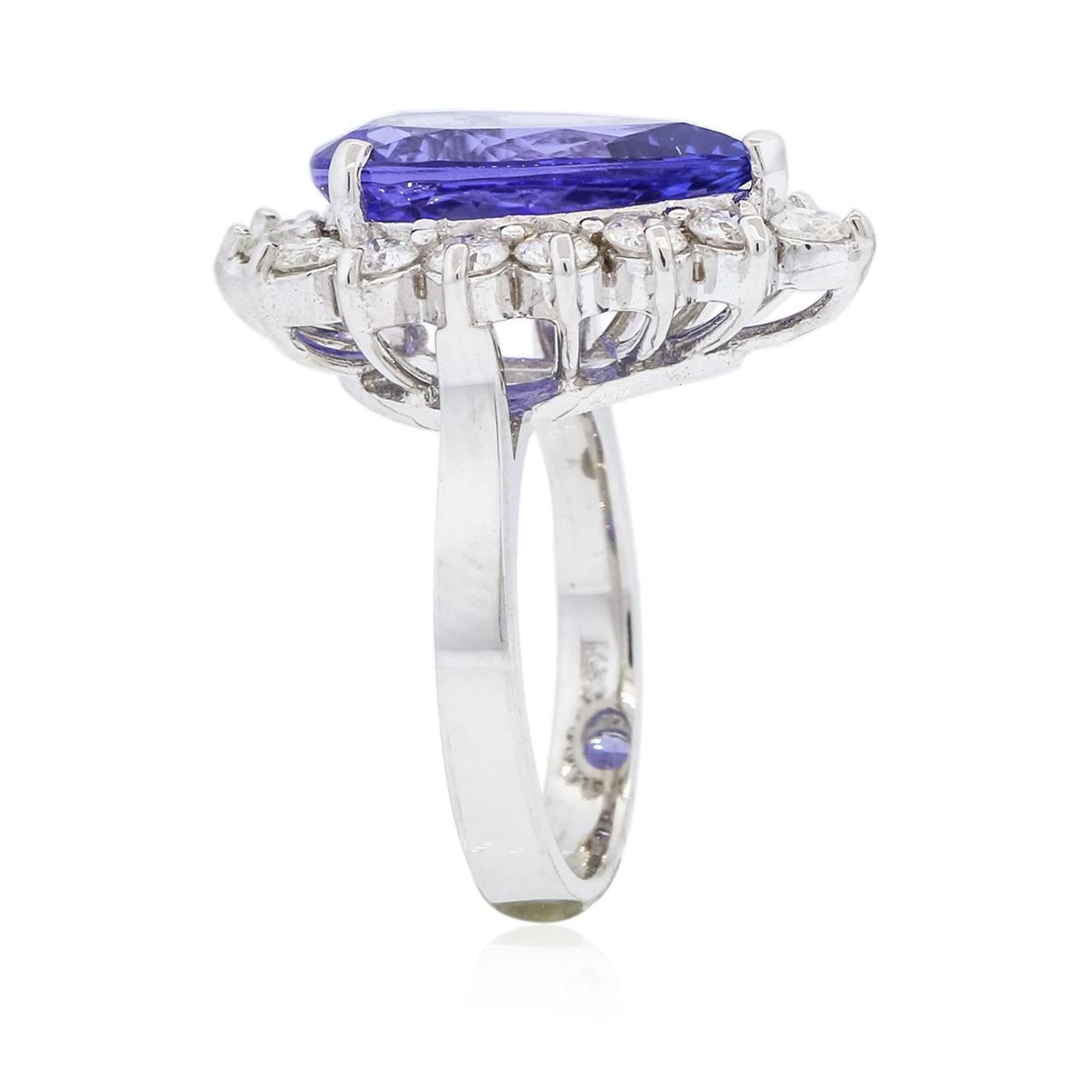 One electronically tested 14KT white gold ladies combination cast & assembled ring with a bright polish finish. Condition is new. Identified with markings of "K14". Containing: One prong set pear modified brilliant cut natural tanzanite, measuring 15.30 x 9.54 x 5.50mm, approximate weight of 5.38ct., clarity is eye clean, type I, medium, moderately strong, violetish blue color, (GIA vB 5/4), cut is good. Fifteen prong set round brilliant cut diamonds, measuring 3.00 - 3.00 x 1.80mm (depth est.) approximate. Total Weight of 15 Stones = 1.48ct. Clarity: SI-2 to I-1. Color: J - K, Cut is Good. Colored gemstones are presumed to have been subjected to commonly used enhancement processes. All diamonds and colored gemstones are graded in the mounting, unless otherwise stated. Total Weight of Colored Stones 5.38ct. Total Weight of Diamonds 1.48ct. Total Weight of Ring 7.10 grams. GGL Appraised at $12,470.00.