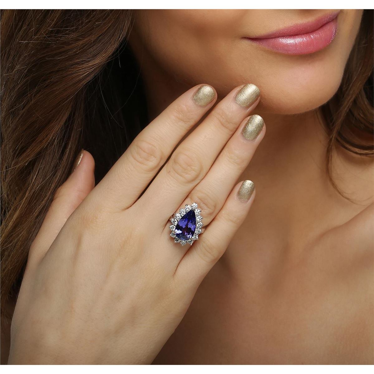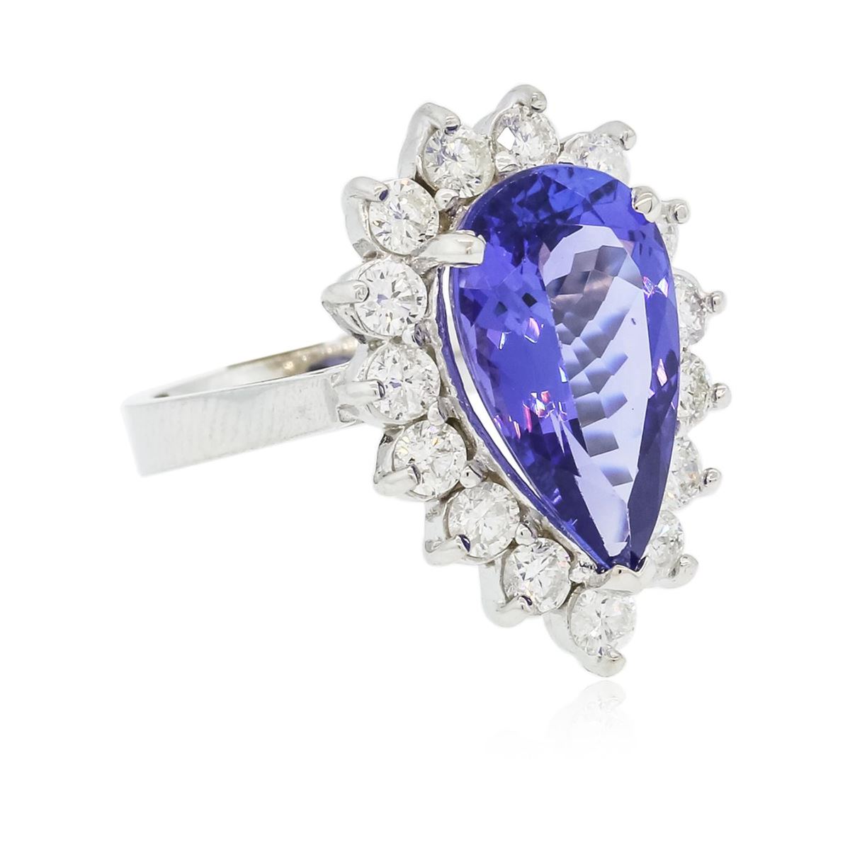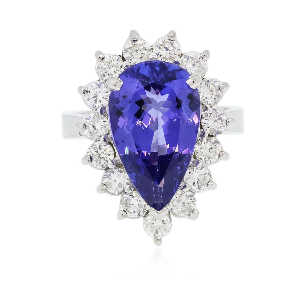 One electronically tested 14KT white gold ladies combination cast & assembled ring with a bright polish finish. Condition is new. Identified with markings of "K14". Containing: One prong set pear modified brilliant cut natural tanzanite, measuring 15.30 x 9.54 x 5.50mm, approximate weight of 5.38ct., clarity is eye clean, type I, medium, moderately strong, violetish blue color, (GIA vB 5/4), cut is good. Fifteen prong set round brilliant cut diamonds, measuring 3.00 - 3.00 x 1.80mm (depth est.) approximate. Total Weight of 15 Stones = 1.48ct. Clarity: SI-2 to I-1. Color: J - K, Cut is Good. Colored gemstones are presumed to have been subjected to commonly used enhancement processes. All diamonds and colored gemstones are graded in the mounting, unless otherwise stated. Total Weight of Colored Stones 5.38ct. Total Weight of Diamonds 1.48ct. Total Weight of Ring 7.10 grams. GGL Appraised at $12,470.00.