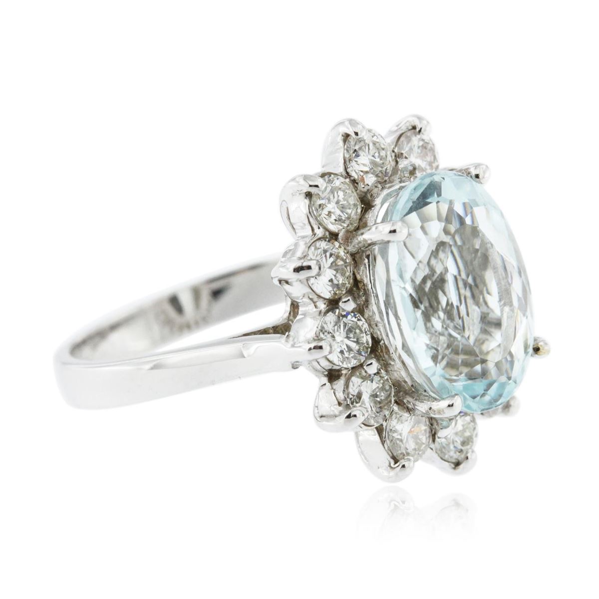 One electronically tested 14KT white gold ladies cast blue topaz and diamond ring with a bright polish finish. Condition is new, good workmanship. The featured topaz is set within a diamond bezel completed by a three millimeter wide band. Identified with markings of "K14". Containing: One prong set oval mixed cut natural blue topaz, measuring 12.10 x 9.10 x 6.00mm, 6% bulge factor, exact weight 5.42ct, clarity is eye clean, type I, medium light, very slightly grayish, very slightly greenish blue color, (GIA vslgB 4/3), cut is good. Transmitting light with no distortion, transparent. Refractive index testing results of 1.61 to 1.62. This is a conclusive result for topaz. Graded loose. A deposit of a thin layer has been applied to the topaz to produce the intense color effect. The process utilizes a very high temperature treatment, diffusion of ions into the topaz, plus in some cases neutron bombardment has been used to create the color center. Diffusion processes causes the added ions to become part of the crystal surface with no distinct boundary. Do not put a gem treated in this manner into an ultrasonic cleaner. Twelve prong set round brilliant cut diamonds, measuring 2.90 - 2.80 x 1.74mm (depth est.) approximate. Total Weight of 12 Stones = 1.13ct. Graded in the setting. Clarity: SI-1 to SI-2. Color: G - I. Total Weight of Colored Stones 5.42ct. Total Weight of Diamonds 1.13ct. Total Weight of Ring 6.02 grams. AIG Appraised at $4,910.00.