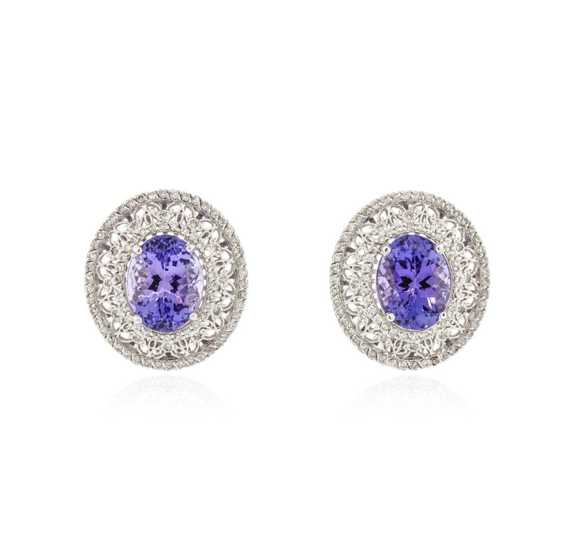 One suite electronically tested 14KT white gold ladies cast tanzanite and diamond earrings with Omega clip backs with a bright polish finish. Identified with markings of "14K". Condition is new. Containing: Two prong set oval modified brilliant cut natural tanzanites, measuring 10.00 x 7.70 x 5.01mm, approximate total weight of 5.42ct., clarity is eye clean, type I, medium light, moderately strong, violet color, (GIA V 4/4), cut is good. One Hundred Seventy-Six prong set round brilliant cut diamonds, measuring 1.00 - 1.00 x 0.60mm (depth est.) approximate total weight of 176 Stones = 0.63ct. Clarity: I-1 to I-2. Color: H - I. Colored gemstones are presumed to have been subjected to commonly used enhancement processes. All diamonds and colored gemstones are graded in the mounting, unless otherwise stated. Total Weight of Colored Stones 5.42ct. Total Weight of Diamonds 0.63ct. Total Weight of Earrings 8.30 grams. GGL Appraised at $5,470.00.