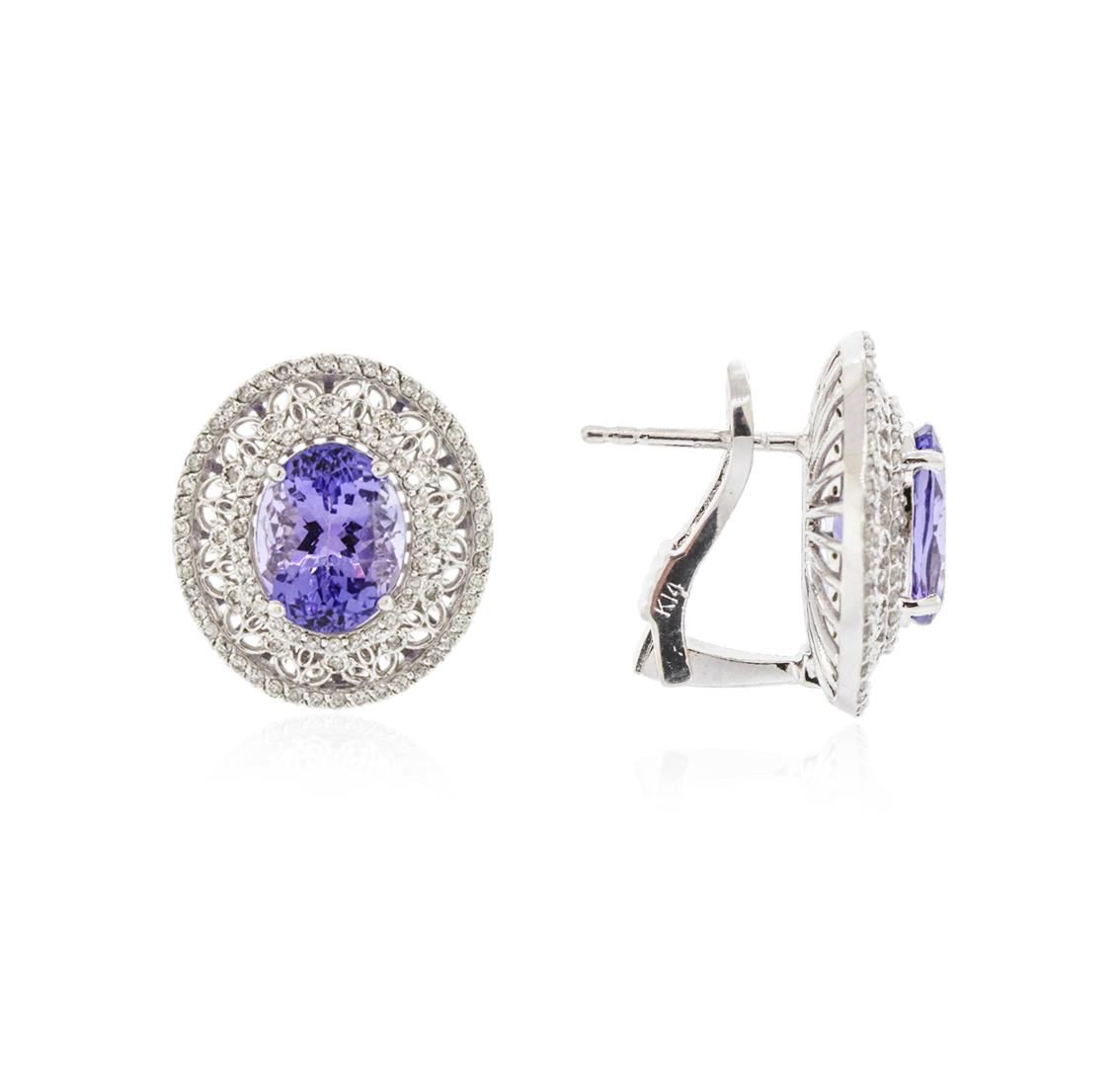 One suite electronically tested 14KT white gold ladies cast tanzanite and diamond earrings with Omega clip backs with a bright polish finish. Identified with markings of "14K". Condition is new. Containing: Two prong set oval modified brilliant cut natural tanzanites, measuring 10.00 x 7.70 x 5.01mm, approximate total weight of 5.42ct., clarity is eye clean, type I, medium light, moderately strong, violet color, (GIA V 4/4), cut is good. One Hundred Seventy-Six prong set round brilliant cut diamonds, measuring 1.00 - 1.00 x 0.60mm (depth est.) approximate total weight of 176 Stones = 0.63ct. Clarity: I-1 to I-2. Color: H - I. Colored gemstones are presumed to have been subjected to commonly used enhancement processes. All diamonds and colored gemstones are graded in the mounting, unless otherwise stated. Total Weight of Colored Stones 5.42ct. Total Weight of Diamonds 0.63ct. Total Weight of Earrings 8.30 grams. GGL Appraised at $5,470.00.