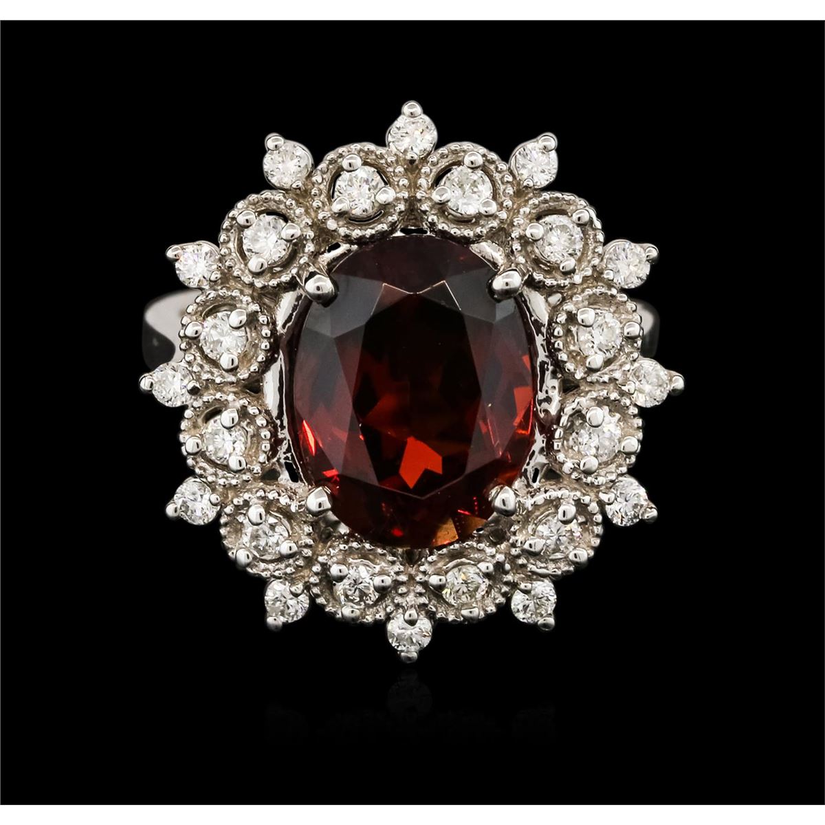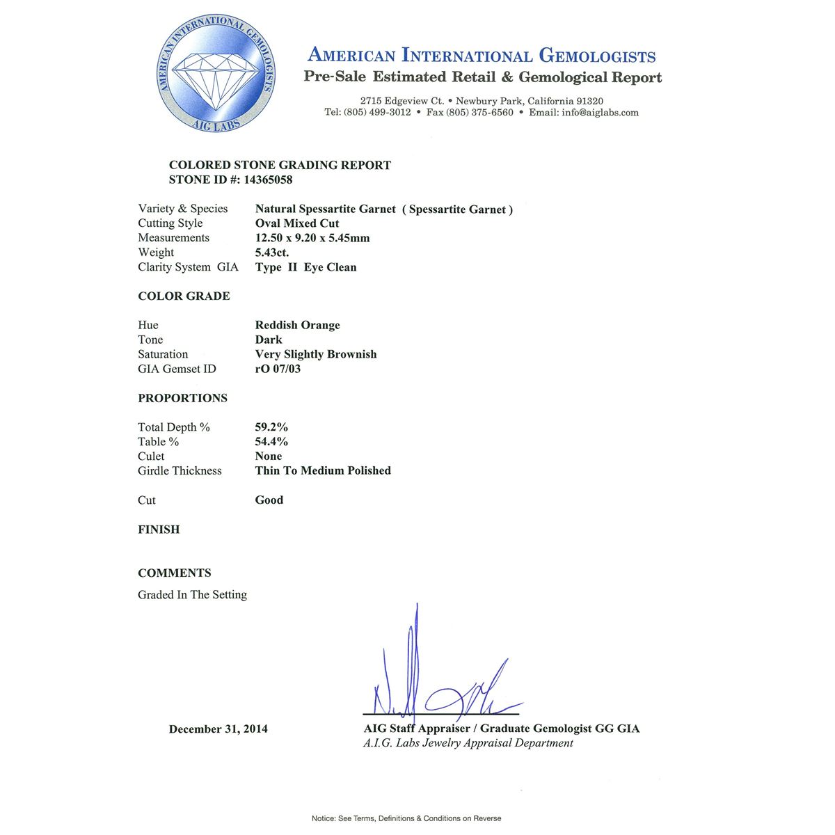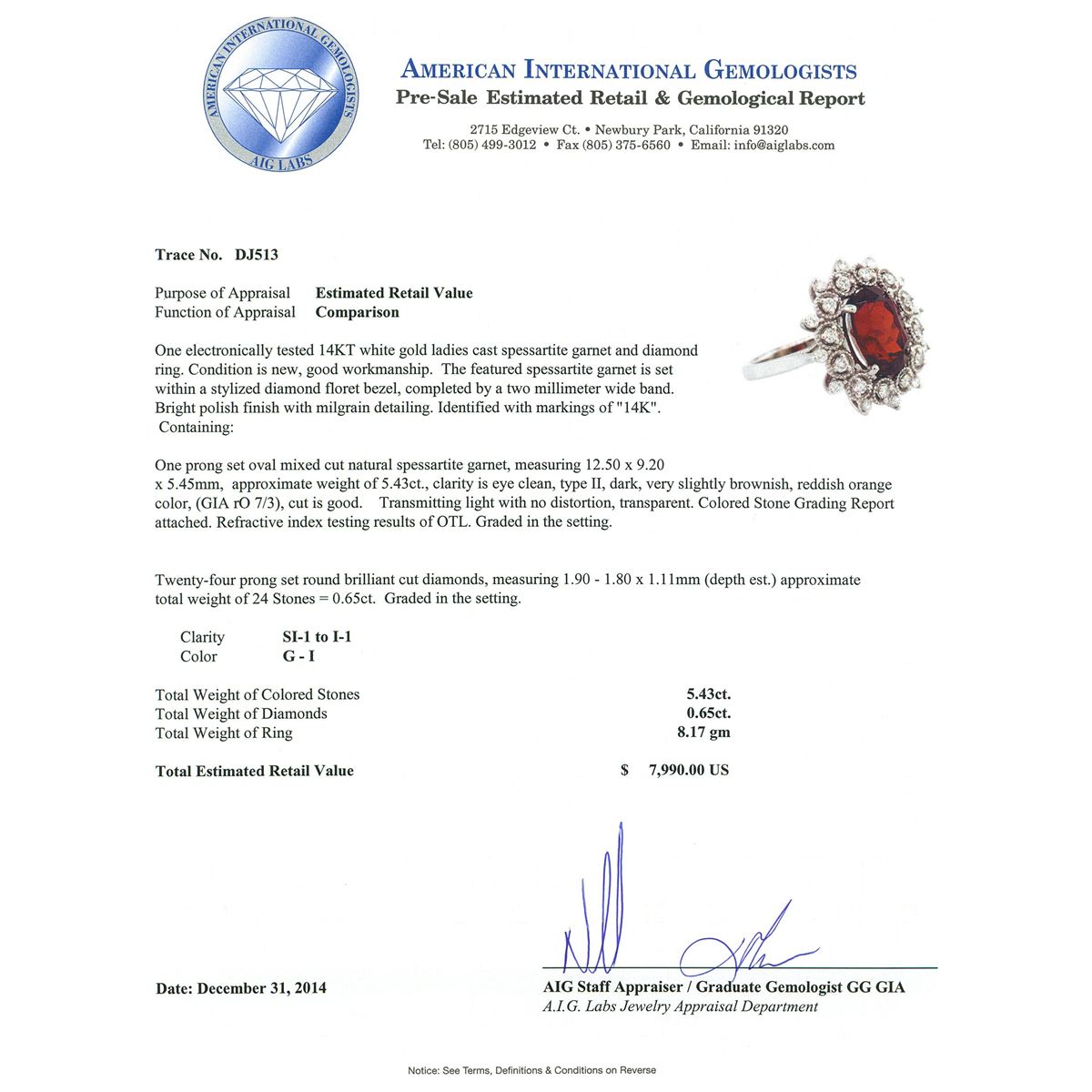 One electronically tested 14KT white gold ladies cast spessartite garnet and diamond ring. The featured spessartite garnet is set within a stylized diamond floret bezel, completed by a two millimeter wide band. Bright polish finish with milgrain detailing. Identified with markings of "14K". Condition is new, good workmanship. Containing: One prong set oval mixed cut natural spessartite garnet, measuring 12.50 x 9.20 x 5.45mm, approximate weight of 5.43ct., clarity is eye clean, type II, dark, very slightly brownish, reddish orange color, (GIA rO 7/3), cut is good. Transmitting light with no distortion, transparent. Colored Stone Grading Report attached. Refractive index testing results of OTL. Graded in the setting. Twenty-Four prong set round brilliant cut diamonds, measuring 1.90 - 1.80 x 1.11mm (depth est.) approximate total weight of 24 Stones = 0.65ct. Graded in the setting. Clarity: SI-1 to I-1. Color: G - I. Total Weight of Colored Stones 5.43ct. Total Weight of Diamonds 0.65ct. Total Weight of Ring 8.17 grams. AIG Appraised at $7,990.00.
