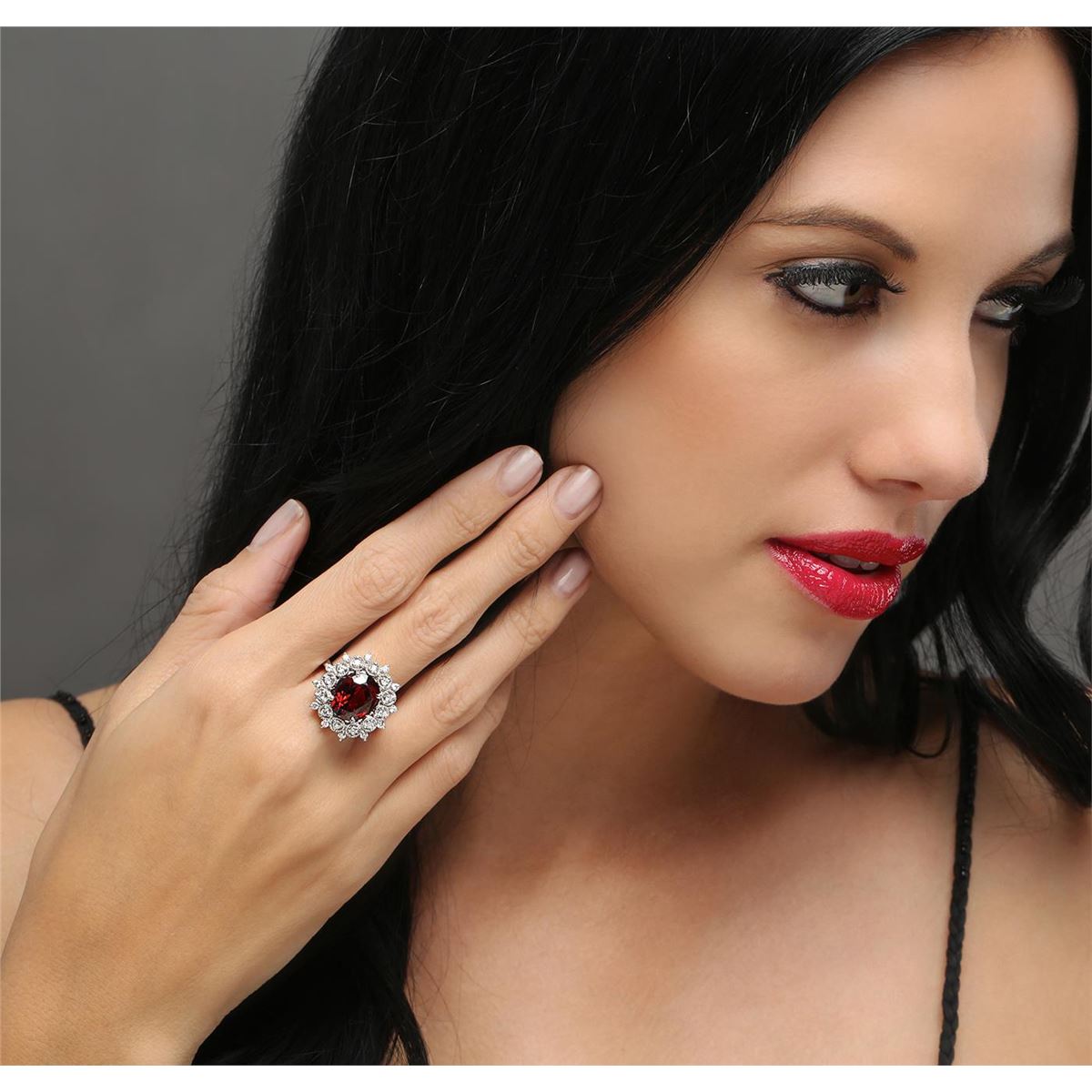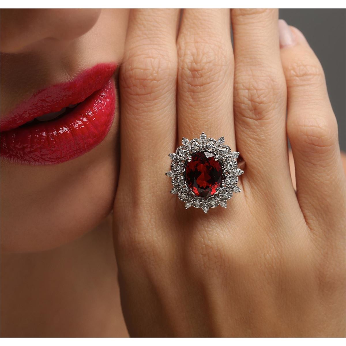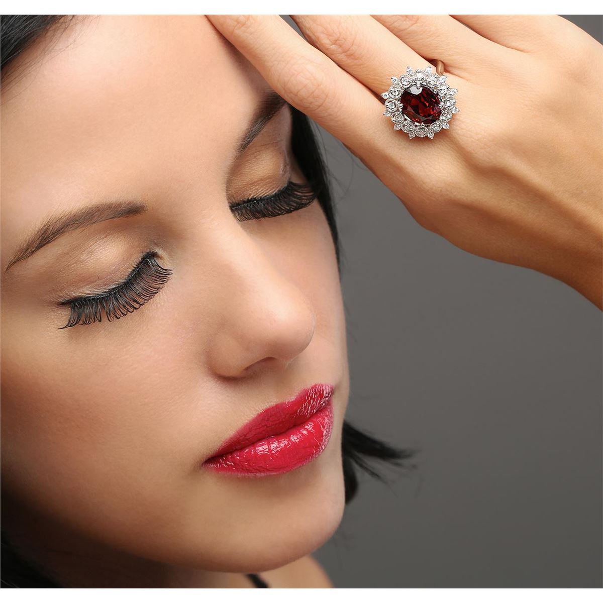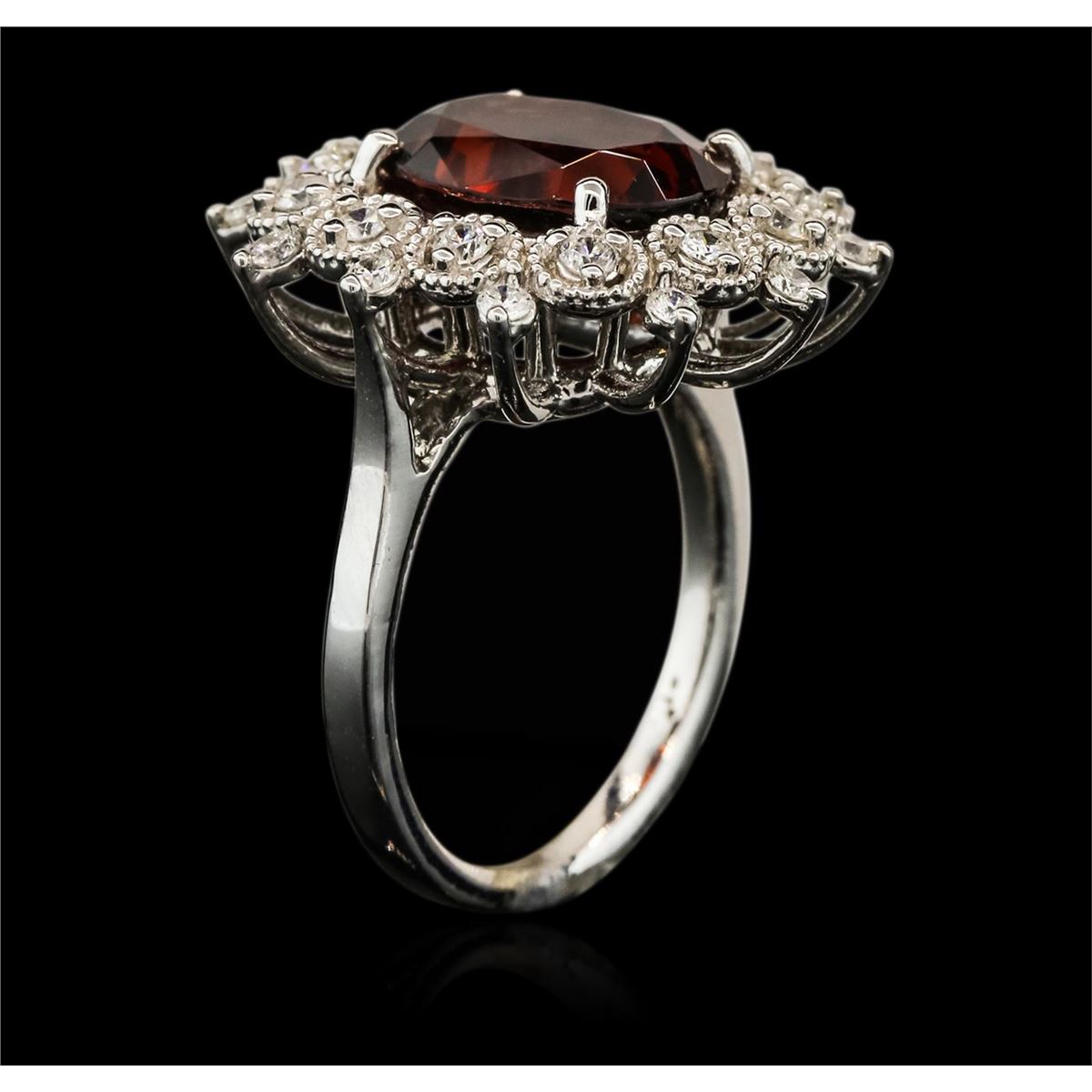 One electronically tested 14KT white gold ladies cast spessartite garnet and diamond ring. The featured spessartite garnet is set within a stylized diamond floret bezel, completed by a two millimeter wide band. Bright polish finish with milgrain detailing. Identified with markings of "14K". Condition is new, good workmanship. Containing: One prong set oval mixed cut natural spessartite garnet, measuring 12.50 x 9.20 x 5.45mm, approximate weight of 5.43ct., clarity is eye clean, type II, dark, very slightly brownish, reddish orange color, (GIA rO 7/3), cut is good. Transmitting light with no distortion, transparent. Colored Stone Grading Report attached. Refractive index testing results of OTL. Graded in the setting. Twenty-Four prong set round brilliant cut diamonds, measuring 1.90 - 1.80 x 1.11mm (depth est.) approximate total weight of 24 Stones = 0.65ct. Graded in the setting. Clarity: SI-1 to I-1. Color: G - I. Total Weight of Colored Stones 5.43ct. Total Weight of Diamonds 0.65ct. Total Weight of Ring 8.17 grams. AIG Appraised at $7,990.00.