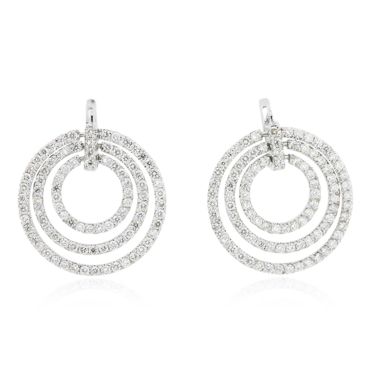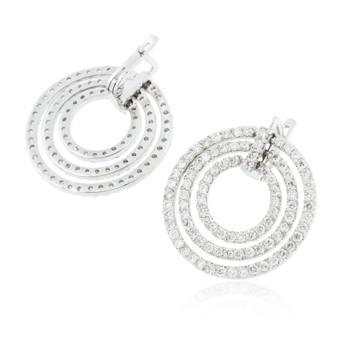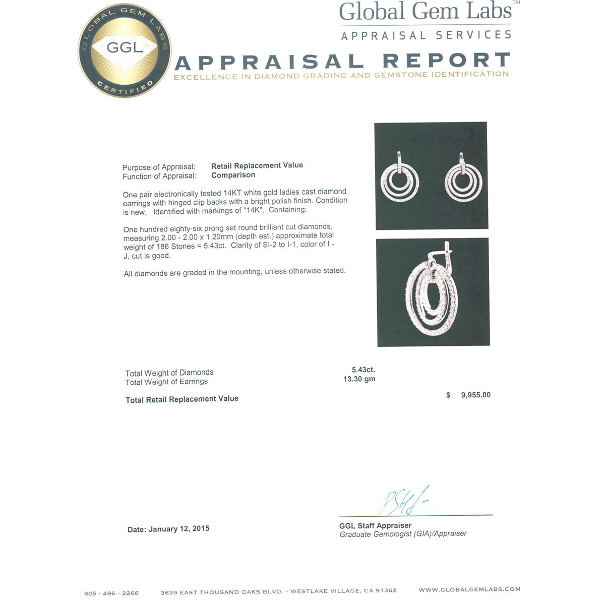 One pair electronically tested 14KT white gold ladies cast diamond earrings with hinged clip backs with a bright polish finish. Identified with markings of "14K". Condition is new. Containing: One Hundred Eighty-Six prong set round brilliant cut diamonds, measuring 2.00 - 2.00 x 1.20mm (depth est.) approximate total weight of 186 Stones = 5.43ct. Clarity: SI-2 to I-1. Color: I - J, Cut is Good. All diamonds are graded in the mounting, unless otherwise stated. Total Weight of Diamonds 5.43ct. Total Weight of Earrings 13.30 grams. GGL Appraised at $9,955.00.