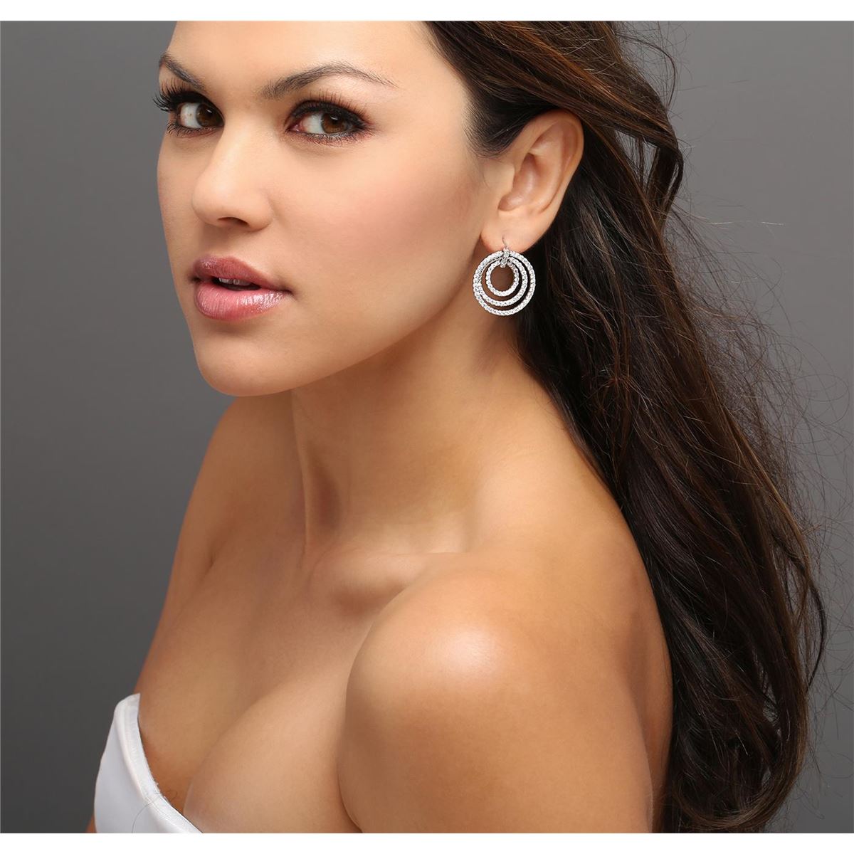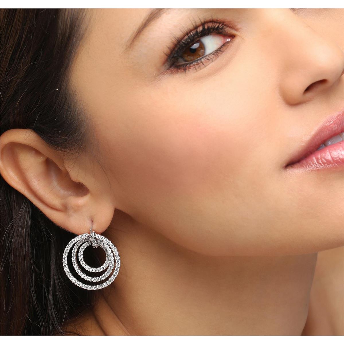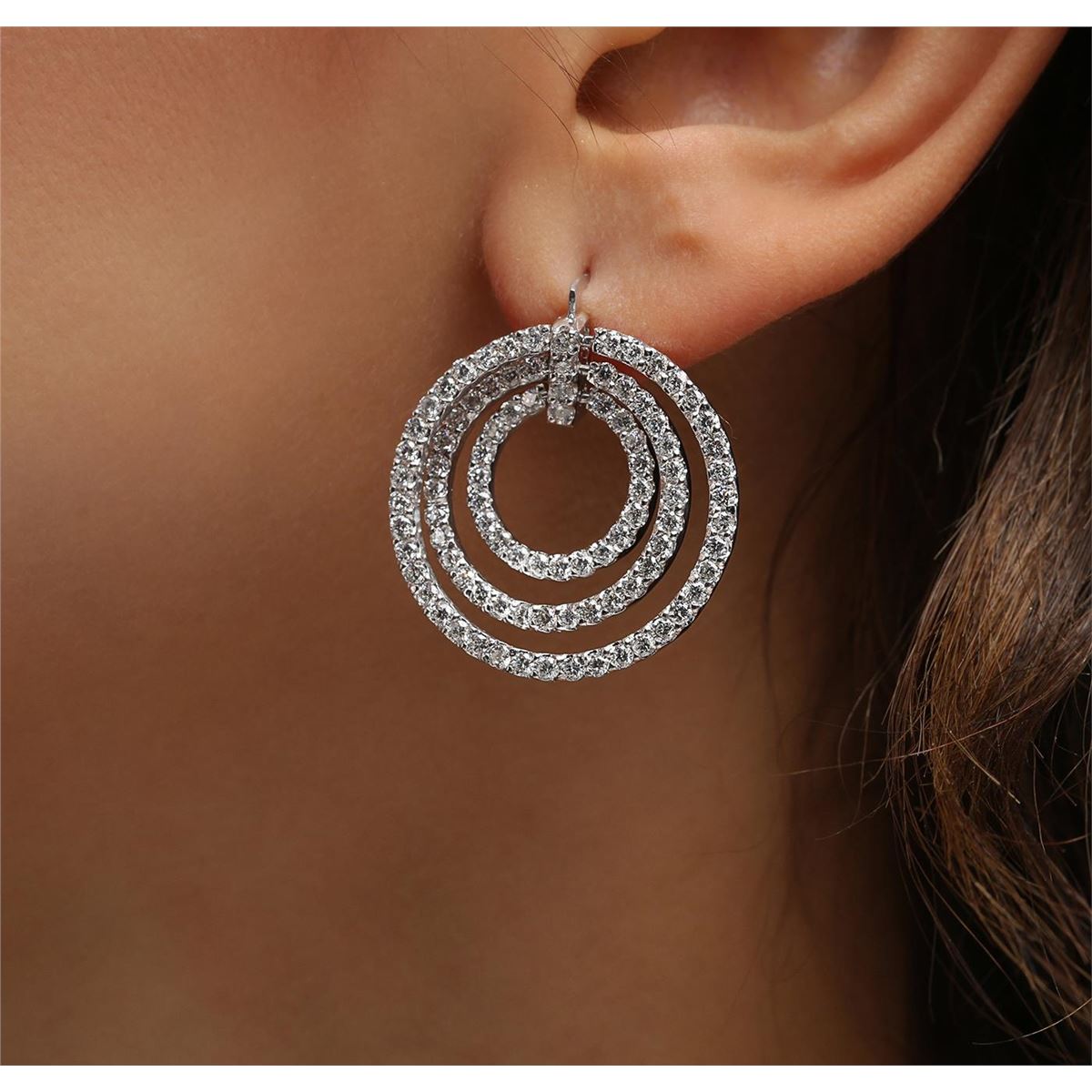 One pair electronically tested 14KT white gold ladies cast diamond earrings with hinged clip backs with a bright polish finish. Identified with markings of "14K". Condition is new. Containing: One Hundred Eighty-Six prong set round brilliant cut diamonds, measuring 2.00 - 2.00 x 1.20mm (depth est.) approximate total weight of 186 Stones = 5.43ct. Clarity: SI-2 to I-1. Color: I - J, Cut is Good. All diamonds are graded in the mounting, unless otherwise stated. Total Weight of Diamonds 5.43ct. Total Weight of Earrings 13.30 grams. GGL Appraised at $9,955.00.
